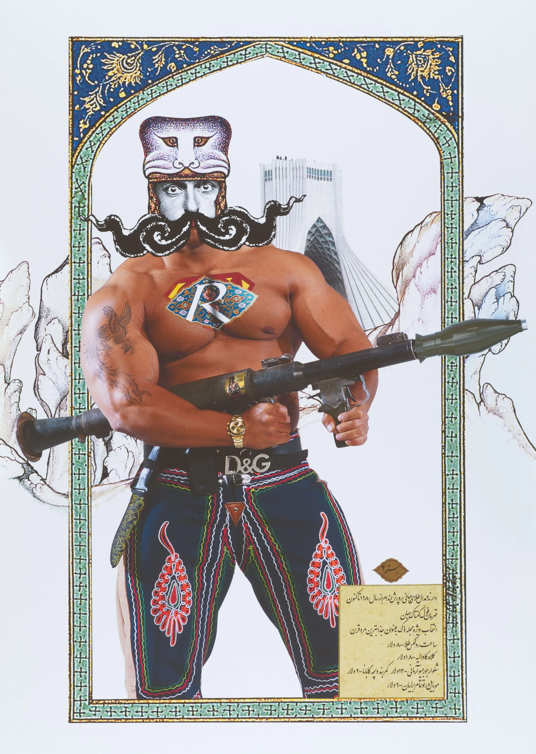 Rostam is the greatest warrior of the Iranian national epic—the Shahnama, or Book of Kings—completed in the early eleventh century but still read and admired even today. A new, contemporary version of the mighty paladin is represented in this print. Known as Rostam II, he has been recast as a bazooka-toting, bare-chested bodybuilder. Encircling his waist is a Dolce and Gabbana belt, from which hangs a mobile phone, and around his wrist is a Rolex watch; the letter R is displayed on his chest, covering an insignia reminiscent of the Superman logo. Only the masklike drawing of Rostam’s face, which includes his characteristic leopard-headed helmet, is a bow to past depictions of the legendary champion.