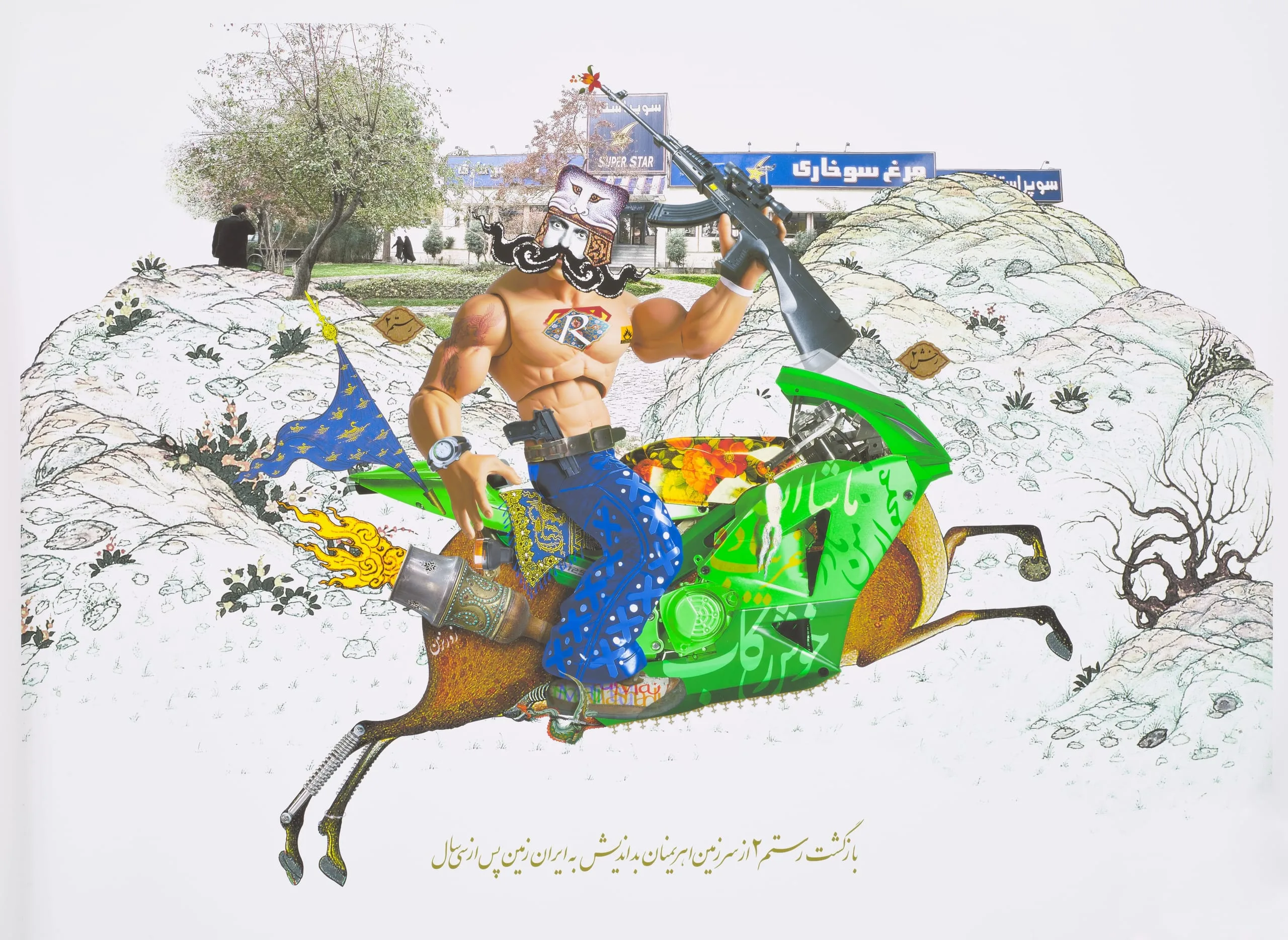 In his ingenious mixed-media series "Rostam 2 – Return," the Iranian artist Siamak Filizadeh transports the mythical Persian hero Rostam into the context of the present day. Riding a souped-up hybrid vehicle—half horse, half motorcycle—Rostam 2 performs his deeds of valor against the backdrop of twenty-first-century Tehran. Filizadeh has cleverly and seamlessly refashioned this ancient account, enacted across four generations and set amidst tragedy, romance, and heroism, in much the same manner as director Baz Luhrmann modernized Shakespeare’s Romeo and Juliet in the 1996 film version. But in his retelling of this classic Persian tale from the Shahnameh or Book of Kings, the Iranian national epic, Filizadeh bypasses its universalities in favor of more specific social commentary. As with other literary masterpieces, the Shahnameh has an appeal and an elasticity that has allowed successive generations to discover or invent new meanings.