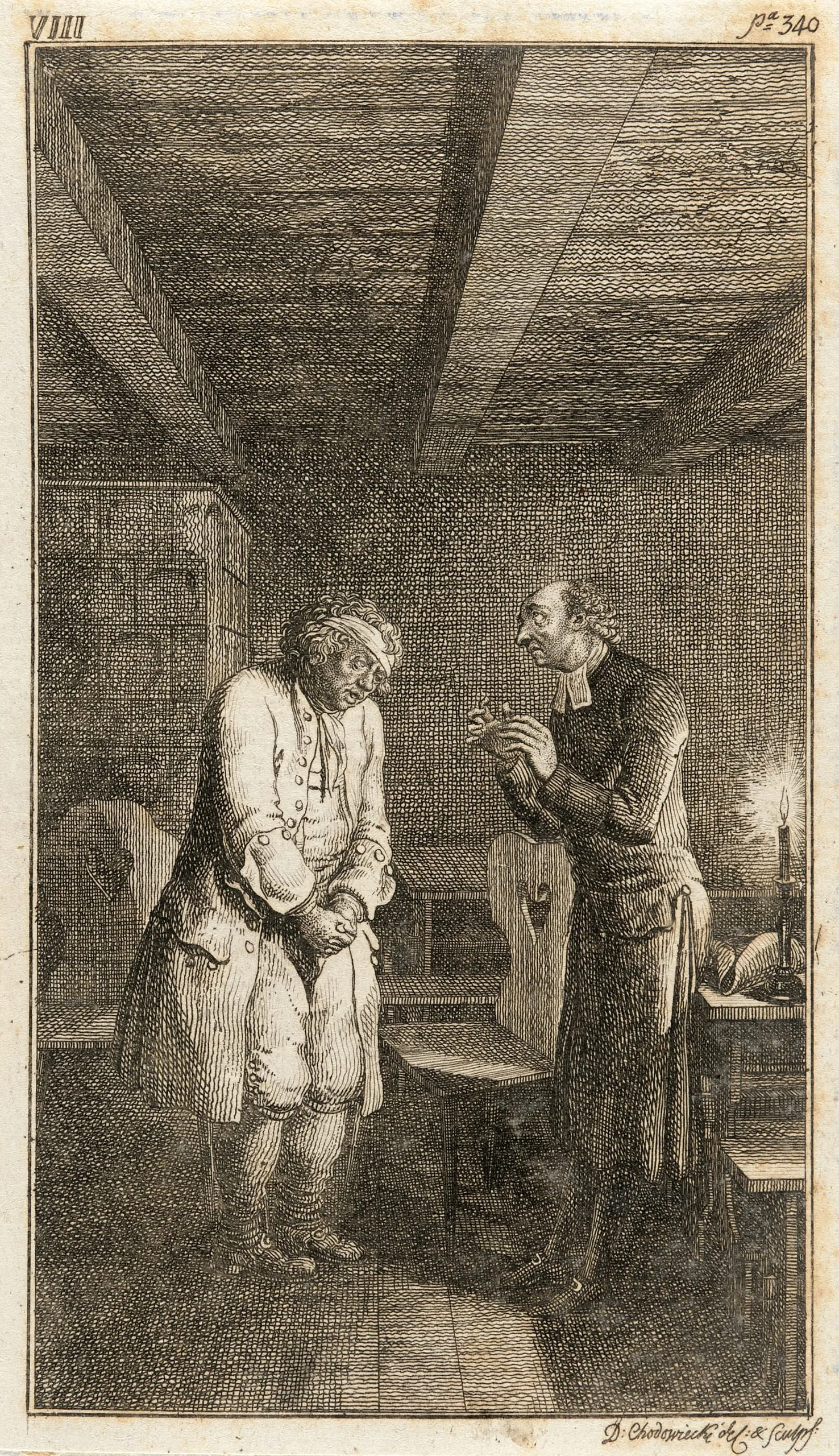 Engraving of two men in a low-ceilinged interior, one heavyset with a bandaged head and clasped hands, the other thin and robed, holding a small object toward the first man's face; candlelight at right