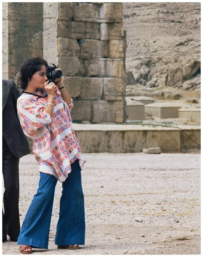The pair traveled to the main tourist sites: ancient Persepolis, where the Tent City erected in 1971 for the 2,500 year celebration of the Persian Empire was still standing; Shiraz, home of poetry and wine; and Isfahan, renowned for its beautiful tile-clad buildings. Grouped in narrative fashion, the images depict people and places with the actress as tourist, but one so iconic that she is never anonymous even wrapped in a chador. In the Isfahan bazaar, Taylor was attracted to and purchased a traditional tribal outfit. Dressed in this colorful costume and in full make-up, the film star posed as an Oriental odalisque, an especially suitable persona for one who was herself a male fantasy. Though Zahedi took many photographs of Taylor in the years following their Iran trip, none are as personal, candid, or creative as these unique images.