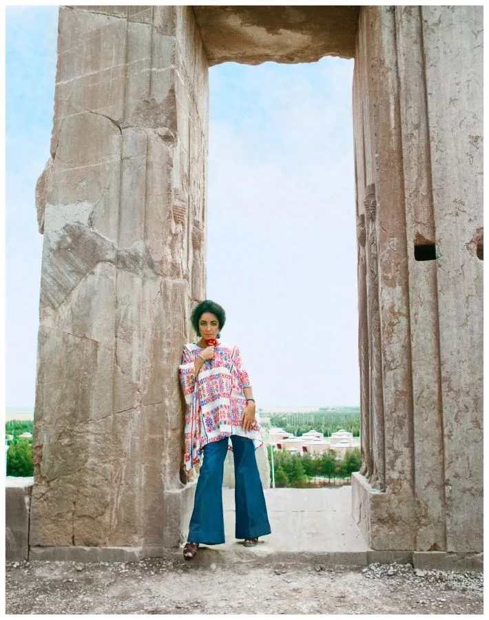 The pair traveled to the main tourist sites: ancient Persepolis, where the Tent City erected in 1971 for the 2,500 year celebration of the Persian Empire was still standing; Shiraz, home of poetry and wine; and Isfahan, renowned for its beautiful tile-clad buildings. Grouped in narrative fashion, the images depict people and places with the actress as tourist, but one so iconic that she is never anonymous even wrapped in a chador. In the Isfahan bazaar, Taylor was attracted to and purchased a traditional tribal outfit. Dressed in this colorful costume and in full make-up, the film star posed as an Oriental odalisque, an especially suitable persona for one who was herself a male fantasy. Though Zahedi took many photographs of Taylor in the years following their Iran trip, none are as personal, candid, or creative as these unique images.