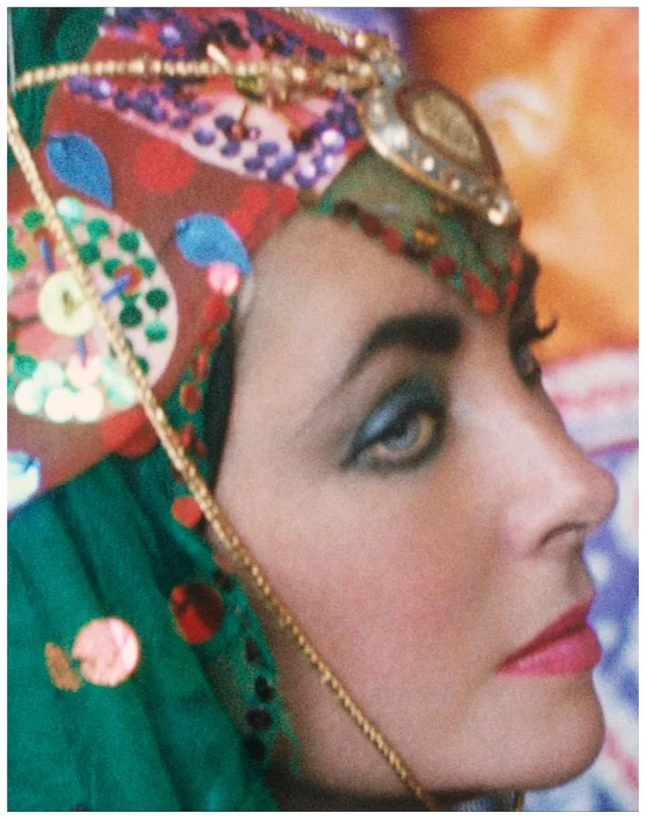 The pair traveled to the main tourist sites: ancient Persepolis, where the Tent City erected in 1971 for the 2,500 year celebration of the Persian Empire was still standing; Shiraz, home of poetry and wine; and Isfahan, renowned for its beautiful tile-clad buildings. Grouped in narrative fashion, the images depict people and places with the actress as tourist, but one so iconic that she is never anonymous even wrapped in a chador. In the Isfahan bazaar, Taylor was attracted to and purchased a traditional tribal outfit. Dressed in this colorful costume and in full make-up, the film star posed as an Oriental odalisque, an especially suitable persona for one who was herself a male fantasy. Though Zahedi took many photographs of Taylor in the years following their Iran trip, none are as personal, candid, or creative as these unique images.
