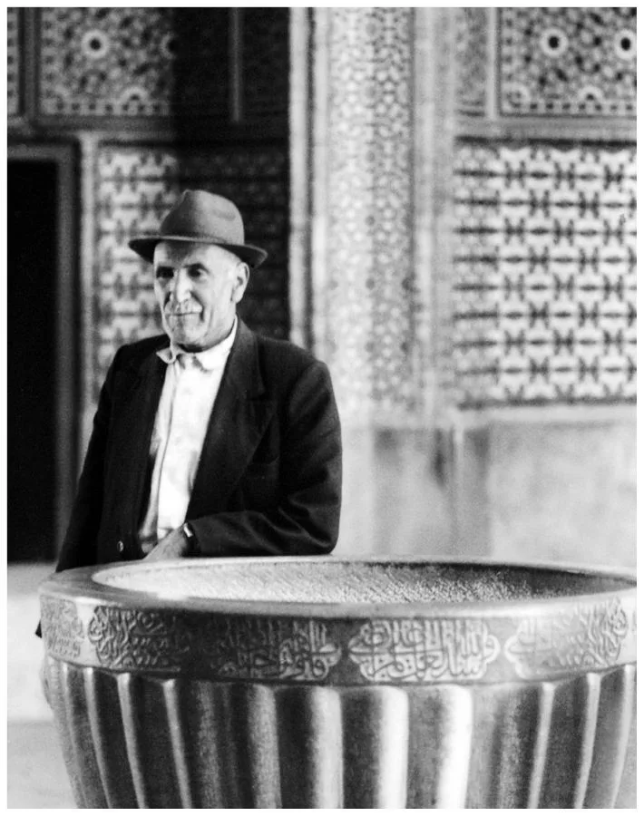 The pair traveled to the main tourist sites: ancient Persepolis, where the Tent City erected in 1971 for the 2,500 year celebration of the Persian Empire was still standing; Shiraz, home of poetry and wine; and Isfahan, renowned for its beautiful tile-clad buildings. Grouped in narrative fashion, the images depict people and places with the actress as tourist, but one so iconic that she is never anonymous even wrapped in a chador. In the Isfahan bazaar, Taylor was attracted to and purchased a traditional tribal outfit. Dressed in this colorful costume and in full make-up, the film star posed as an Oriental odalisque, an especially suitable persona for one who was herself a male fantasy. Though Zahedi took many photographs of Taylor in the years following their Iran trip, none are as personal, candid, or creative as these unique images.