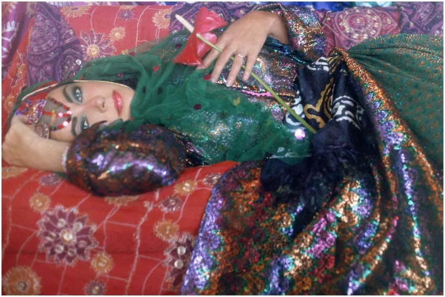 The pair traveled to the main tourist sites: ancient Persepolis, where the Tent City erected in 1971 for the 2,500 year celebration of the Persian Empire was still standing; Shiraz, home of poetry and wine; and Isfahan, renowned for its beautiful tile-clad buildings. Grouped in narrative fashion, the images depict people and places with the actress as tourist, but one so iconic that she is never anonymous even wrapped in a chador. In the Isfahan bazaar, Taylor was attracted to and purchased a traditional tribal outfit. Dressed in this colorful costume and in full make-up, the film star posed as an Oriental odalisque, an especially suitable persona for one who was herself a male fantasy. Though Zahedi took many photographs of Taylor in the years following their Iran trip, none are as personal, candid, or creative as these unique images.