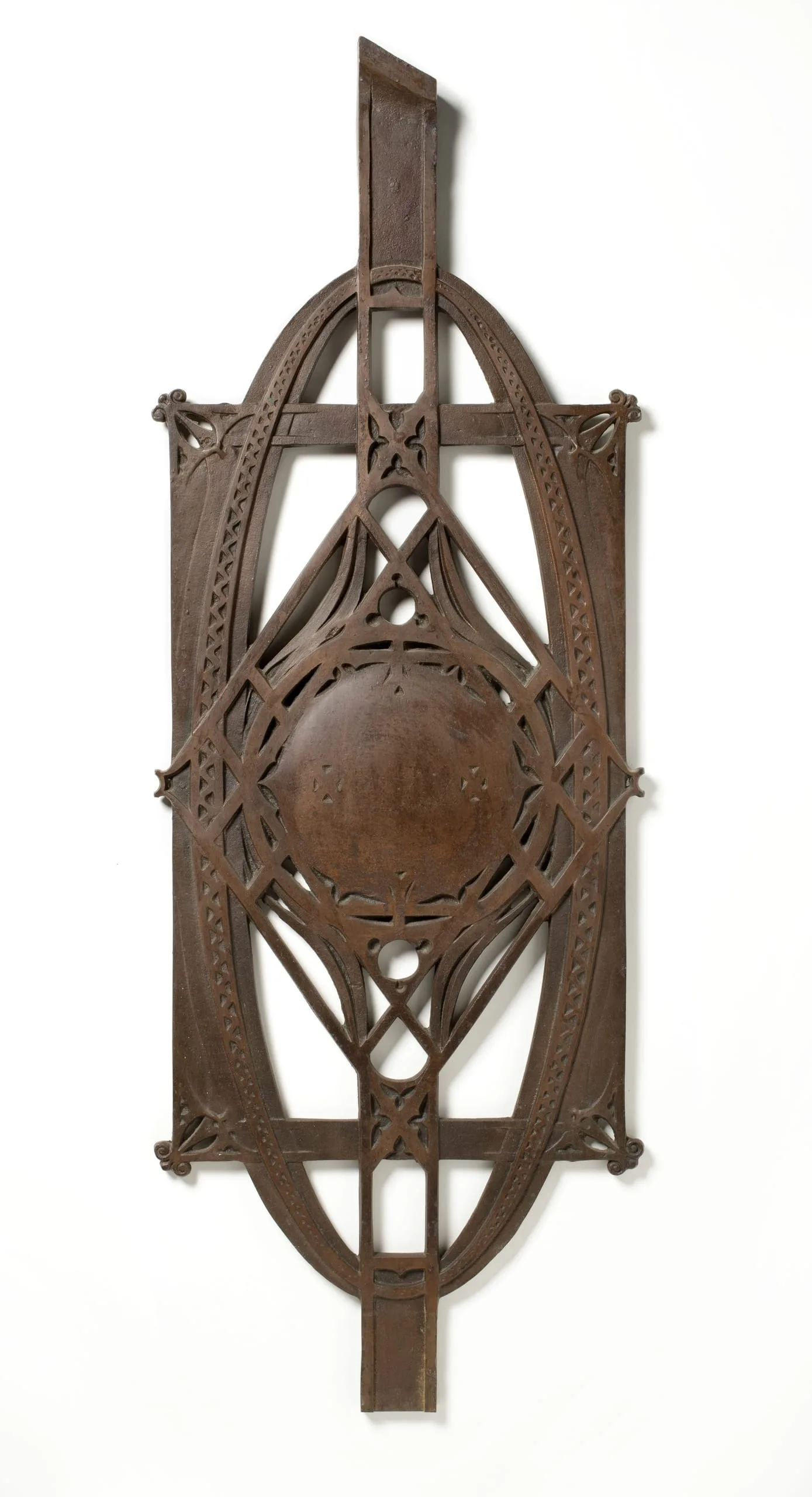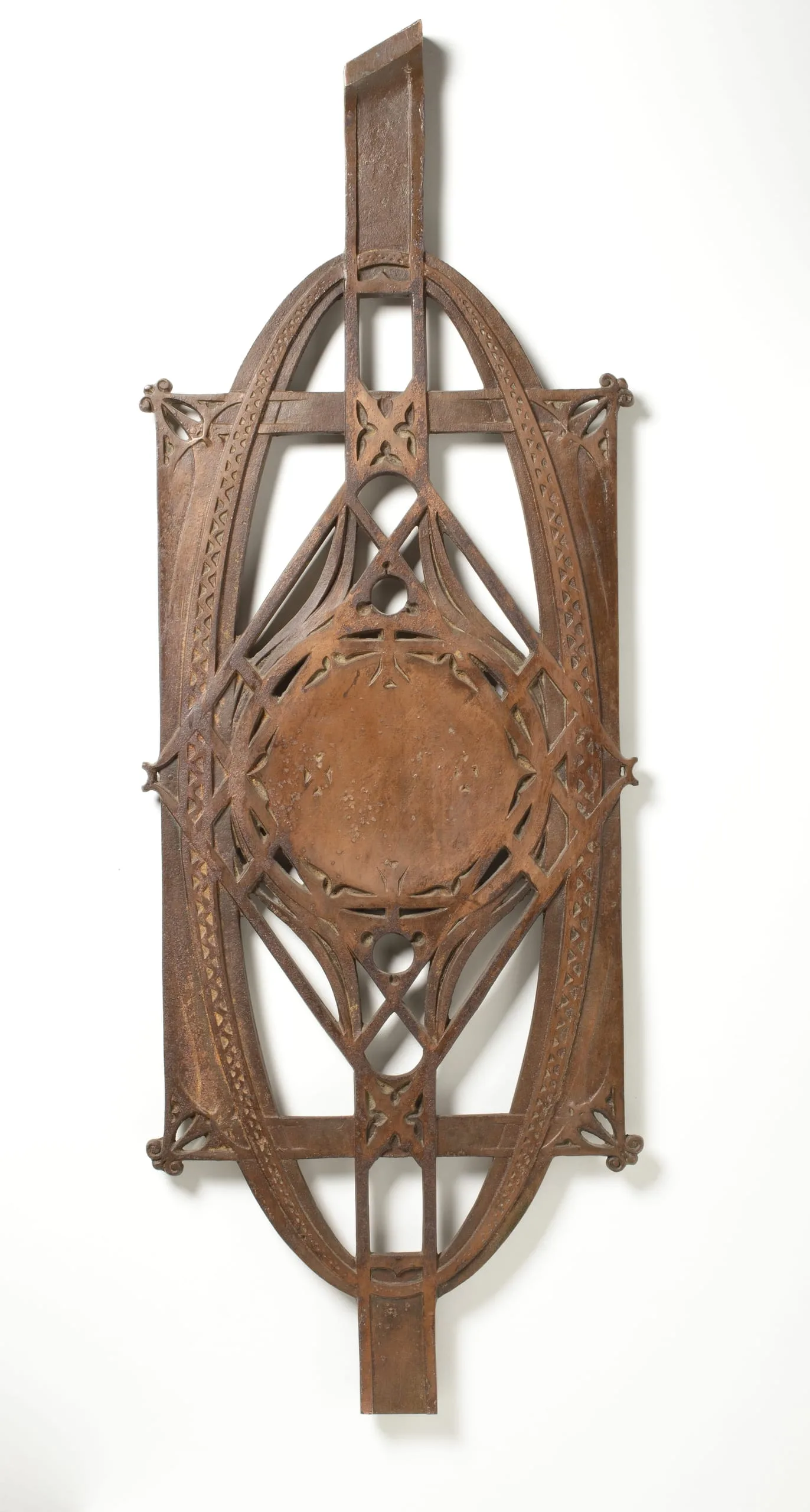 Sullivan strongly believed in the integration of architecture and ornament, writing in 1892: “It must be manifest that an ornamental design will be more beautiful if it seems a part of the surface or substance that receives it than if it looks ‘stuck on,’ so to speak.” (1) Like many adherents of the Arts and Crafts movement, Sullivan often unified the decorative program by repeating a single motif or group of motifs in many different elements of a building. The design on the baluster, consisting of a concentric circle, diamond, oval, and rectangle, with surfaces decorated with geometric and floral motifs, relates closely to the polychrome stenciled walls, the architectural metalwork, and the plaster decoration on the arched entrance of the building.