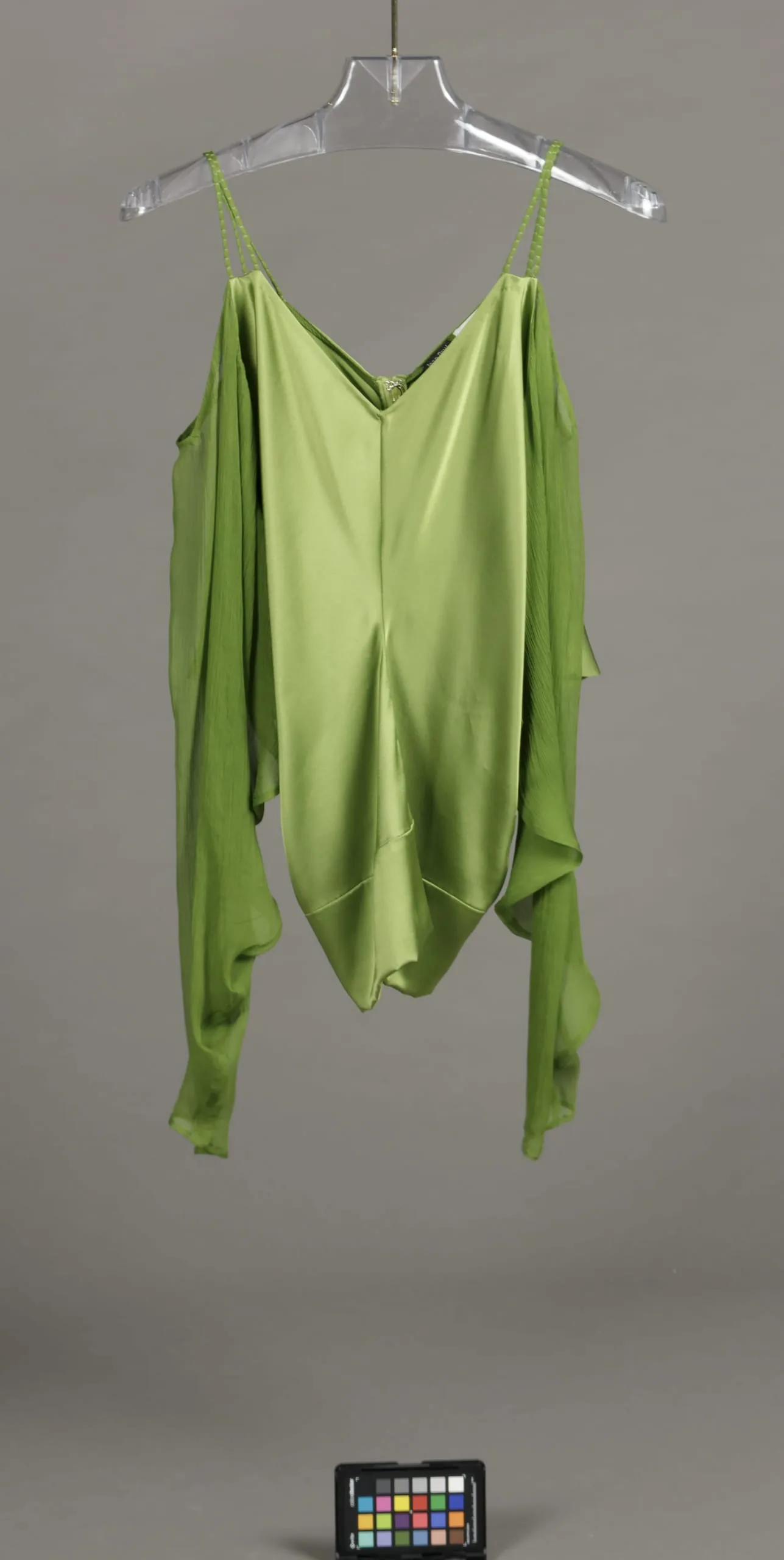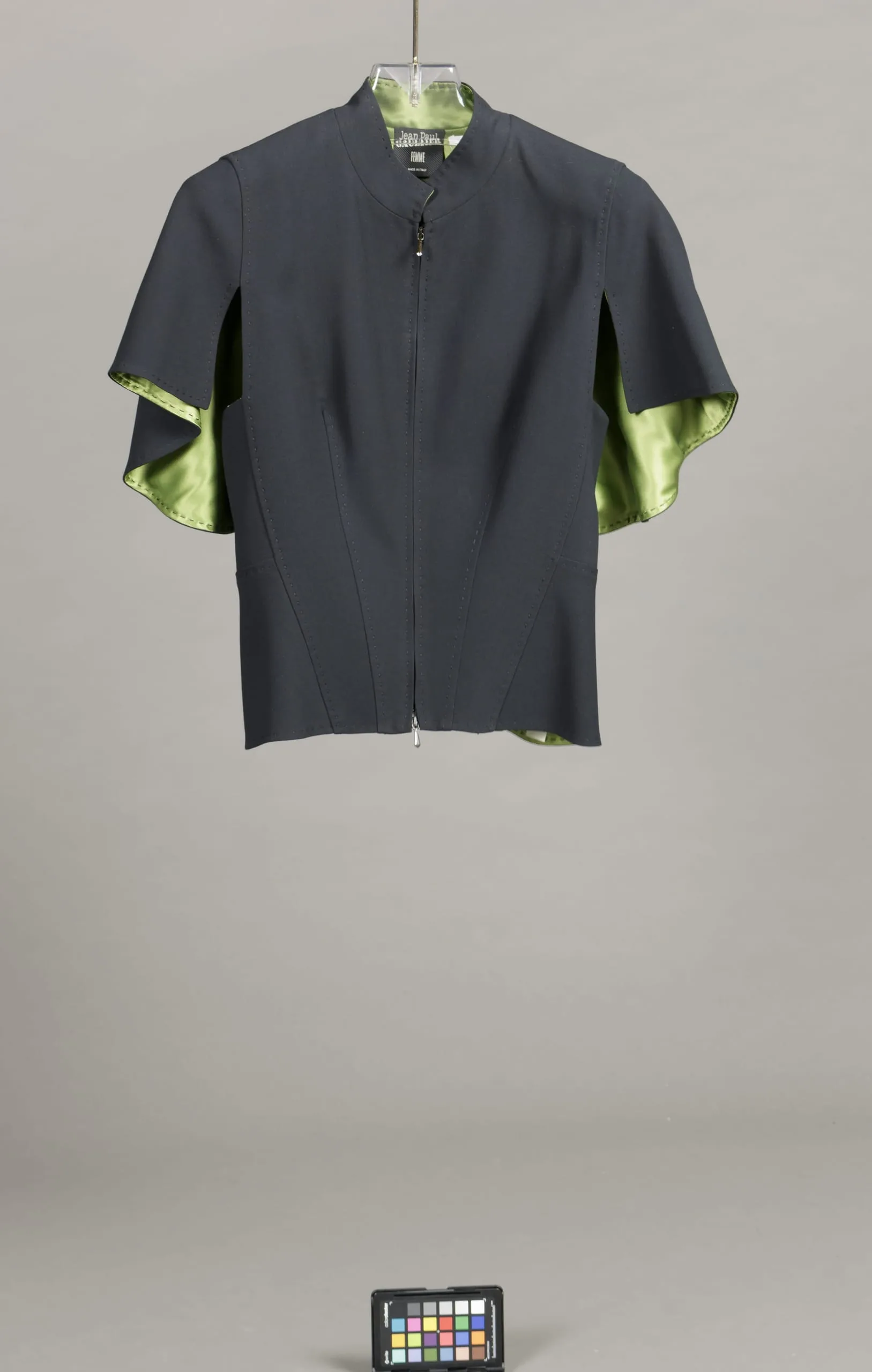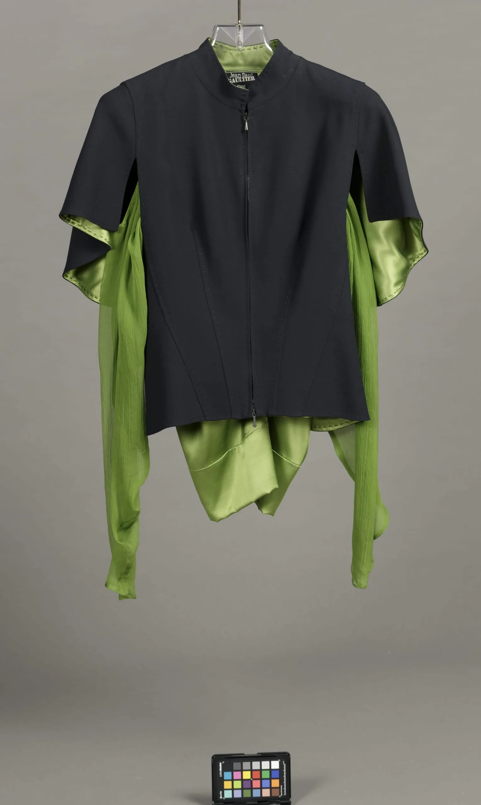 - Jacket: wool and rayon plain weave; Blouse: silk plain weave and silk chiffon