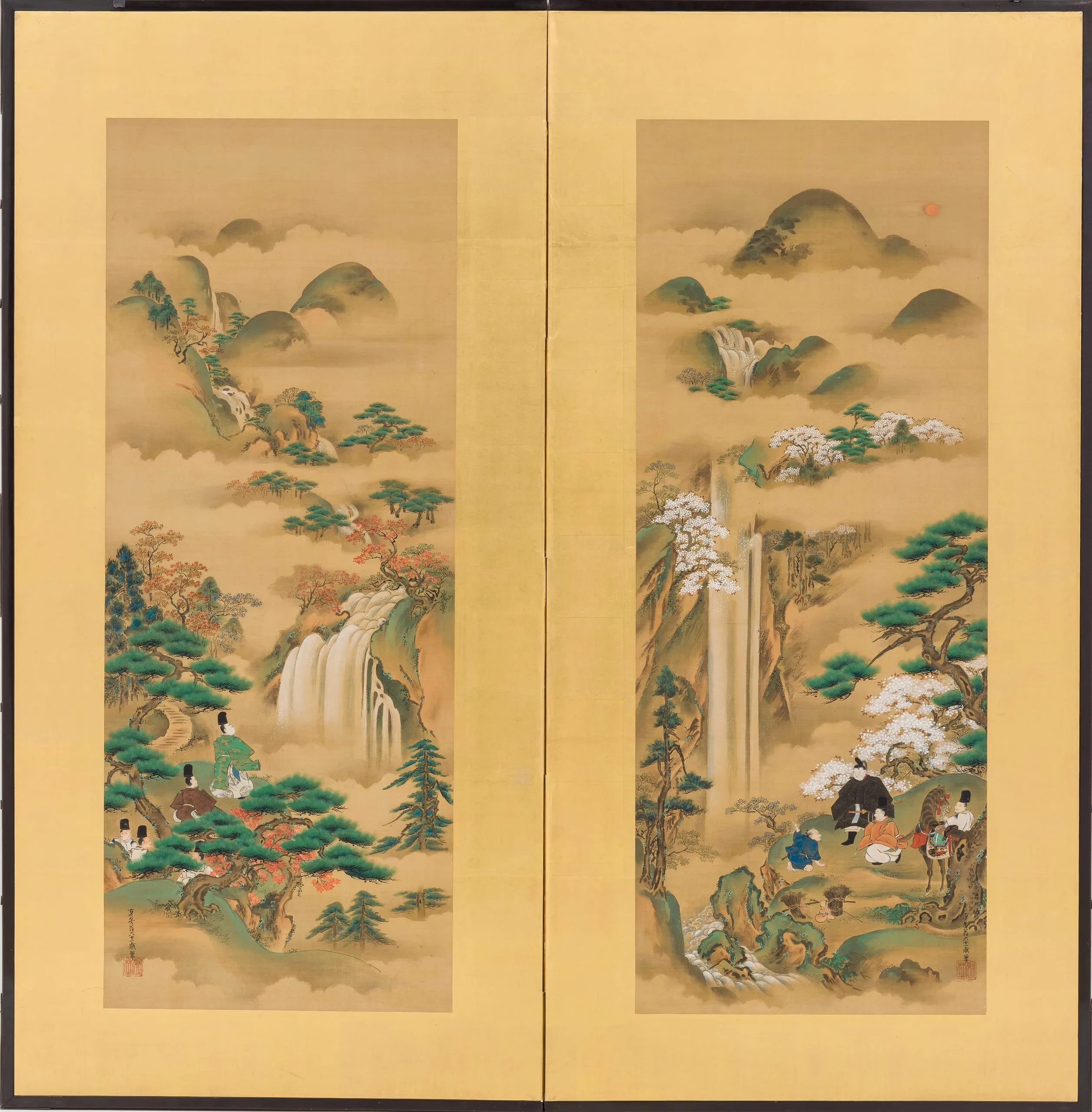 - Two-panel screen; mineral pigments on silk
