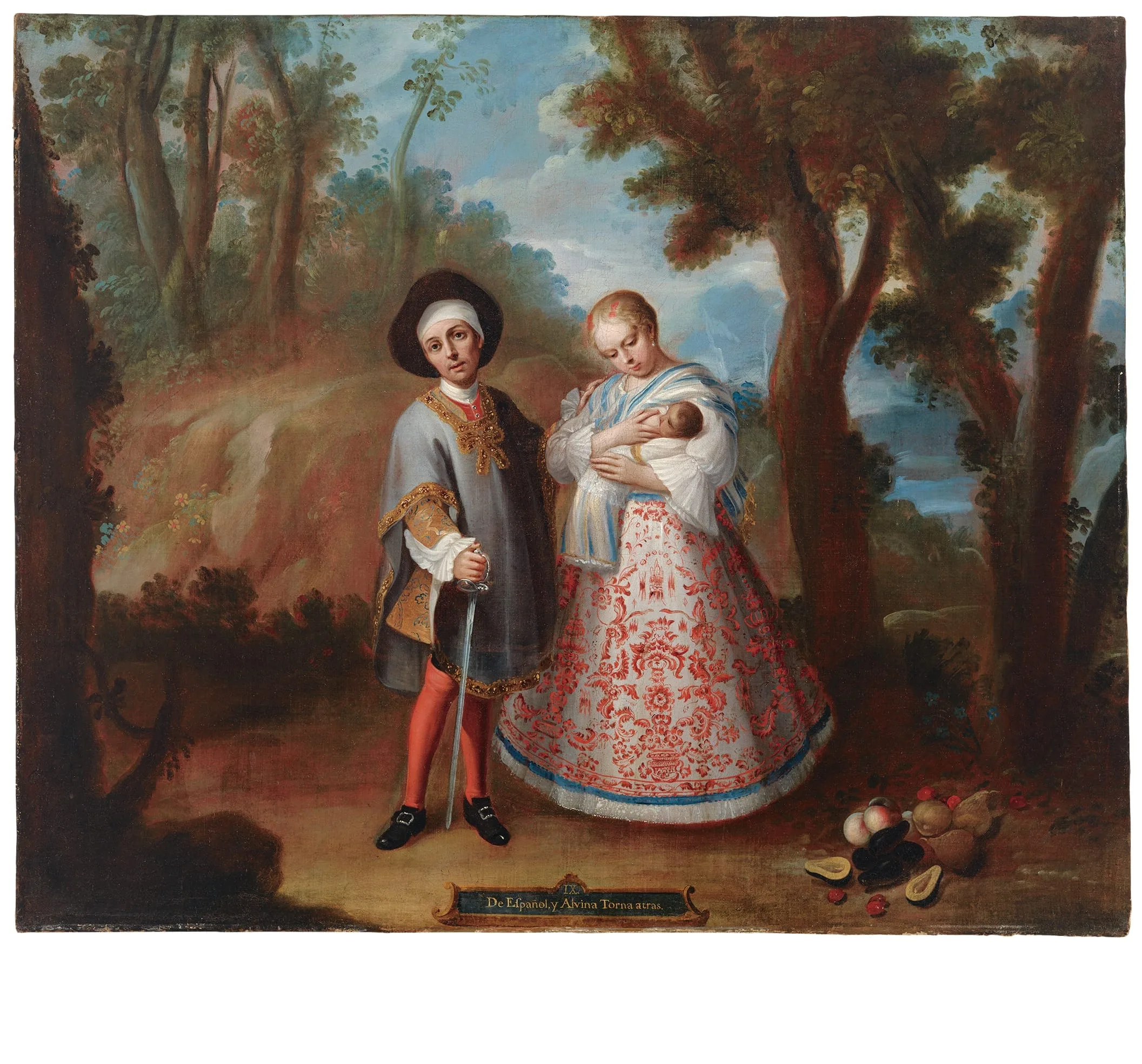 Eighteenth-century Mexico saw the invention of a unique pictorial genre known as castas (caste paintings). Created as sets of multiple images, the works document the process of mestizaje (racial mixing) among Amerindians, Spaniards, and Africans. The story the paintings tell, reinforced by the inscriptions, is that the mixture of Spaniards and Indians gave back “pure” or white Spaniards, while the union of Spaniards and Indians with Africans led to racial degeneration. Paradoxically, the inclusion of local products presented the New World as a place of boundless natural wonder and emphasized the colonists’ pride in the diversity and prosperity of the land—a friction that permeates the genre.