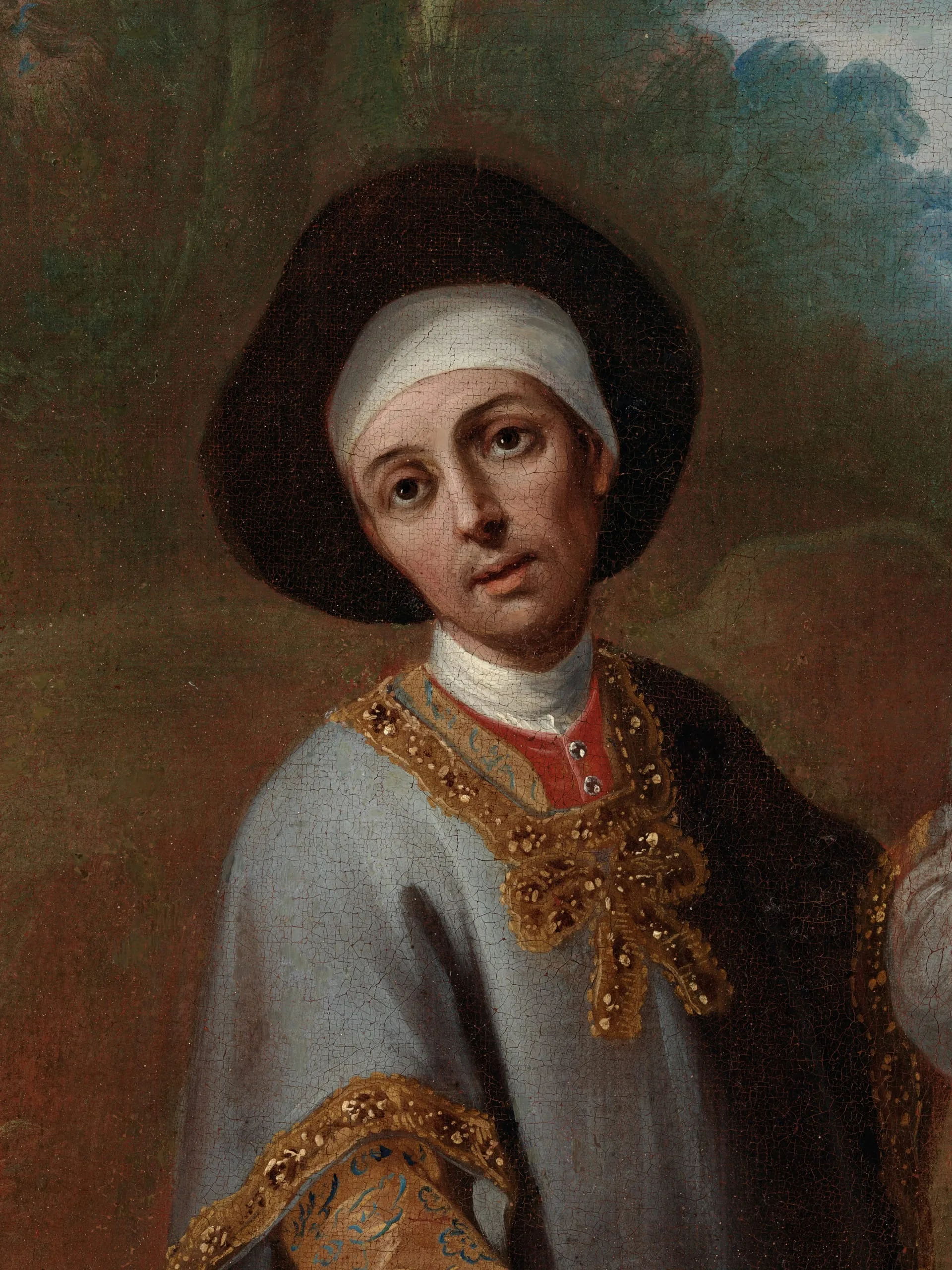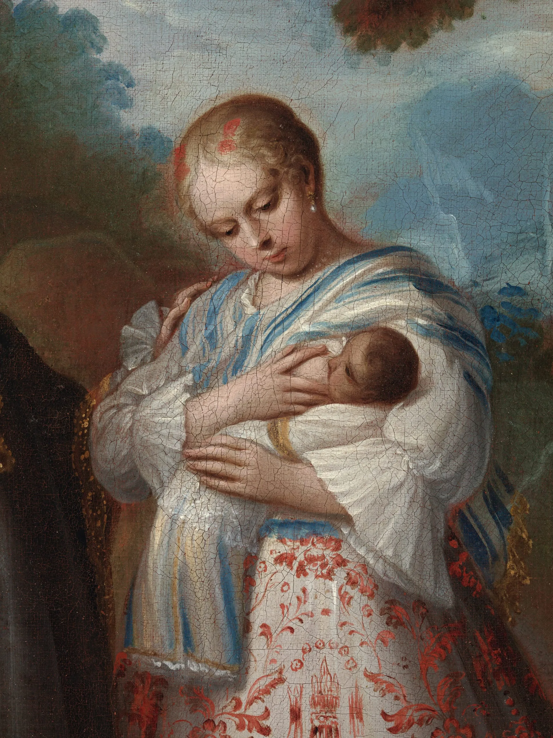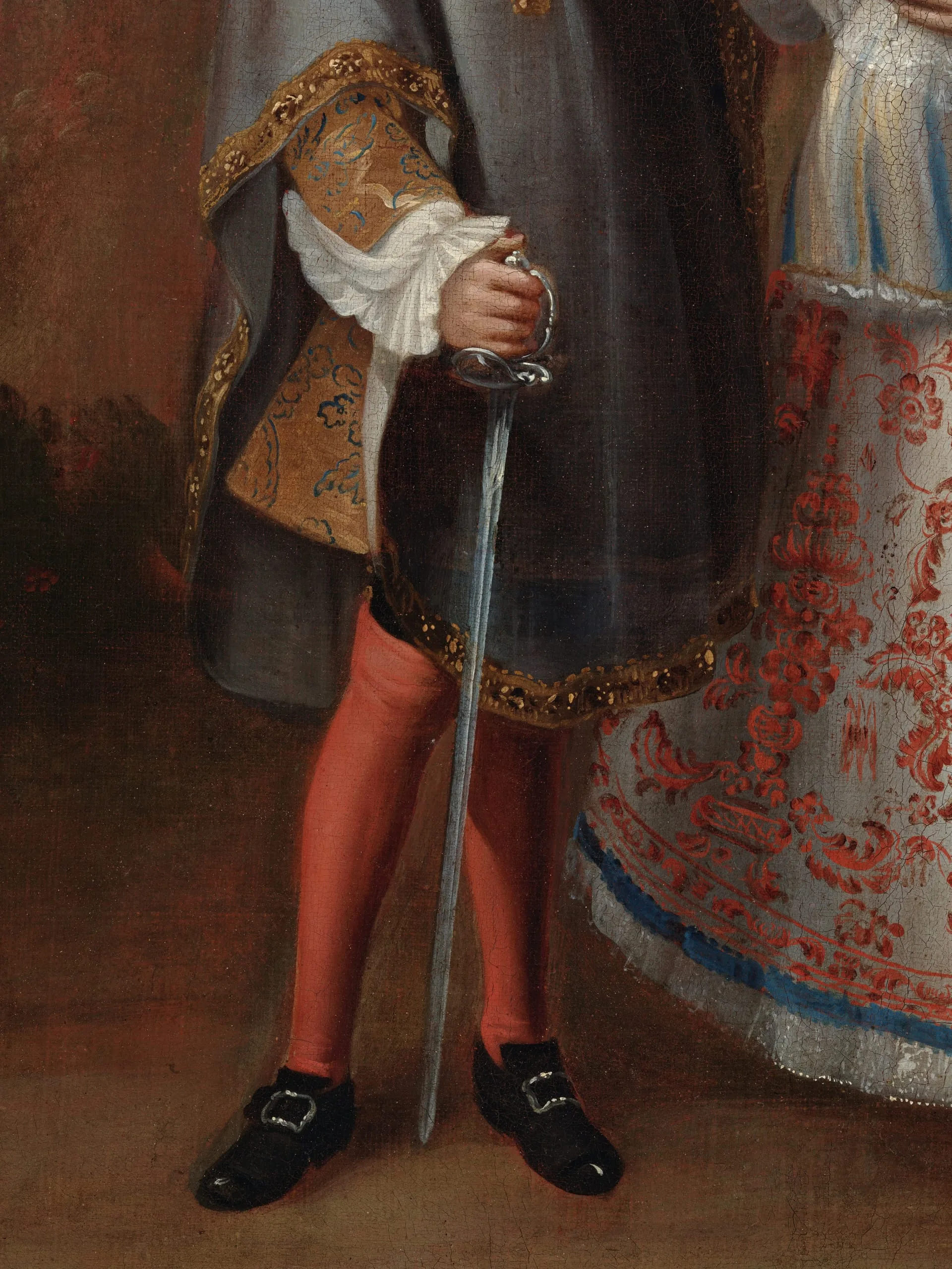 The figures’ dress and occupations reinforce their social standing. Some Spanish men—as in this example—hold a sword—a privilege that in colonial legislation was only reserved for this group. Two works portray women of African descent wearing a distinctive overblouse fastened with gold or silver brooches and colorful ribbons (https://collections.lacma.org/node/222684" > M.2011.20.1 and https://collections.lacma.org/node/222687" > M.2011.20.3). Sumptuary laws banned Black women and their children from wearing Spanish-style clothing. The fashion they developed in response, which recalls the tunics worn by Moorish women in southern Spain, was often singled out by travelers as highly ostentatious.
