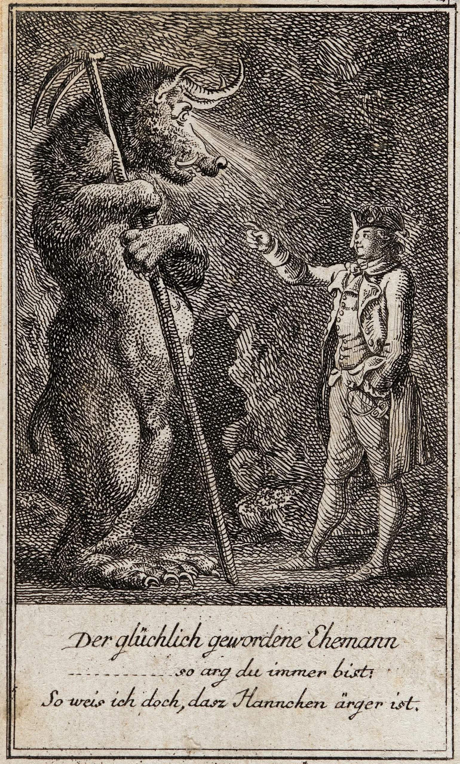 Engraving on cream paper showing a large bull-headed, bear-bodied creature holding a staff confronted by a uniformed man pointing his finger, with German text below