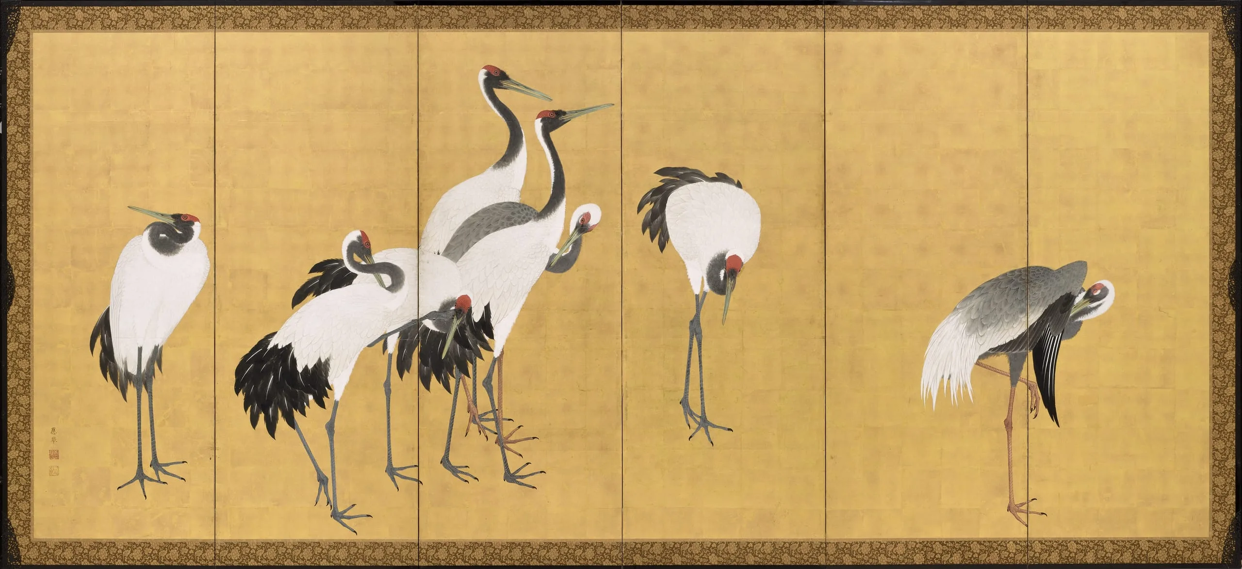 - Pair of six-panel screens; ink, color, and gold leaf on paper
