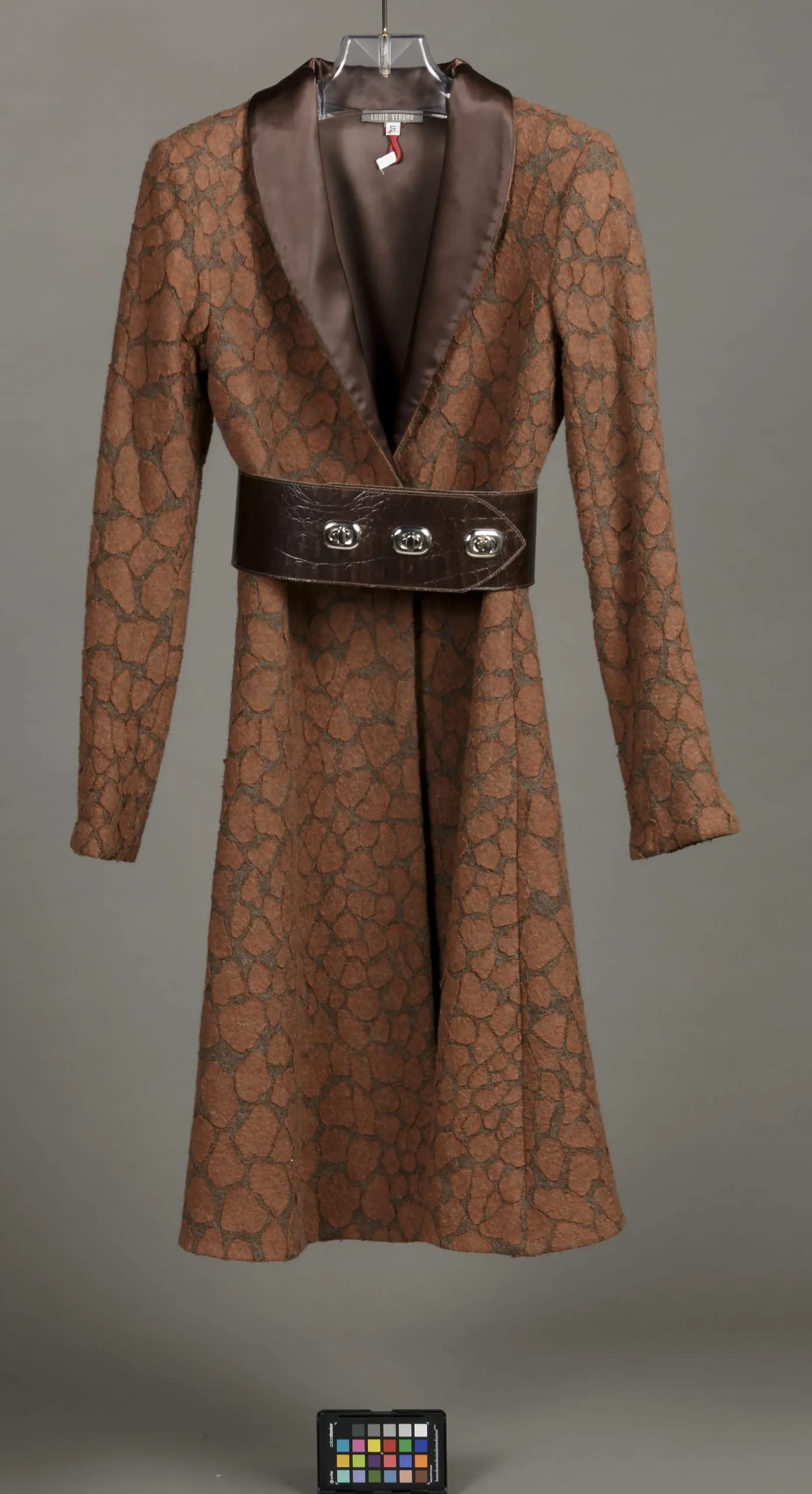 - Jacket: wool and nylon double cloth, rayon plain weave; Belt: leather, embossed, metal