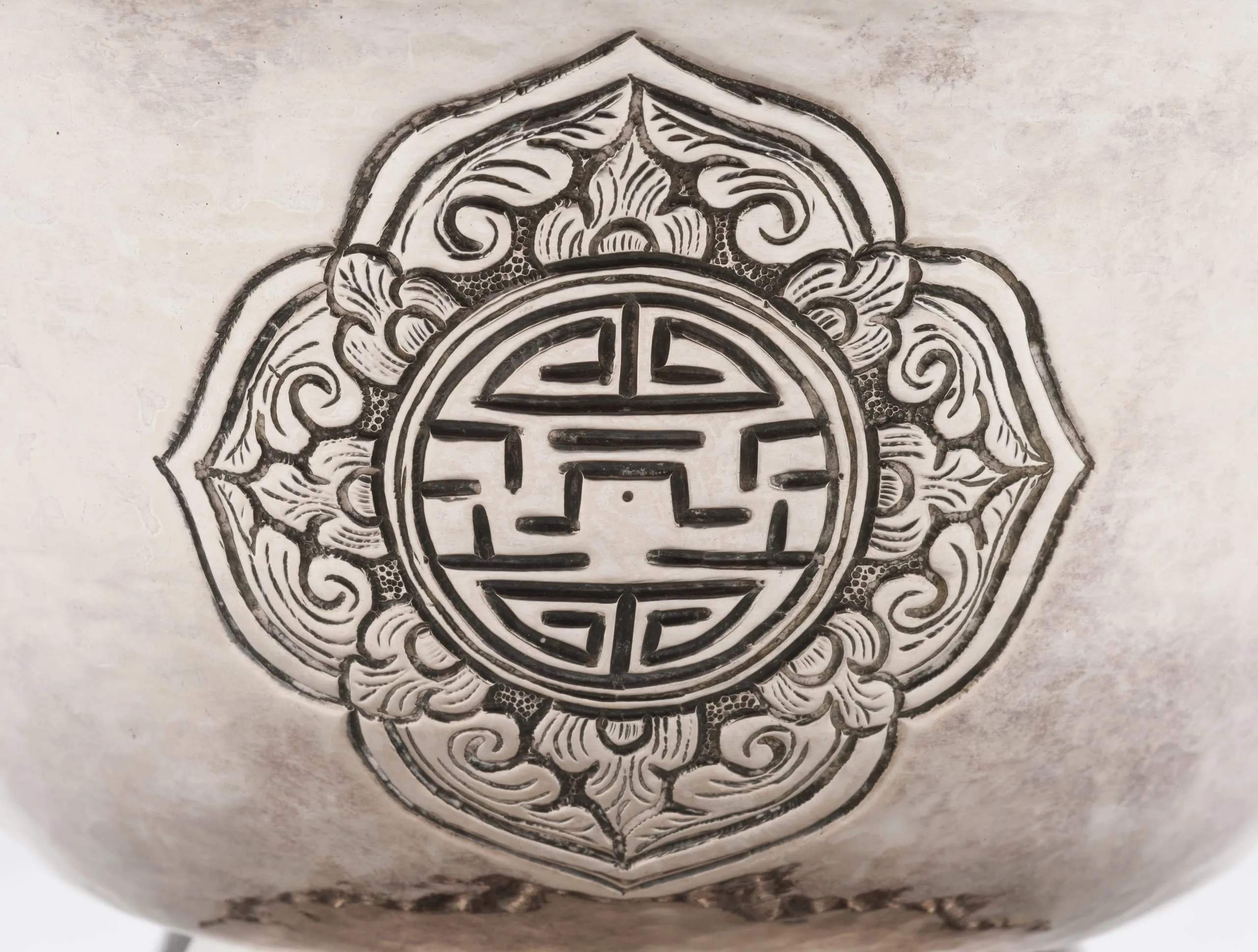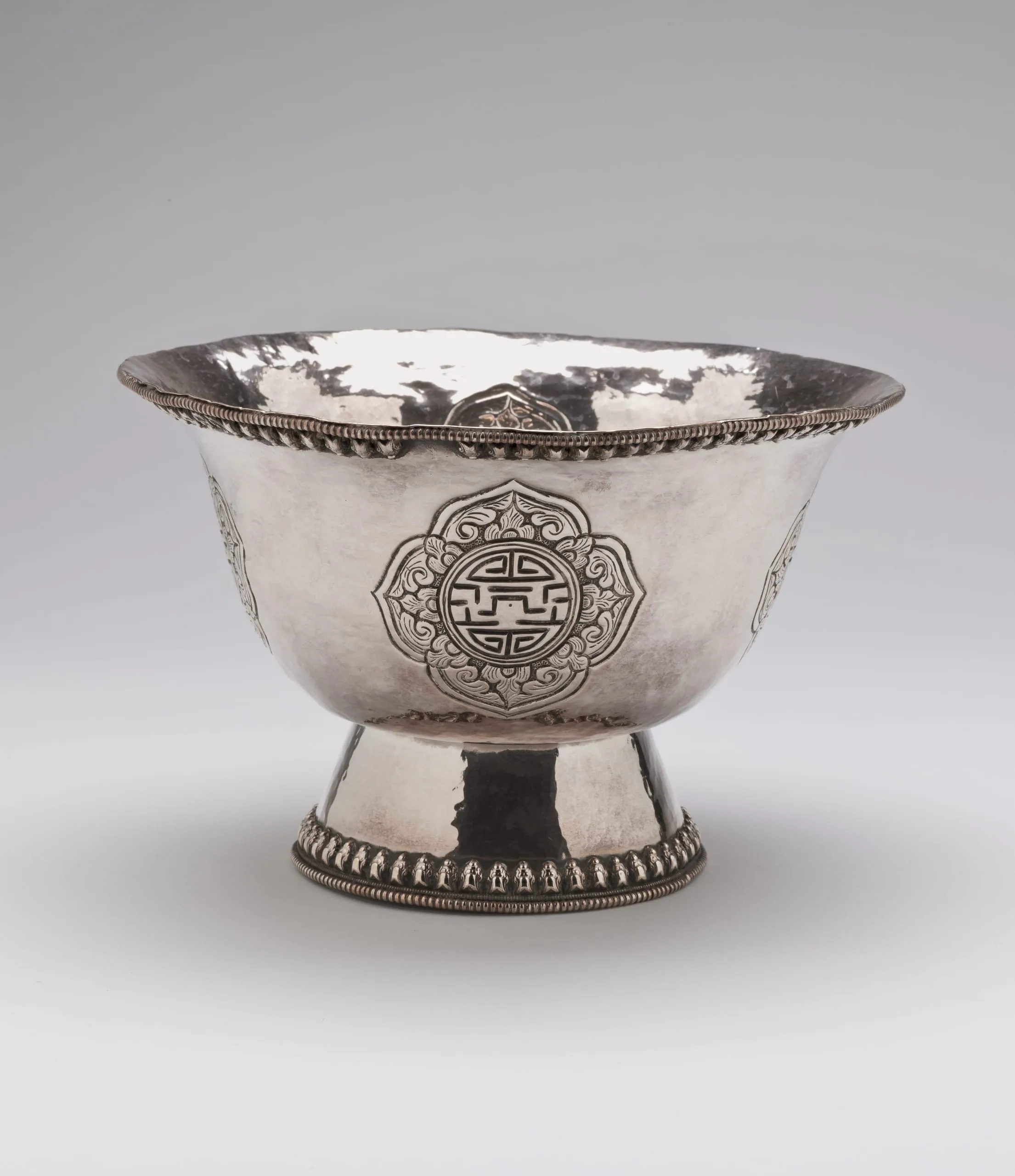 This Offering Bowl for Water, and it’s almost identical set-mate M.2011.157.5, are elegant in their formal simplicity and resplendent appearance. Both bowls are adorned on their opposing side walls with four lobed cartouches in repoussé that contain a rounded representation of the Chinese character shou (longevity). Each character is combined with the auspicious pan-Asian solar motif of a swastika and sauvastika (left-facing swastika) in the 3 o'clock and 9 o'clock positions respectively. The stylized symbols are formed by the negative spaces created within discontinuous boundary markings. Surrounding the central medallion are eight upright acanthus leaves that abut or intersect a perimeter of split acanthus leaves. The bowls are supported by a splayed foot embellished around the base with a band of goddess (?) figures and two basal borders of bead moldings. The same border designs are repeated underneath the flared rim of the bowls.