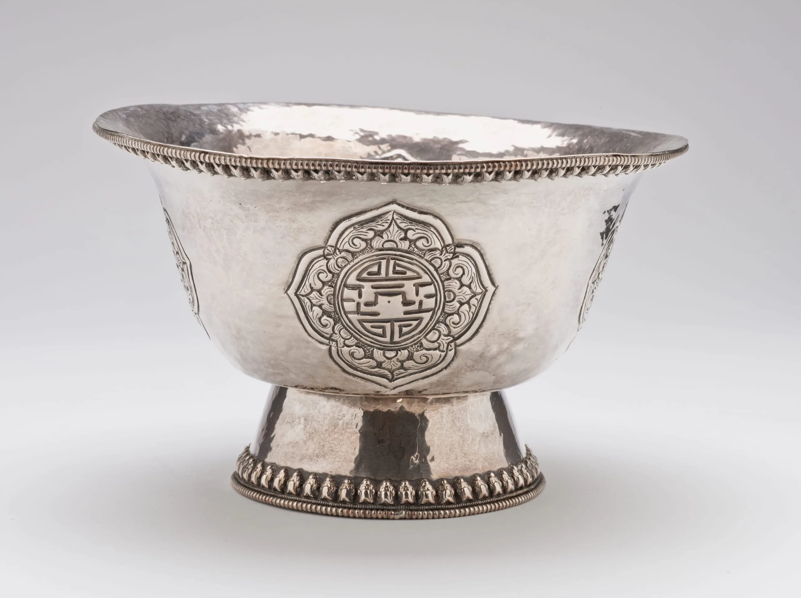 Offering bowls are a quintessential type of Tibetan ritualistic metalware. They are typically used in a set of seven on Tibetan altars and filled with water and other consecrated substances. Offering bowls for water (ting phor) can be made of silver, brass, bronze, ceramic, and, occasionally, gold. Metal offering bowls were often decorated with designs in repoussé or cloisonné enamel.