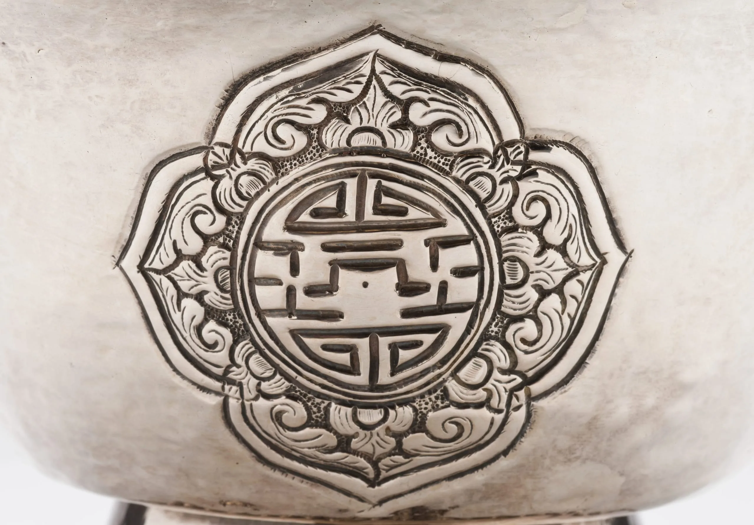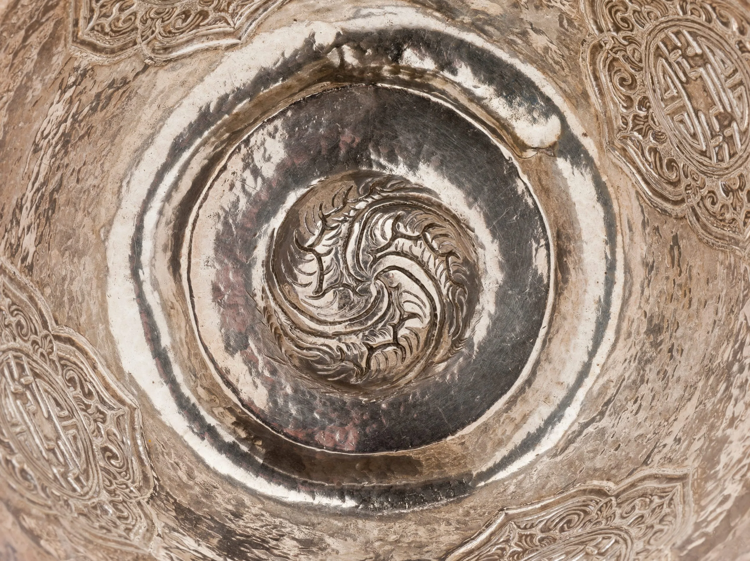 This Offering Bowl for Water, and it’s almost identical set-mate M.2011.157.4, are elegant in their formal simplicity and resplendent appearance. Both bowls are adorned on their opposing side walls with four lobed cartouches in repoussé that contain a rounded representation of the Chinese character shou (longevity). Each character is combined with the auspicious pan-Asian solar motif of a swastika and sauvastika (left-facing swastika) in the 3 o'clock and 9 o'clock positions respectively. The stylized symbols are formed by the negative spaces created within discontinuous boundary markings. Surrounding the central medallion are eight upright acanthus leaves that abut or intersect a perimeter of split acanthus leaves. The bowls are supported by a splayed foot embellished around the base with a band of goddess (?) figures and two basal borders of bead moldings. The same border designs are repeated underneath the flared rim of the bowls.