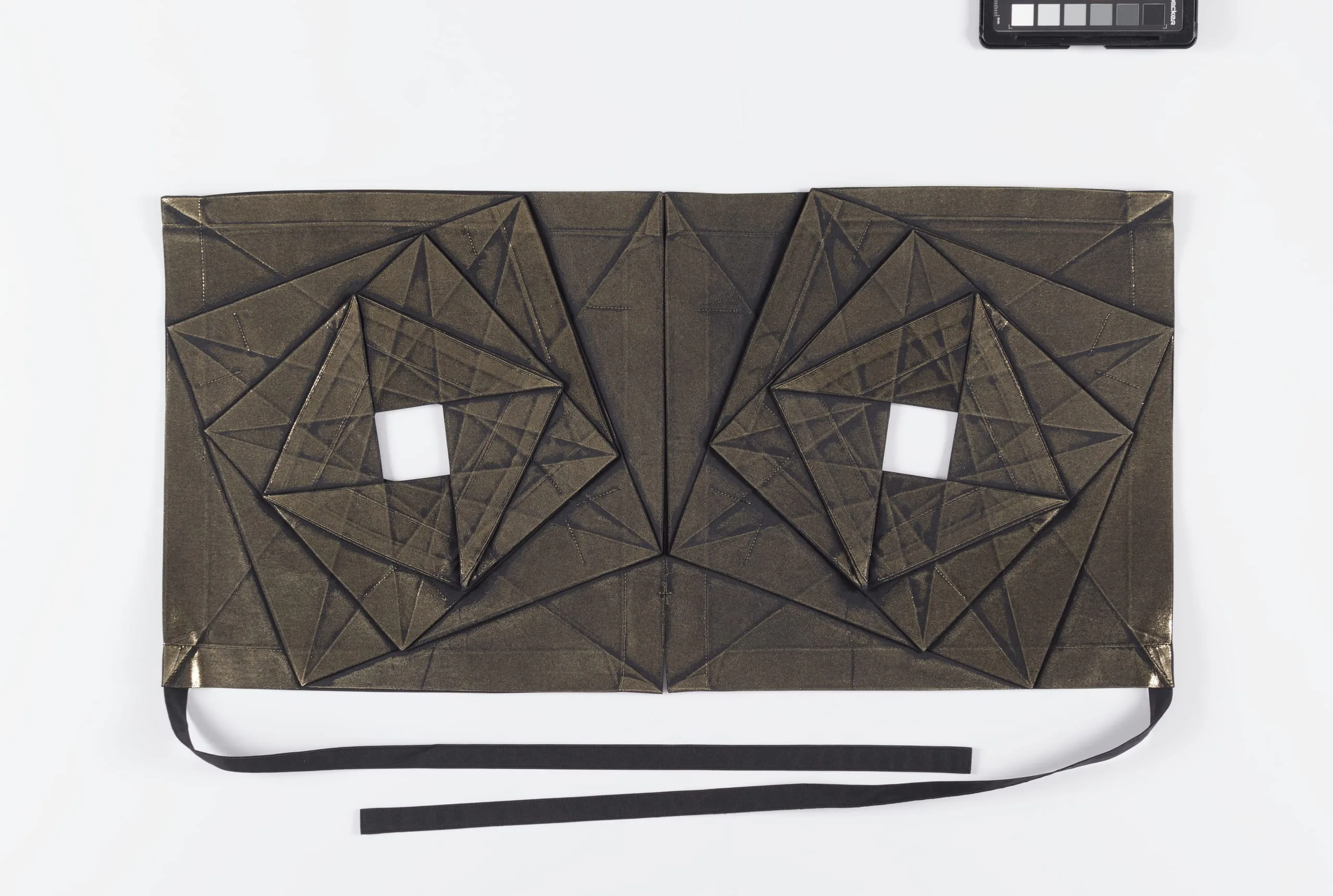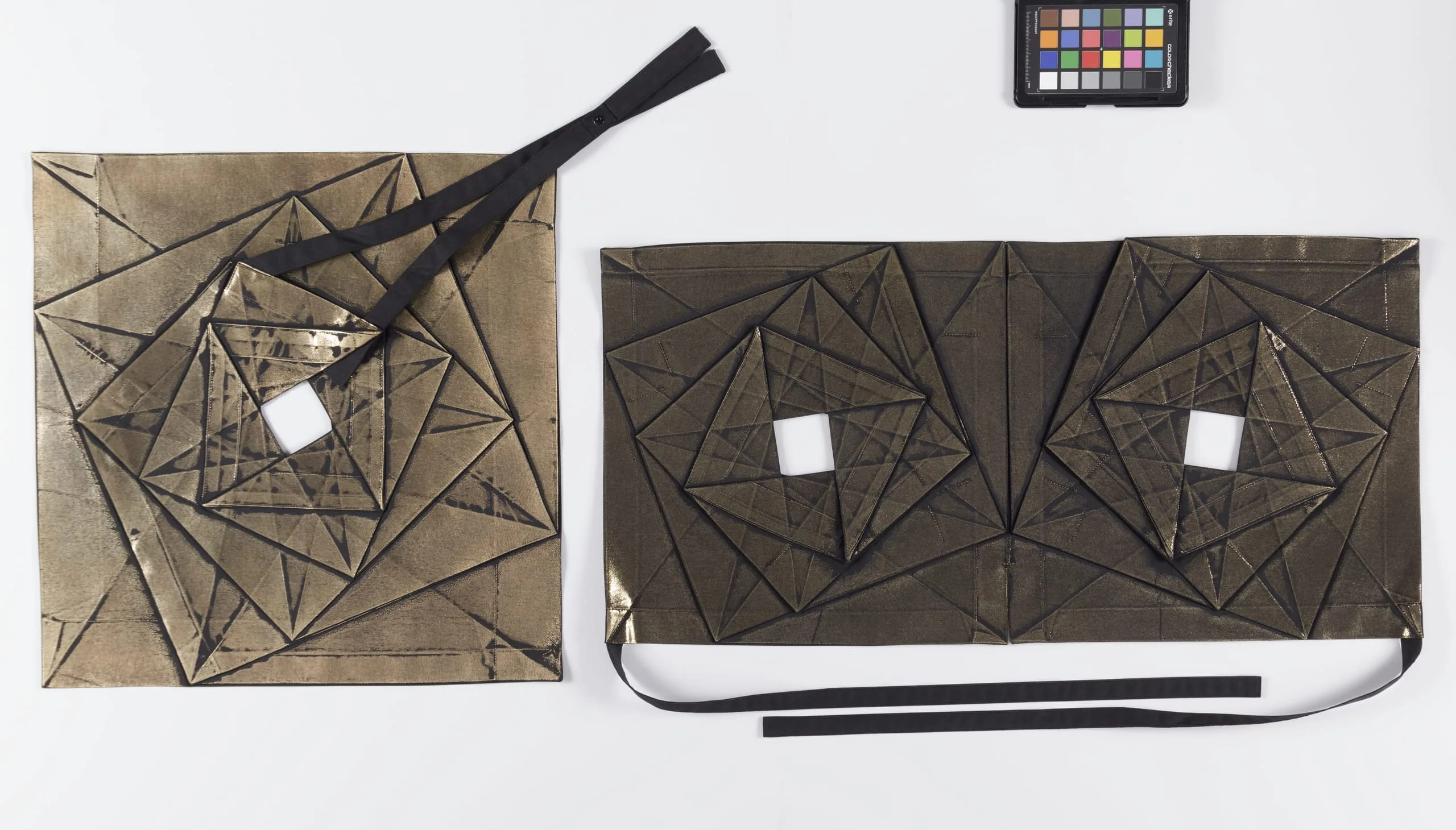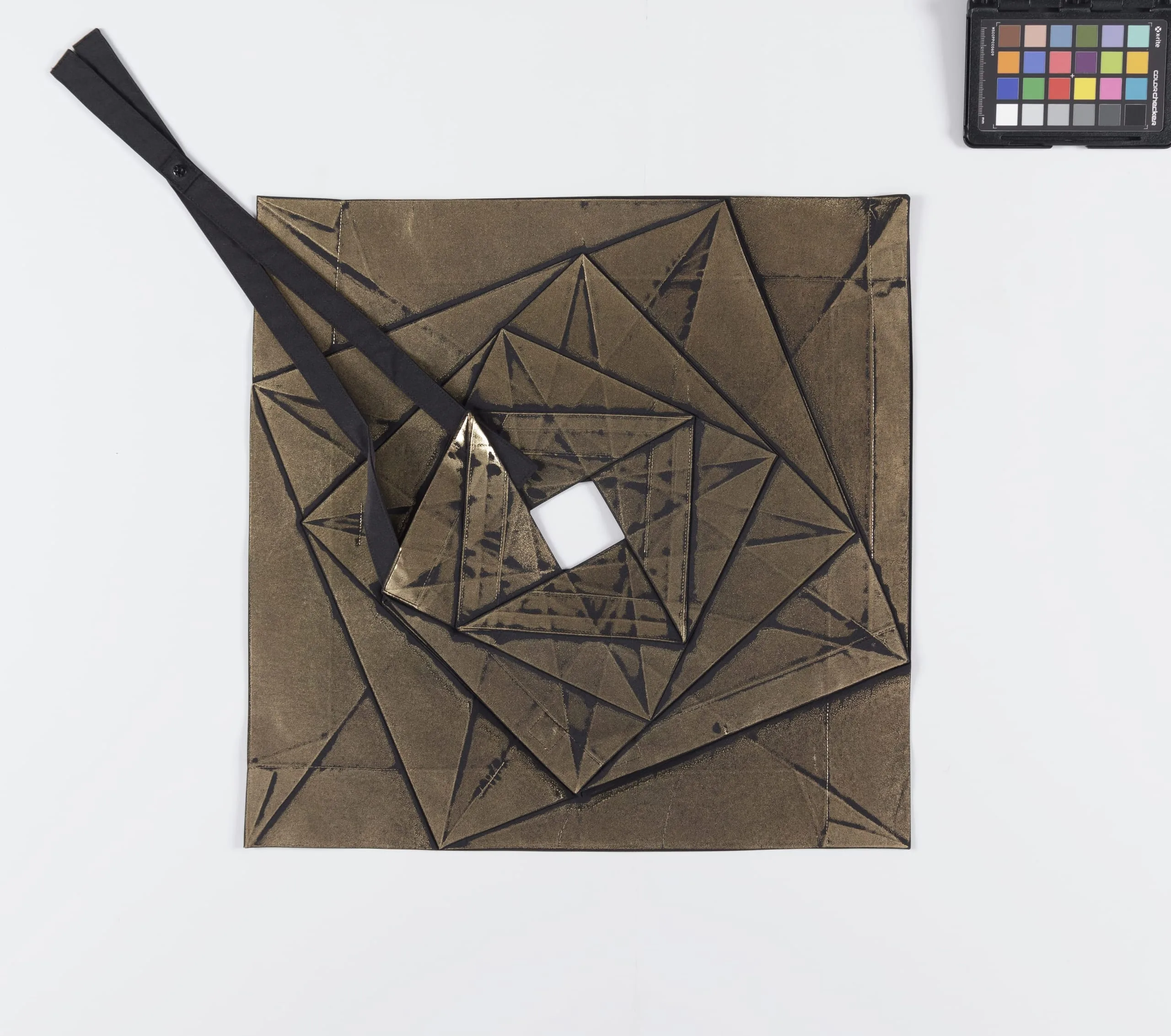 - Polyester plain weave with heat- and pressure-set folds, heat-transfer printed