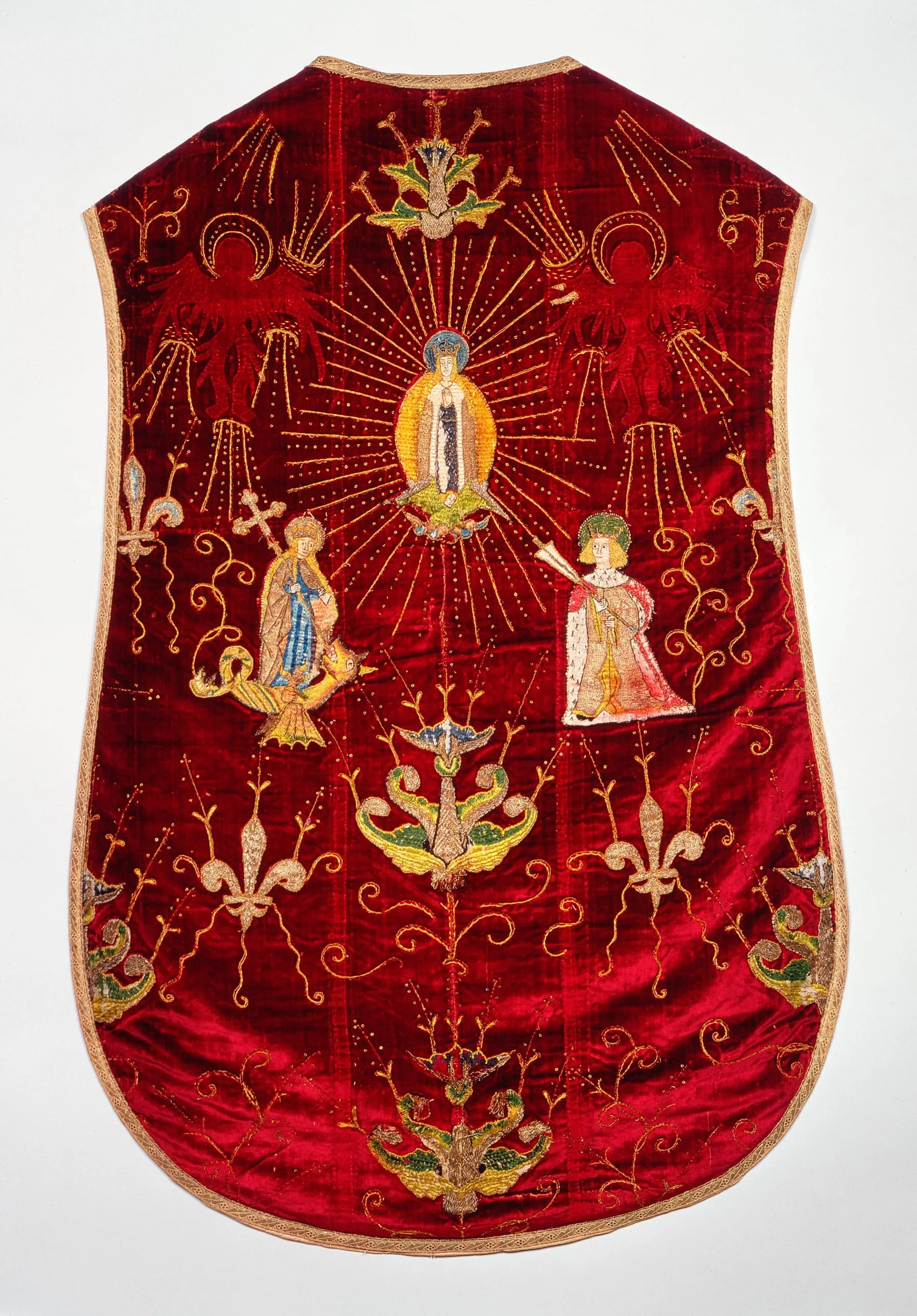 - Silk velvet with silk and metallic-thread embroidery, metal sequins, and linen and metallic-thread passementerie