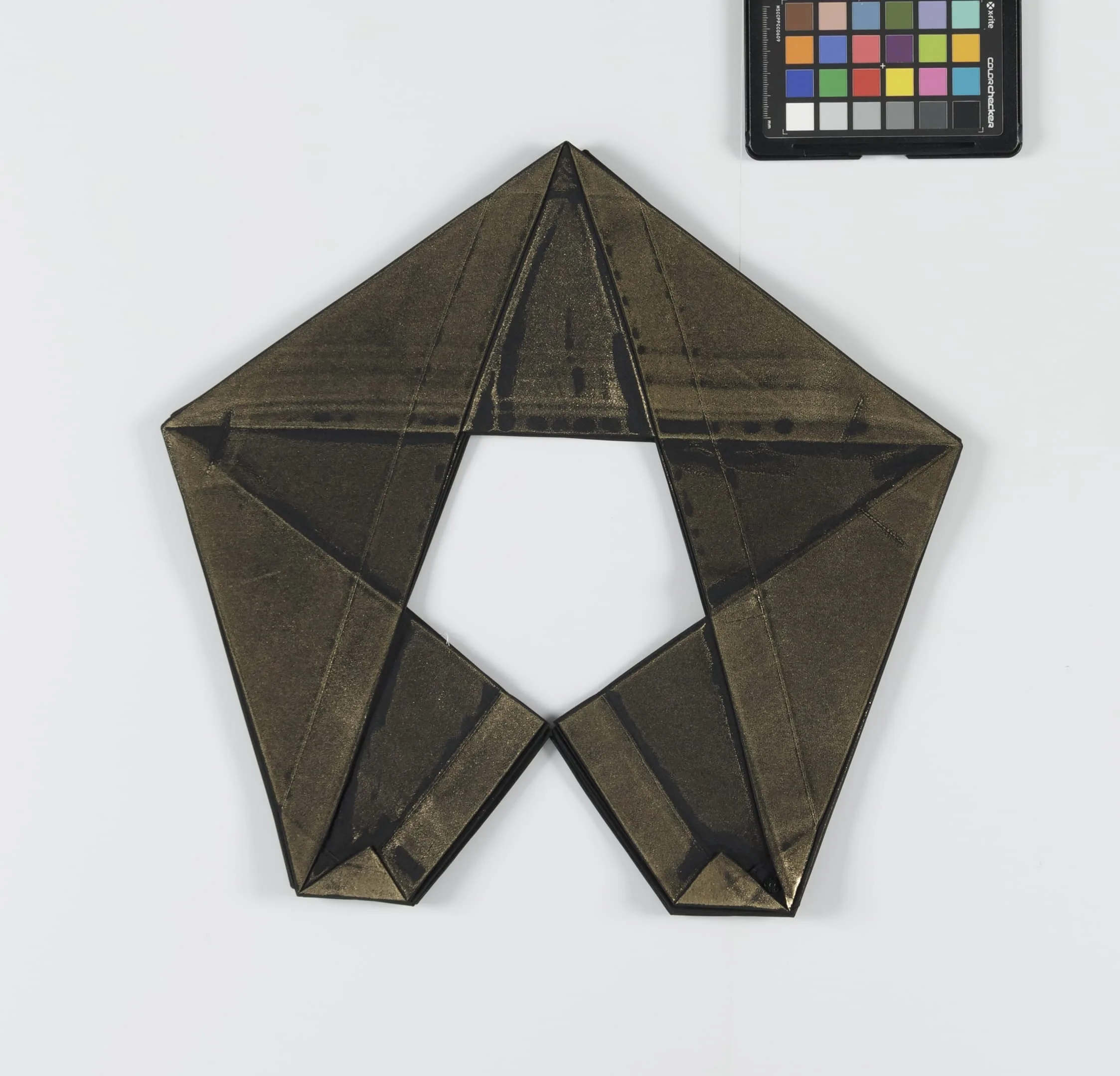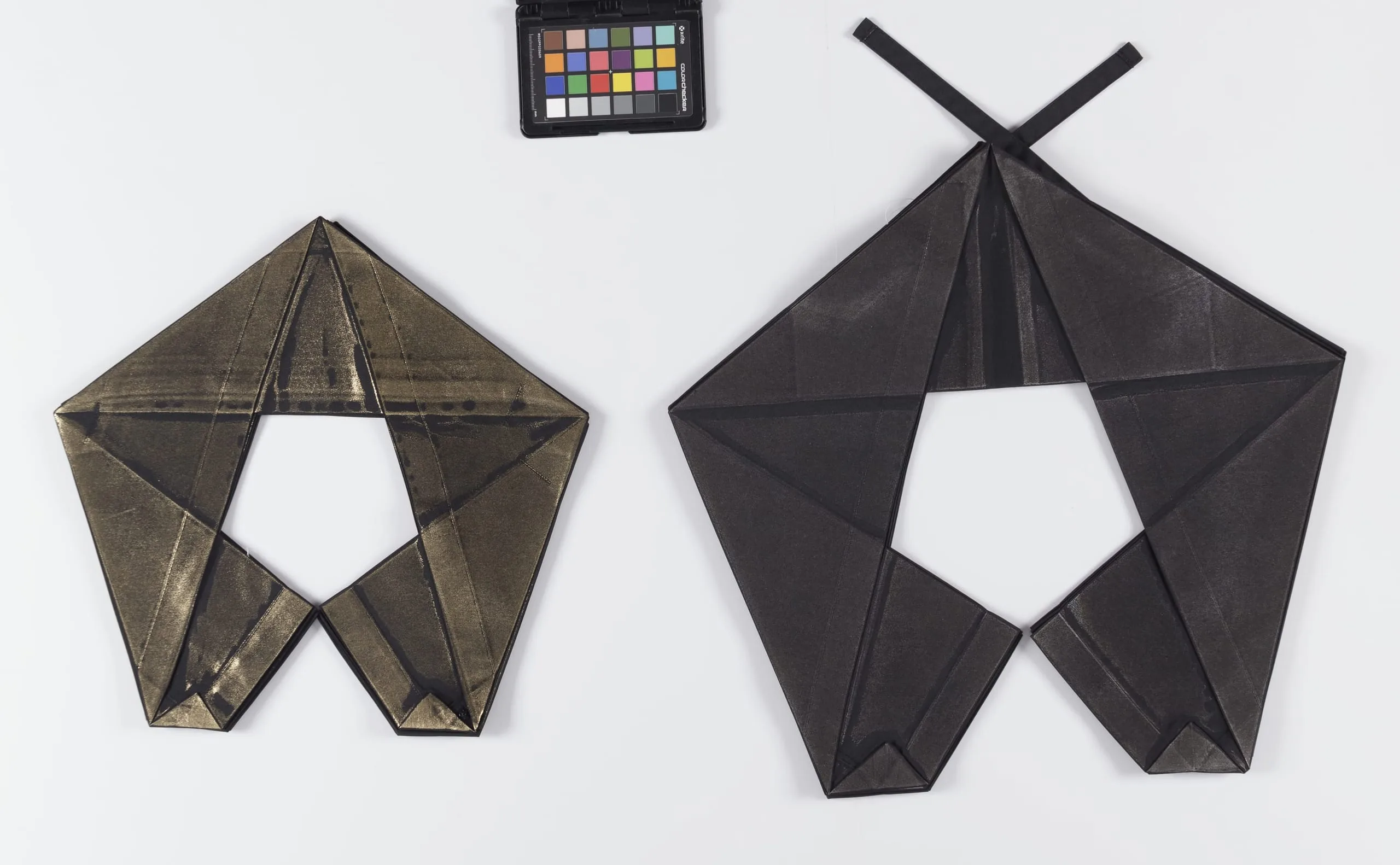 - Polyester plain weave with heat- and pressure-set folds, heat-transfer printed