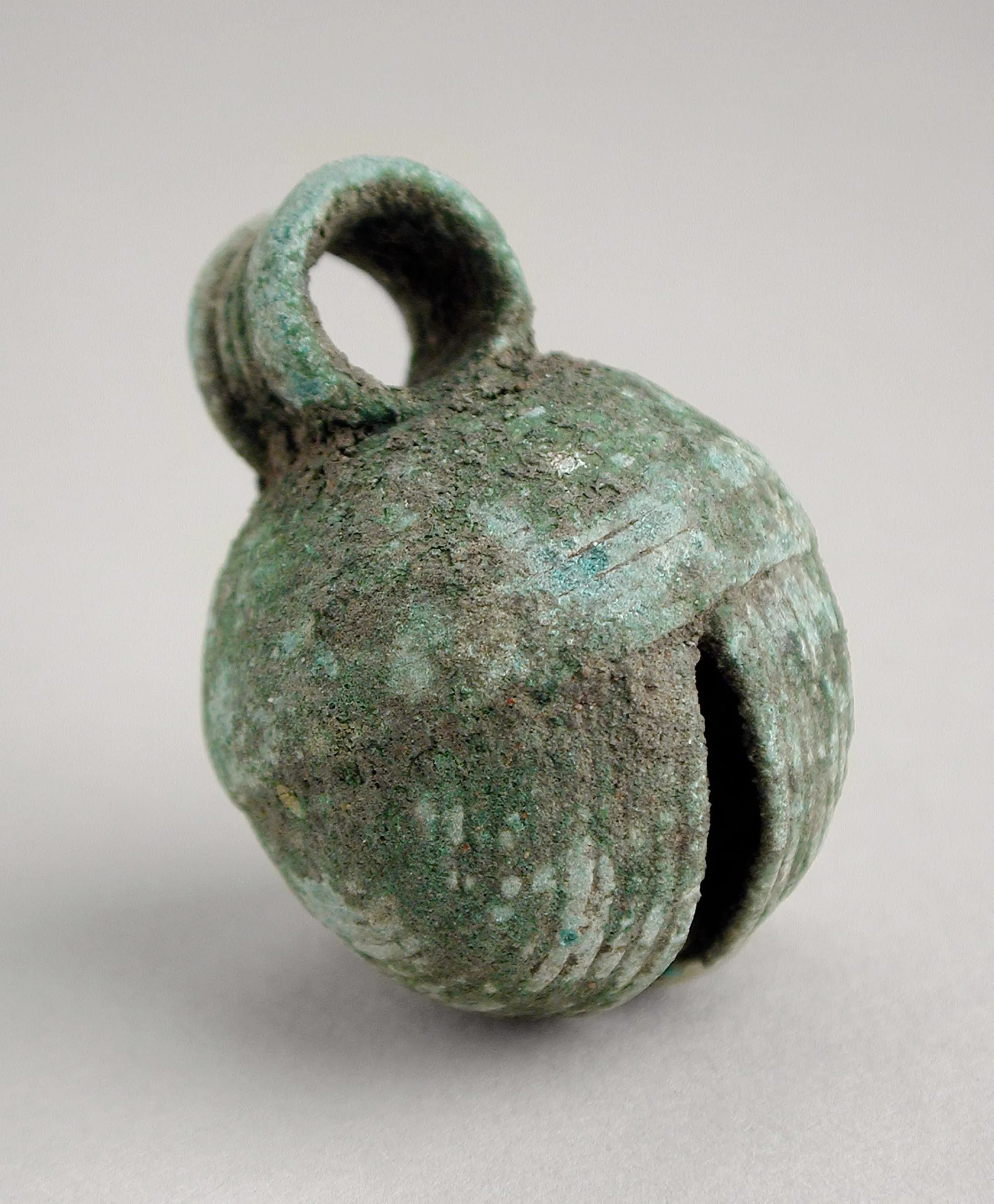 Small spherical bronze bell with a looped suspension ring at top, horizontal slot opening at center, and ribbed surface texture; heavily patinated in mottled green and gray.