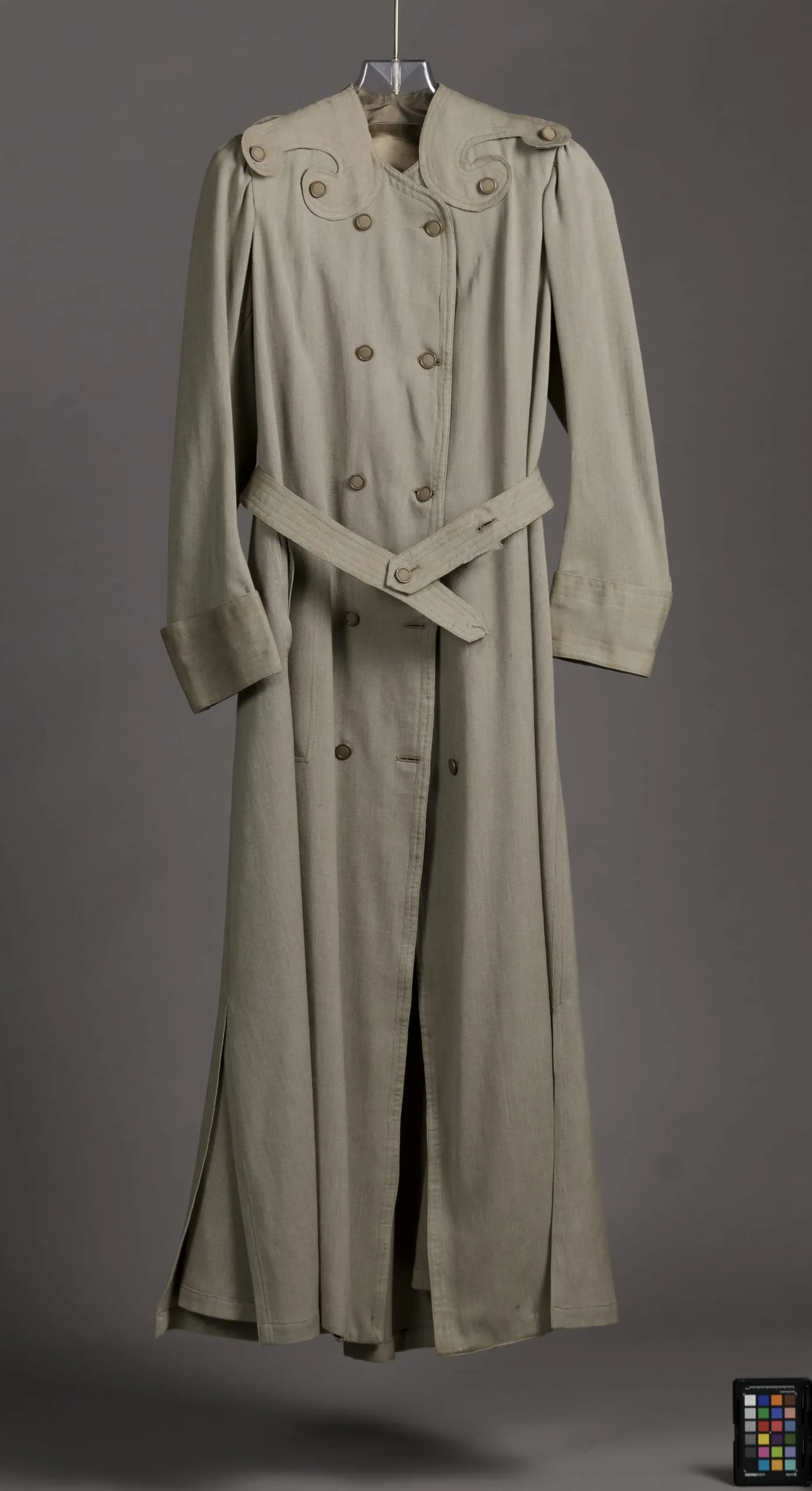 Full-length double-breasted coat in pale khaki gabardine, displayed on a hanger, with curved decorative yoke panels, self-fabric belt, and gathered sleeve heads
