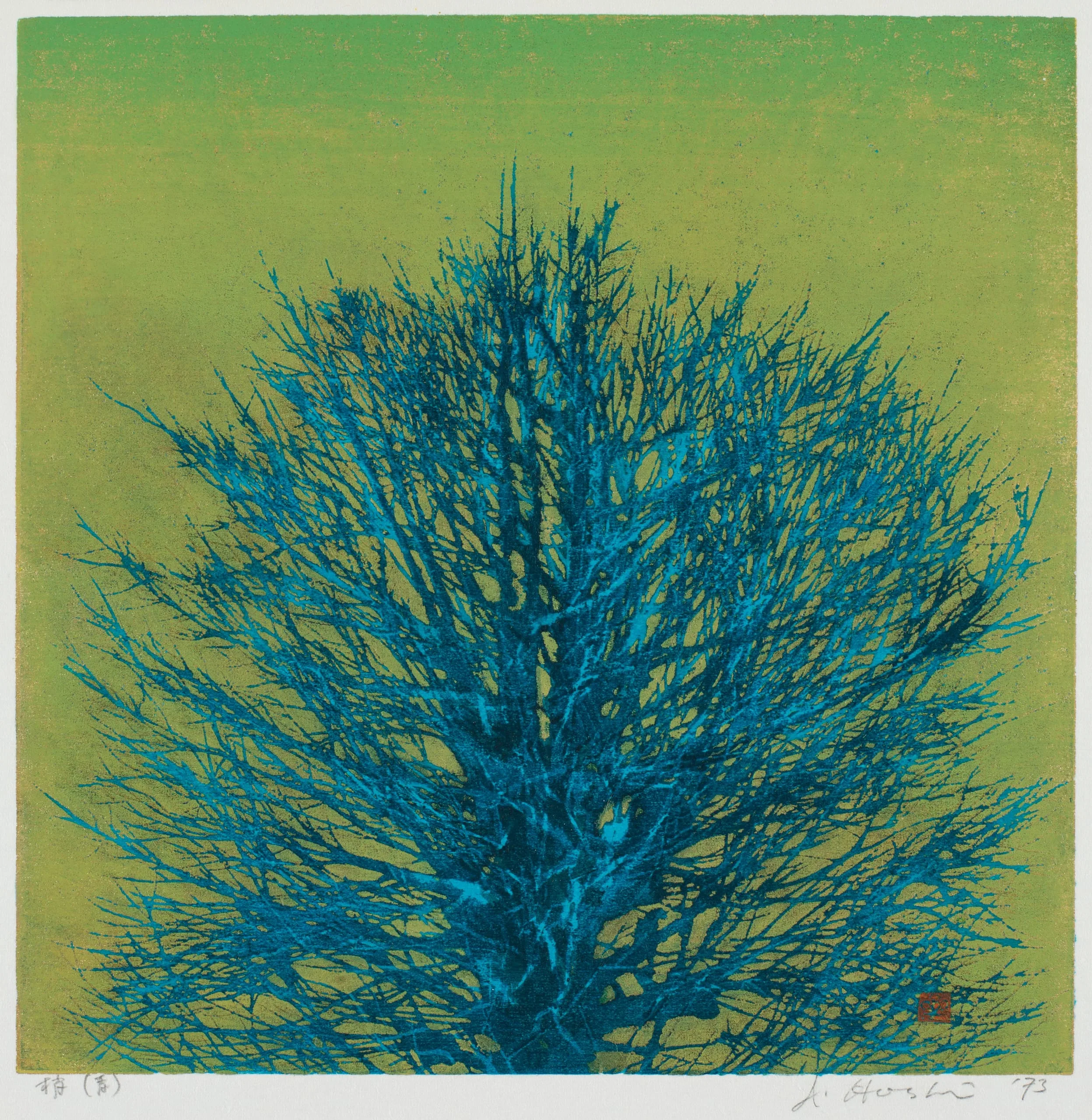 - Color woodblock print from burnt plywood, turpentine-diluted ink and color on torinoko paper with gold leaf