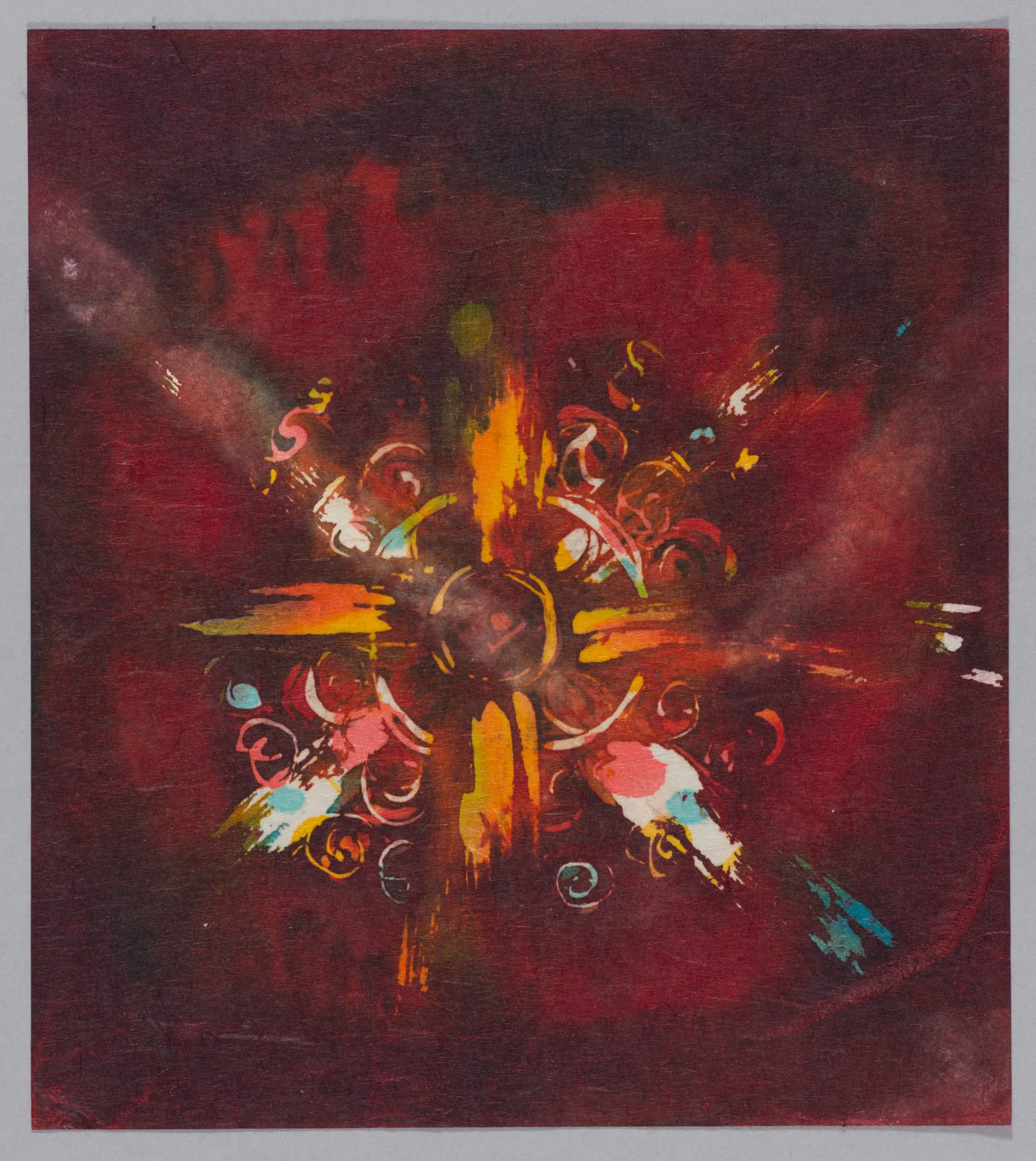 Painting on canvas with a deep crimson background, featuring a radiating abstract burst at center with loose brushwork in orange, yellow, pink, and teal, incorporating swirling scroll motifs and diagonal streaks of light emanating outward from a dark circular focal point.