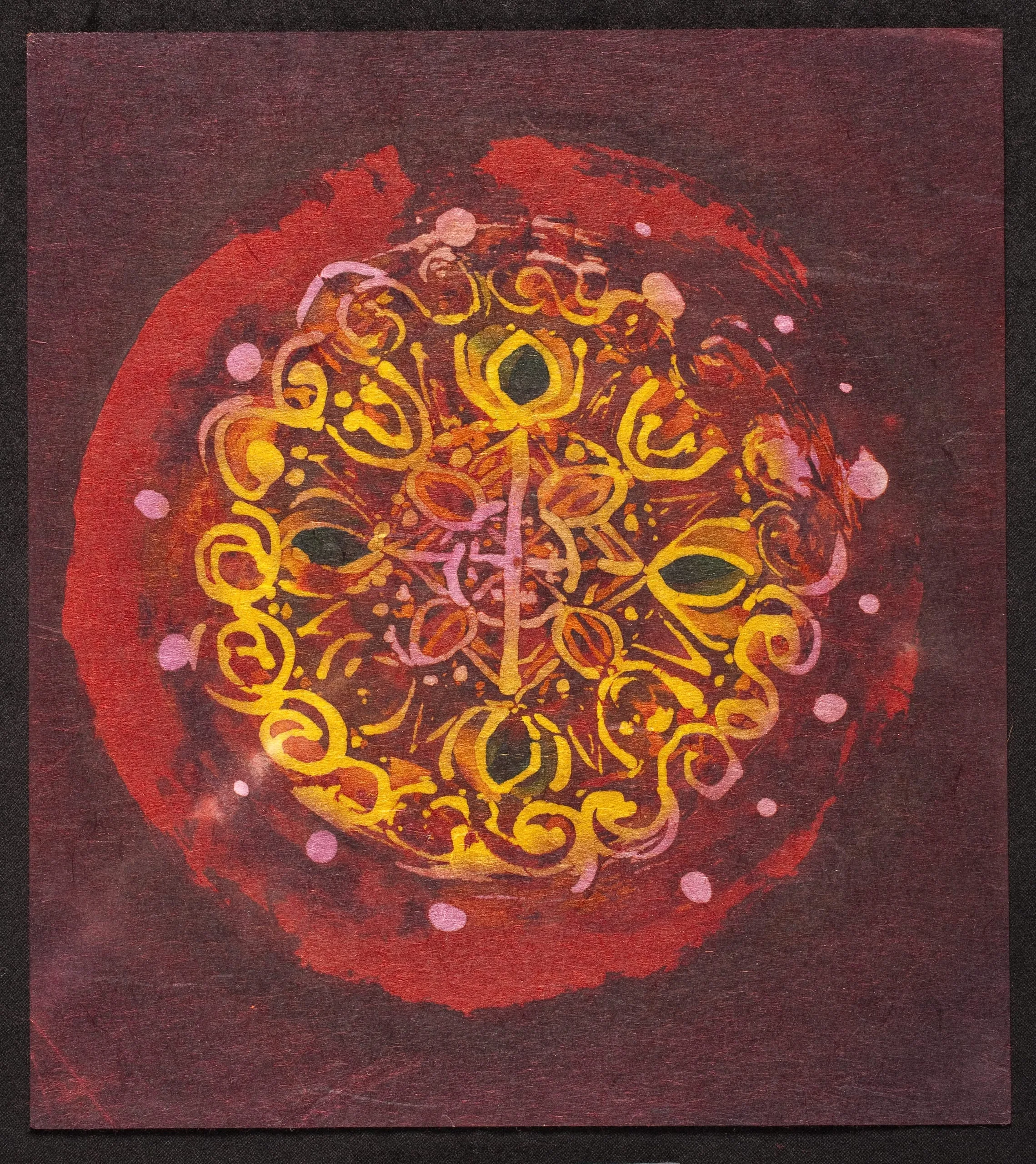 Small abstract painting on paper, circular mandala composition in crimson, gold, and plum with scrolling yellow forms and a central cross-like symbol