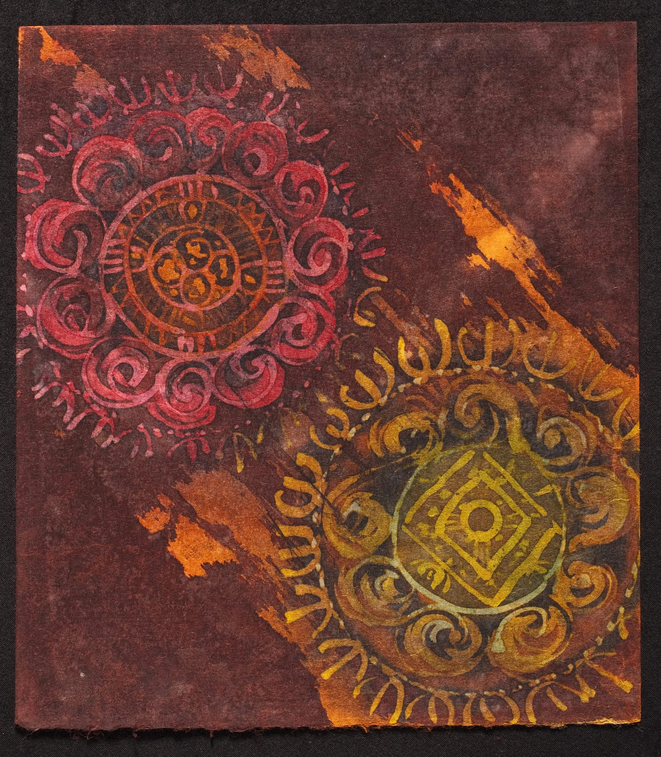 Vertical print with two circular mandala medallions in crimson and gold-green on a deep burgundy ground, crossed by a diagonal orange band