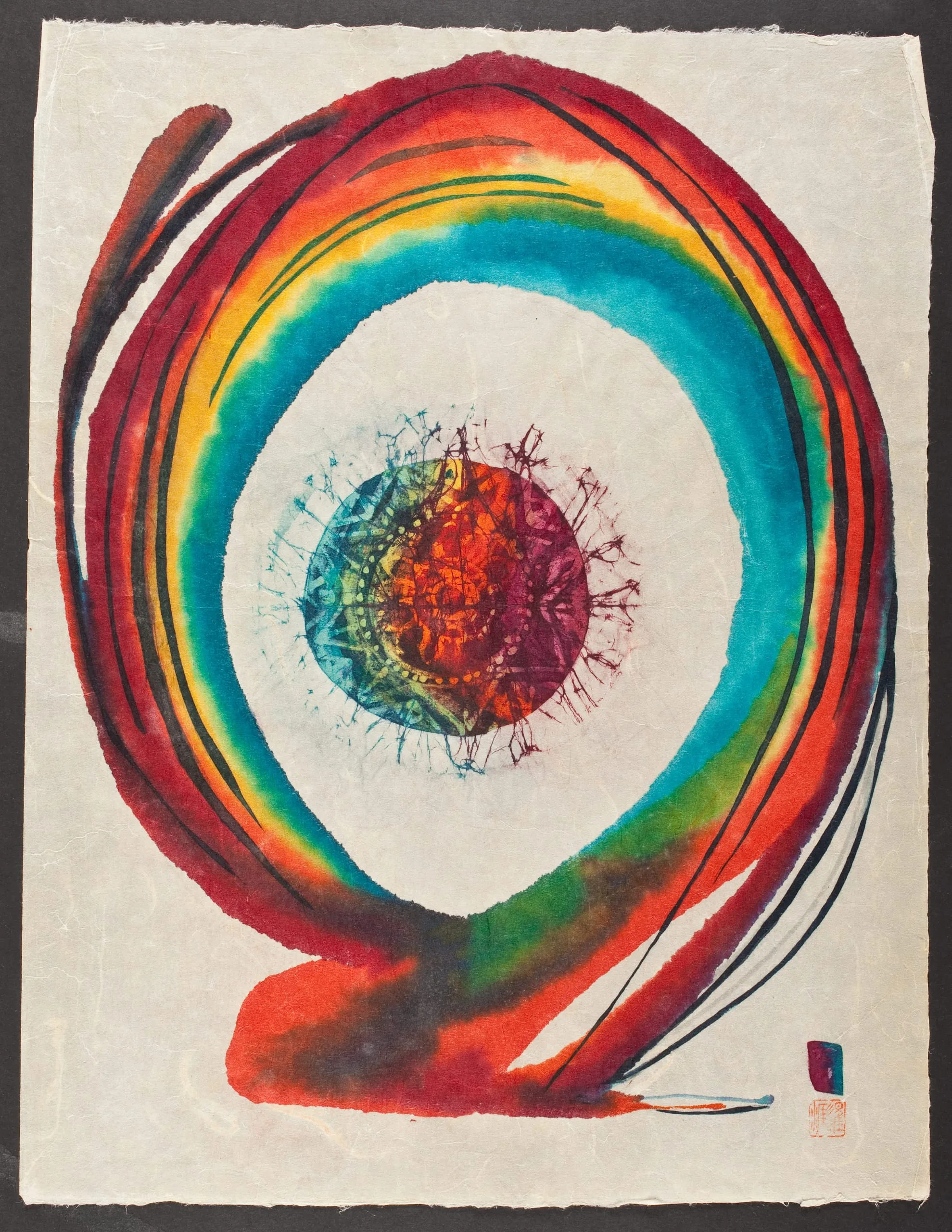 Abstract work on cream textured paper with a large multicolored ring in red, orange, yellow, green, and turquoise enclosing a smaller circular form with a glowing orange core and radiating maroon lines