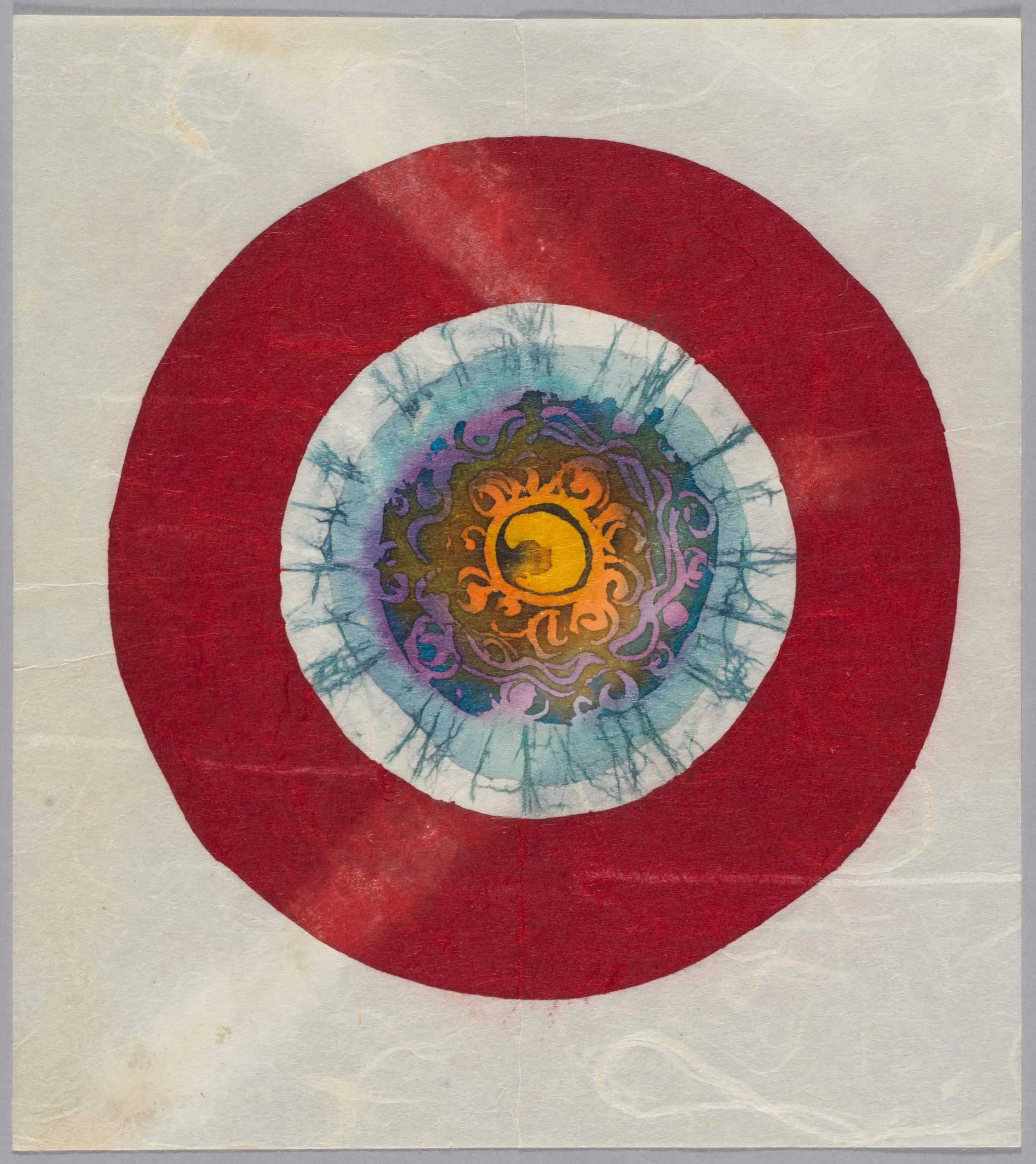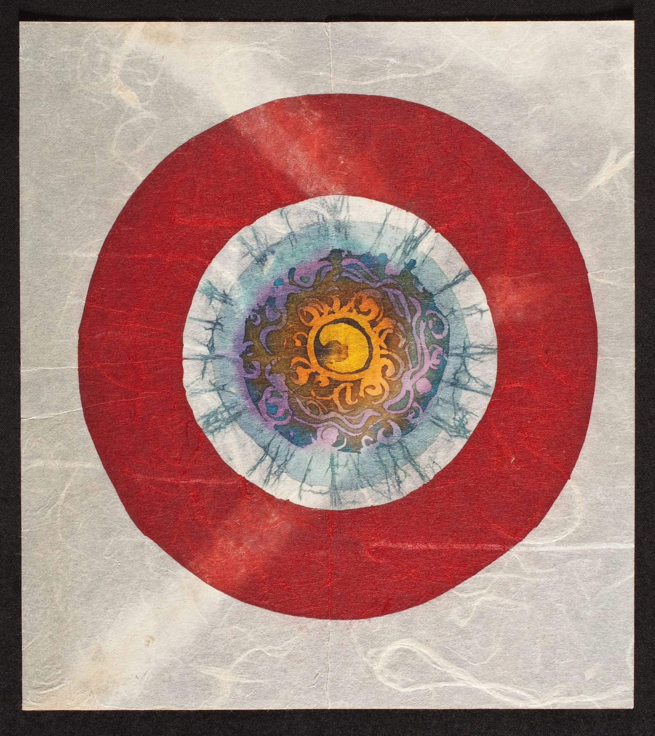 Mixed-media work on thin paper, concentric circles centered on the composition: a bold red outer ring, a white and pale blue middle band with crackled vein-like markings, and a central medallion of ornate scrollwork in orange, gold, purple, and teal.