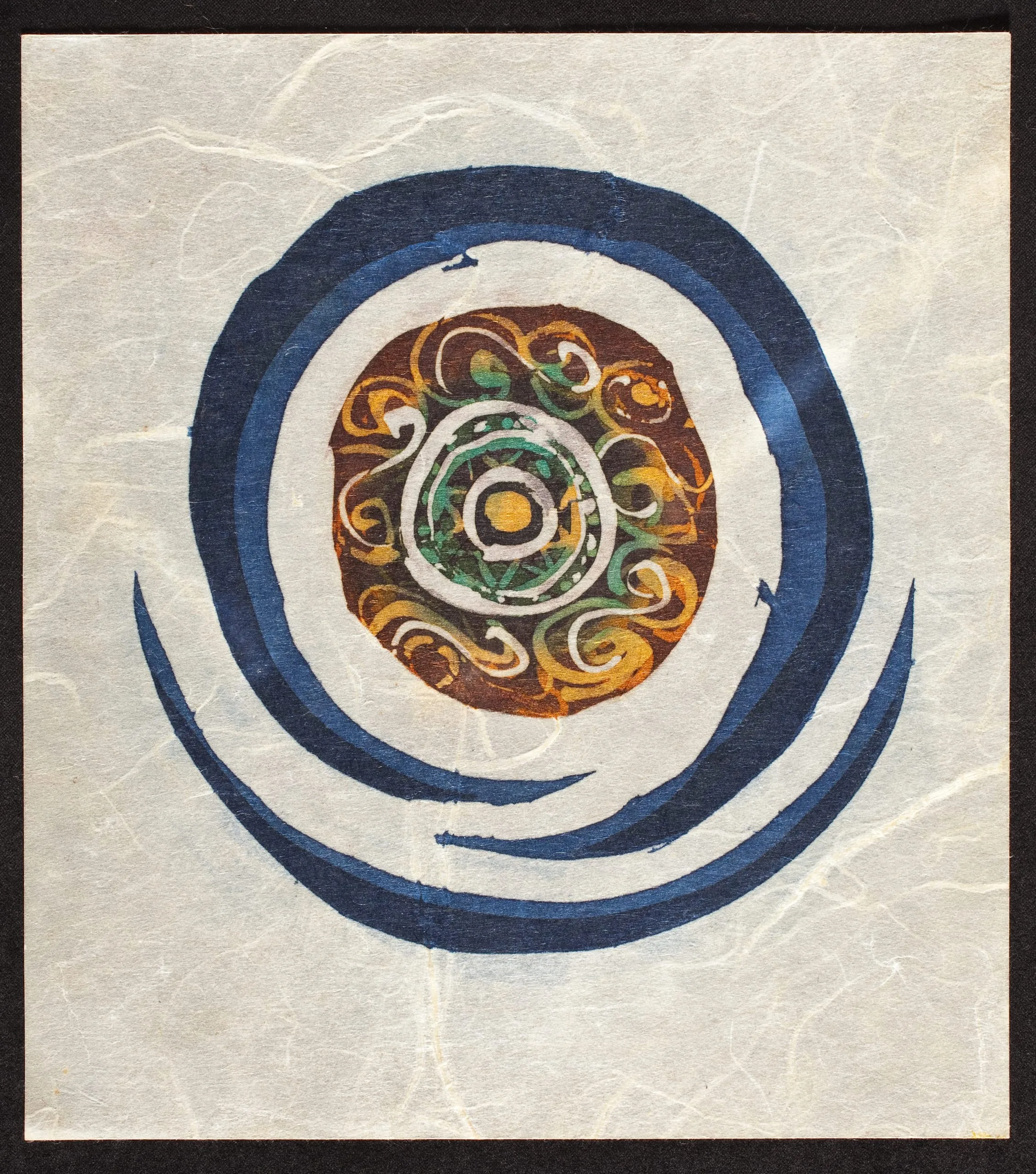 Abstract painting on textured handmade paper, a navy blue spiral encircling a rust-brown disk filled with multicolored scrollwork and a concentric bullseye center