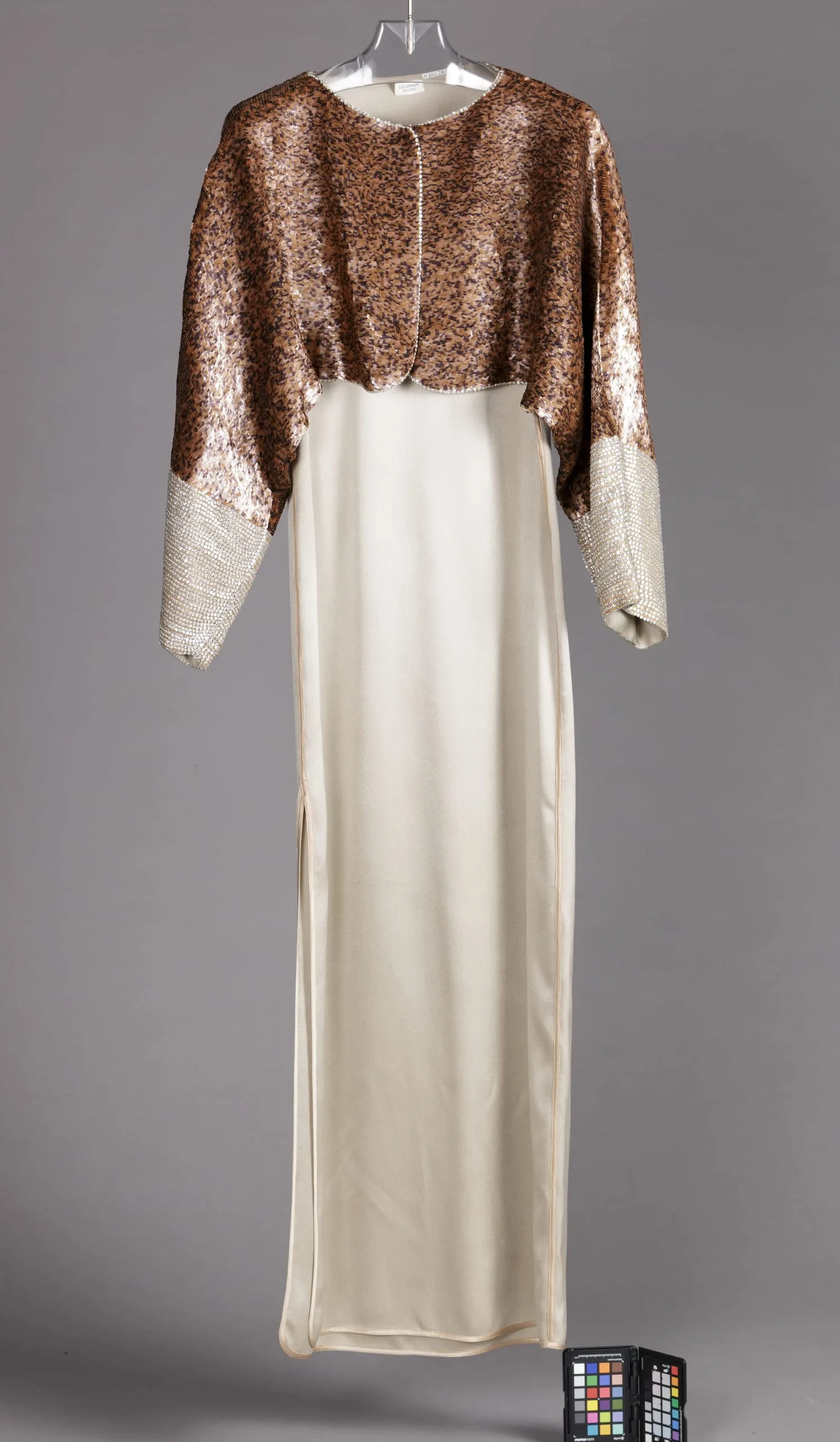 - Dress: Silk satin, metallic-thread quilting, with silk ribbon trim; Jacket: Plastic sequins, rhinestones