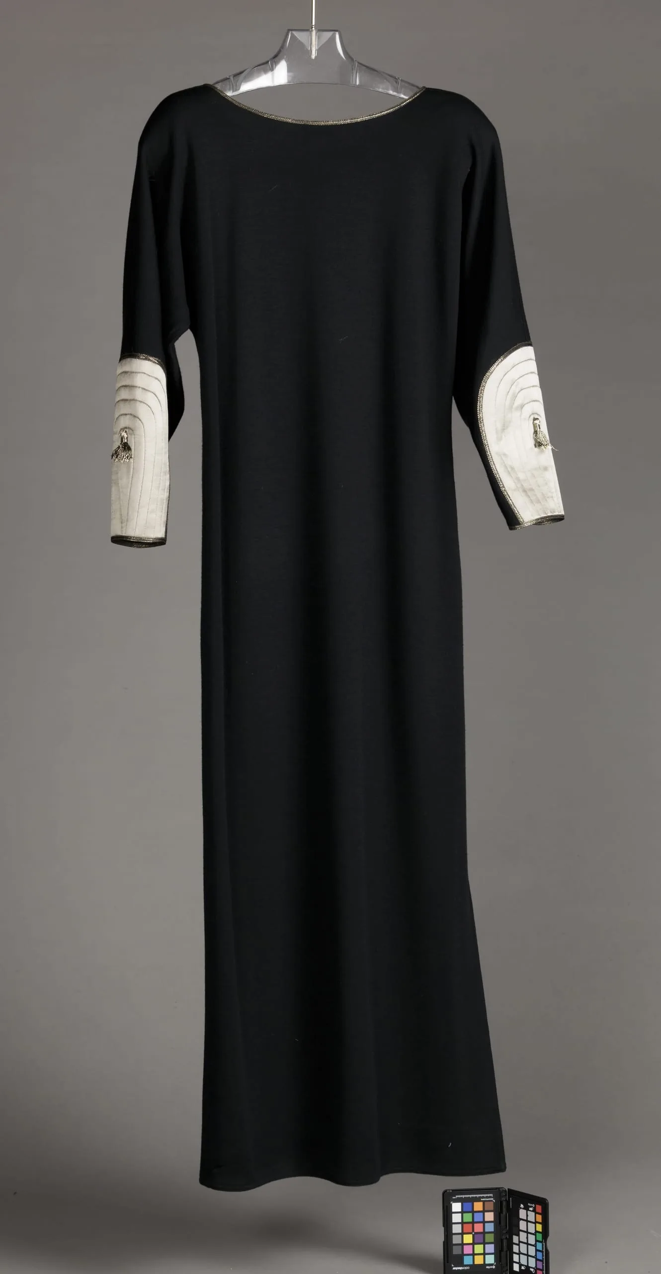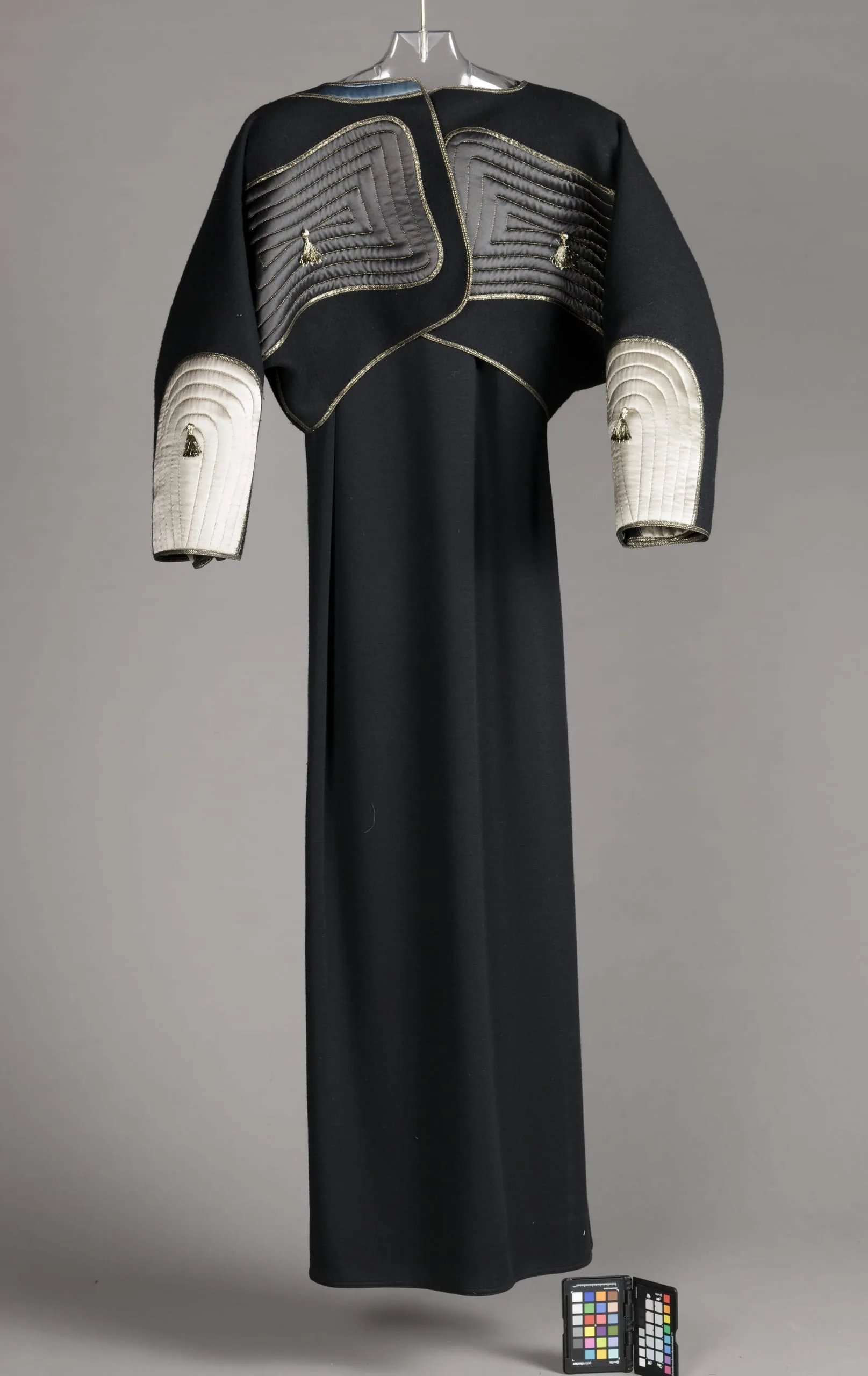 - Dress: Wool knit (jersey), metallic trim; Jacket: Wool plain weave, fulled (melton), silk satin, quilted, metallic-thread trim, metallic tassels