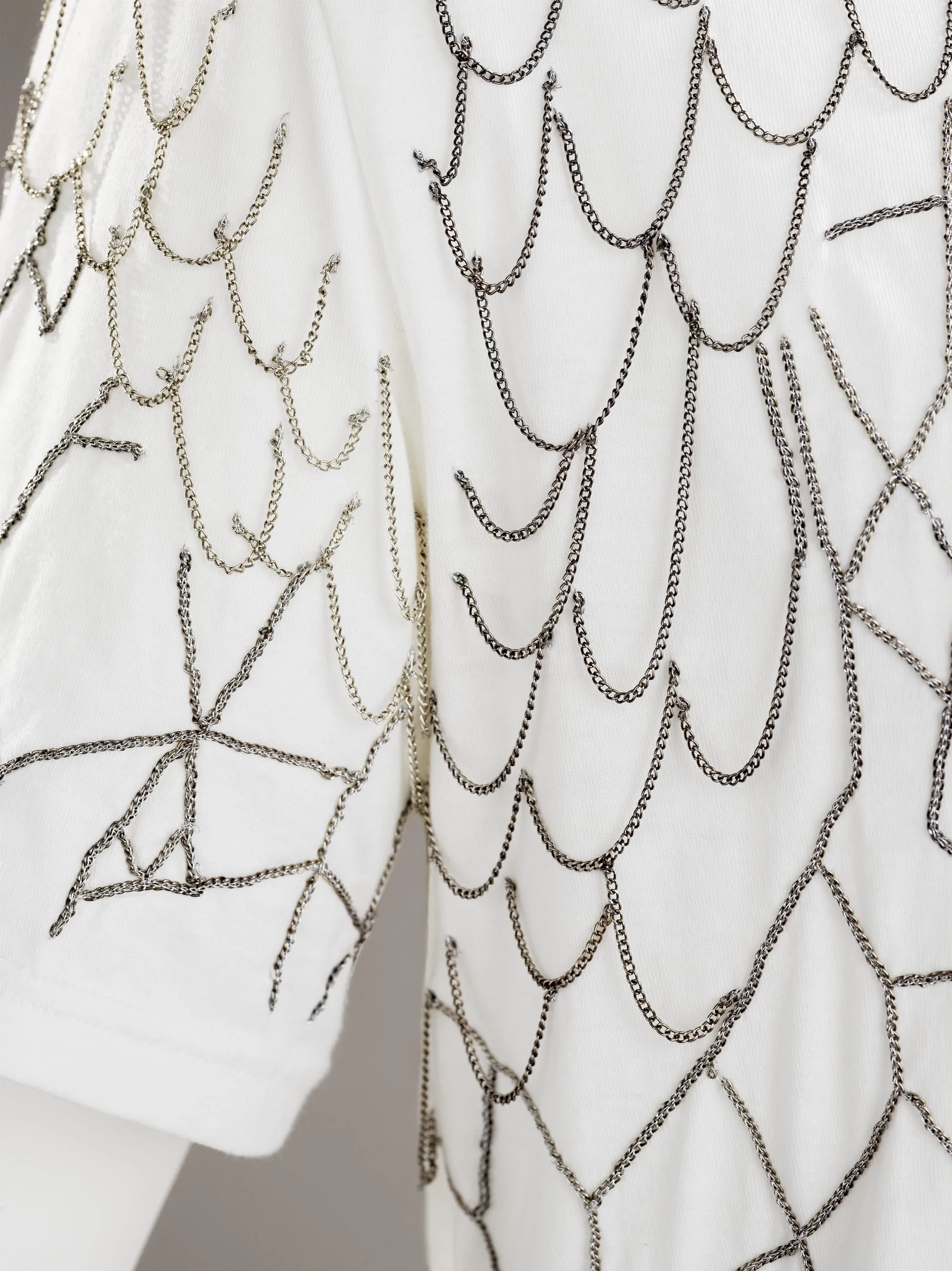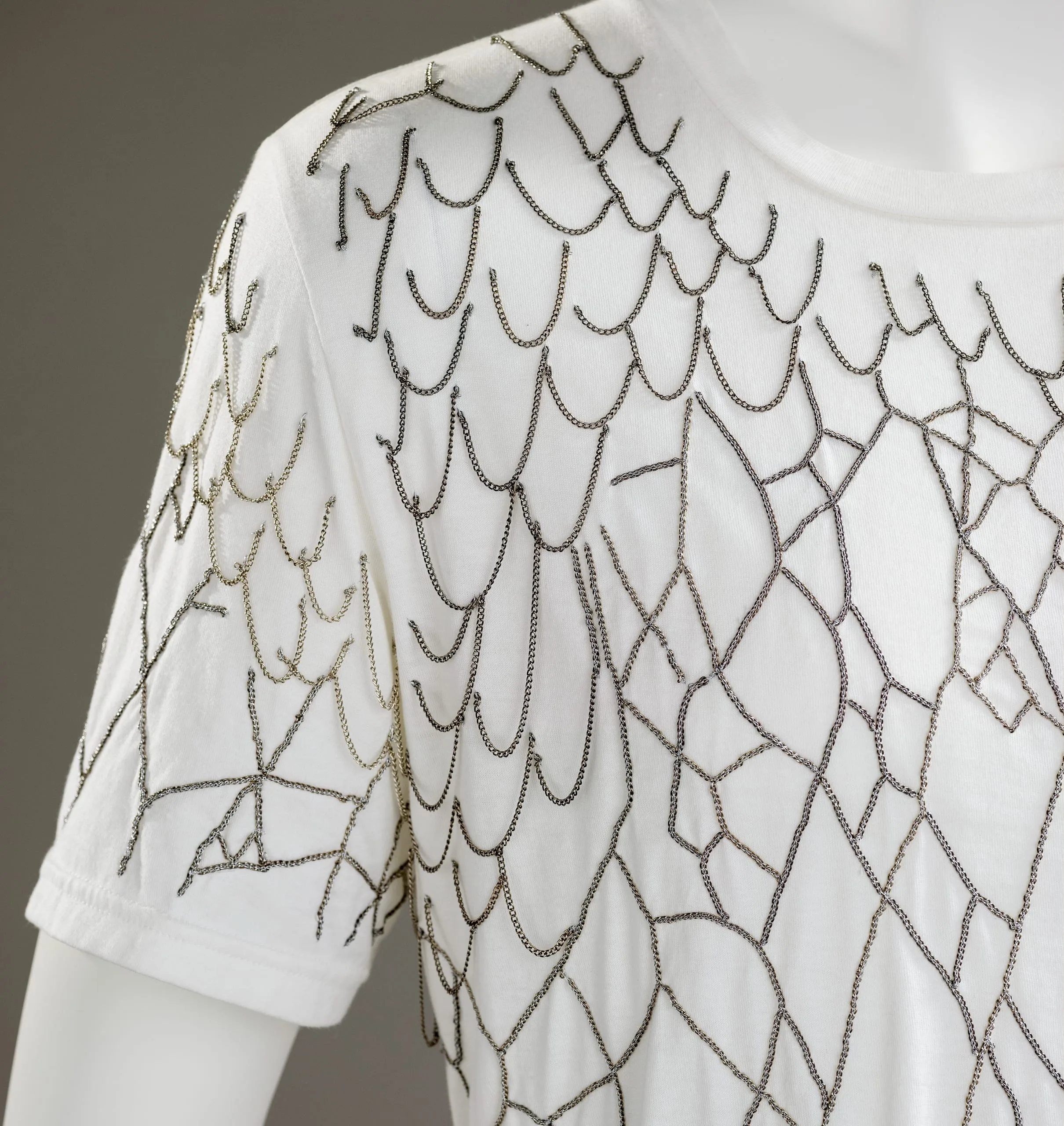- Cotton knit (jersey) with metal chains and metallic-thread embroidery