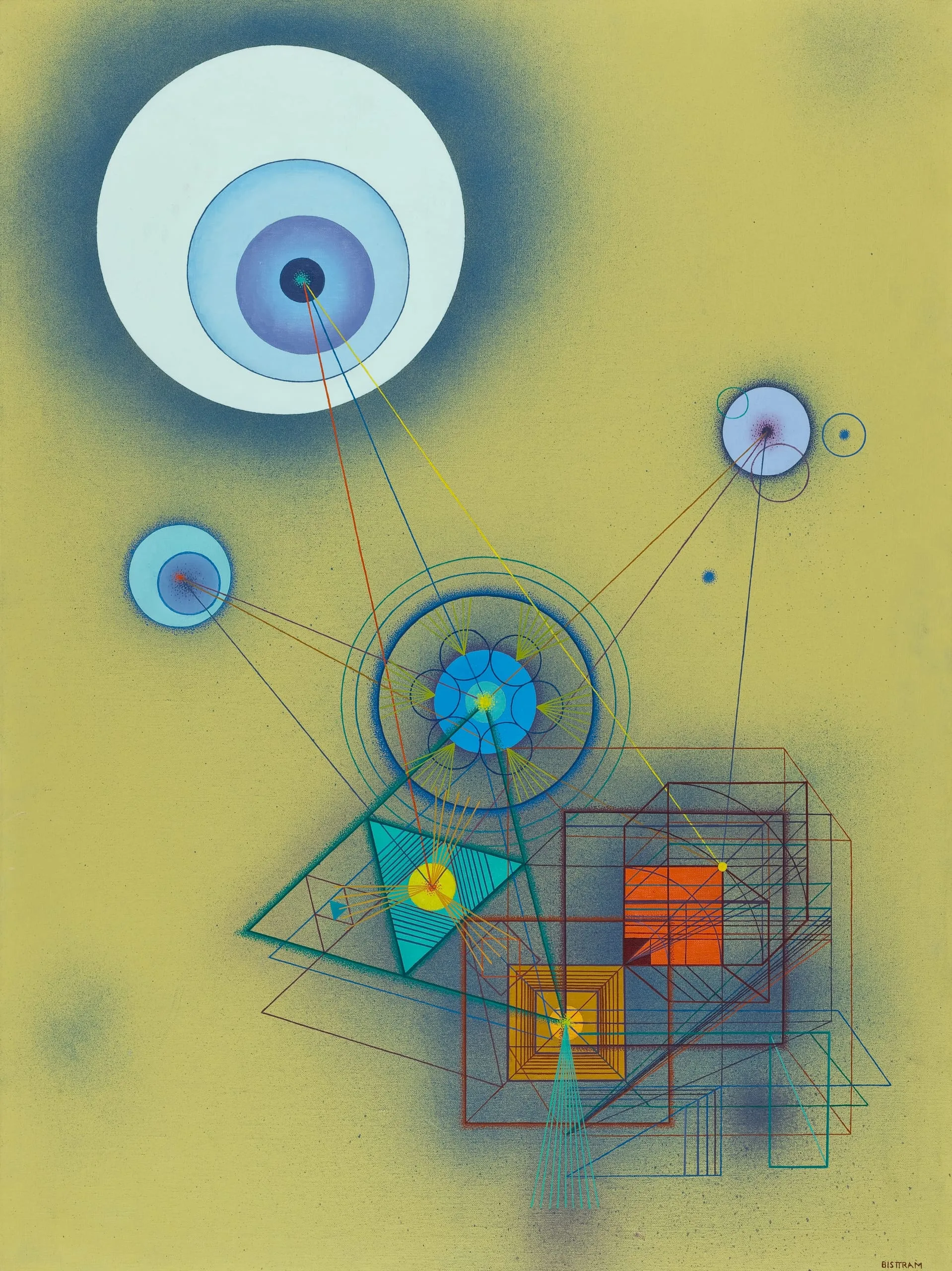 Bisttram often featured both circles and orbs that suggest planets and other celestial bodies as well as the detailed structure of tiny geometric-shapes. Projection, No. 3, is one of his earliest, largest and finest compositions. Created two years prior to the founding of the TPG, he already incorporated in it his total philosophy of art and life. Within a khaki green field float in the upper left different colored concentric circles, linked by filigree-thin lines linking it to other forms. In the lower right, balancing the brilliant rings of color, is a transparent and overlapping arrangement of a large circle, triangle, and rectangles, all repeatedly dissected within to form hierarchies of precise structures.