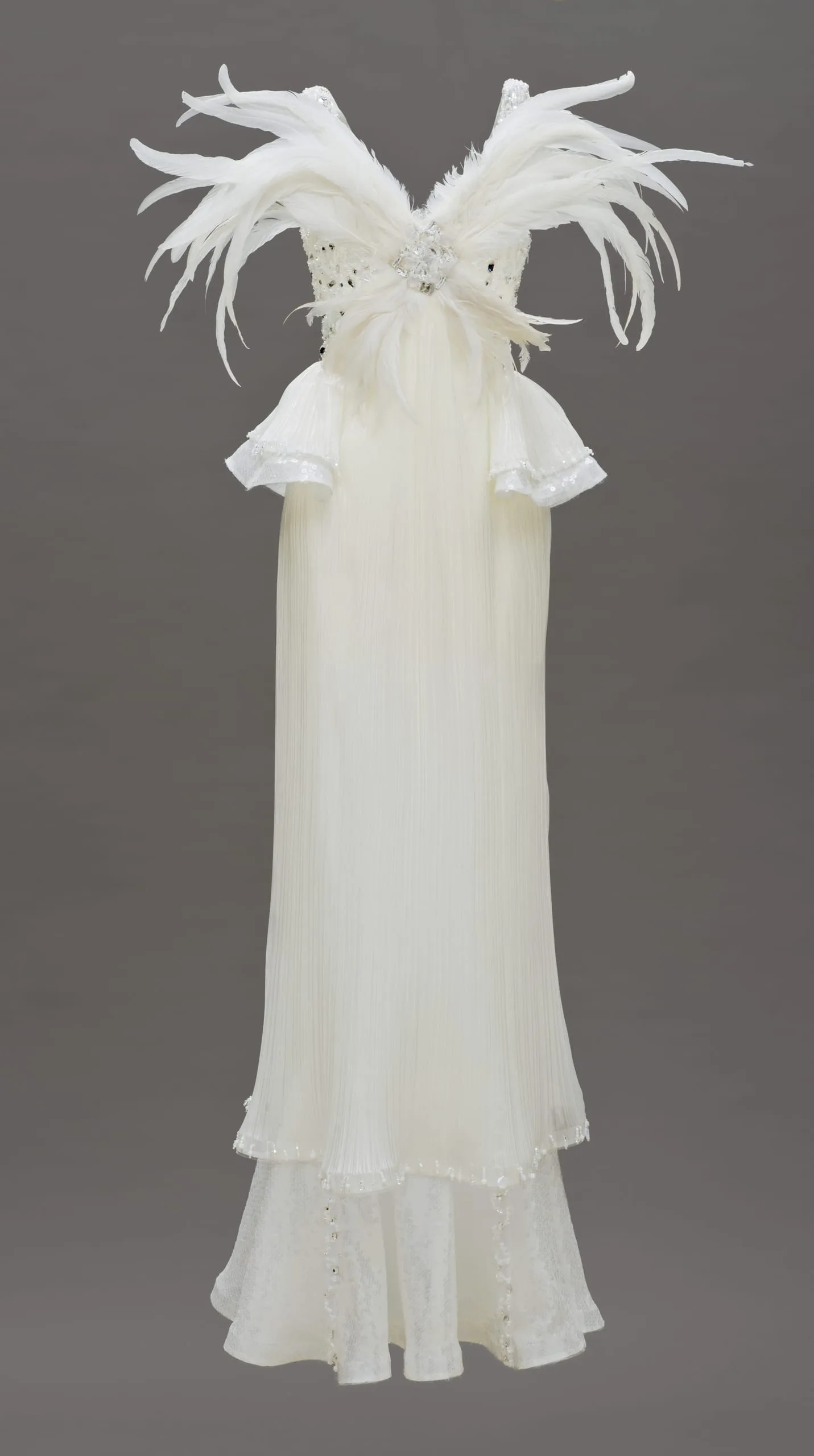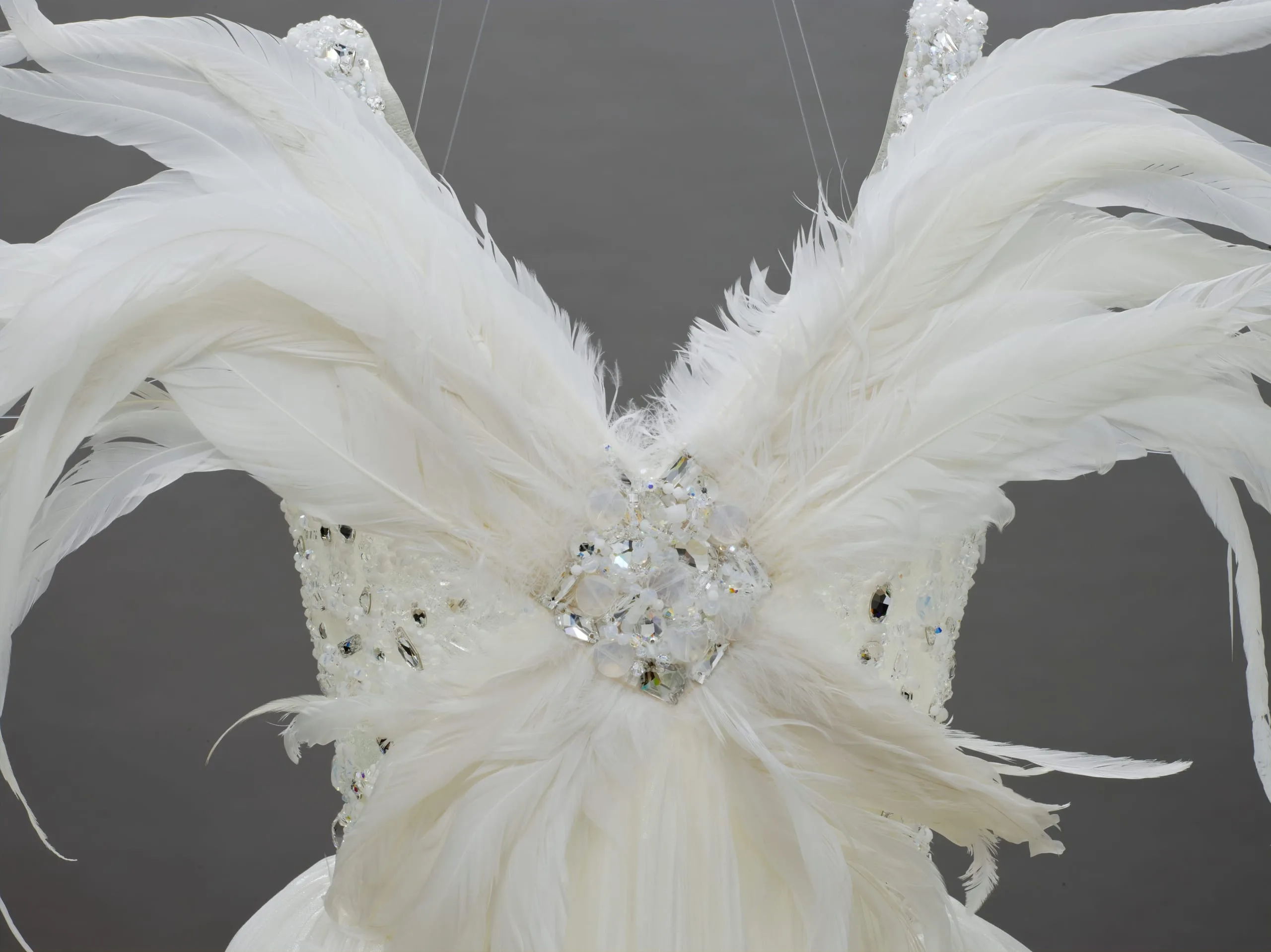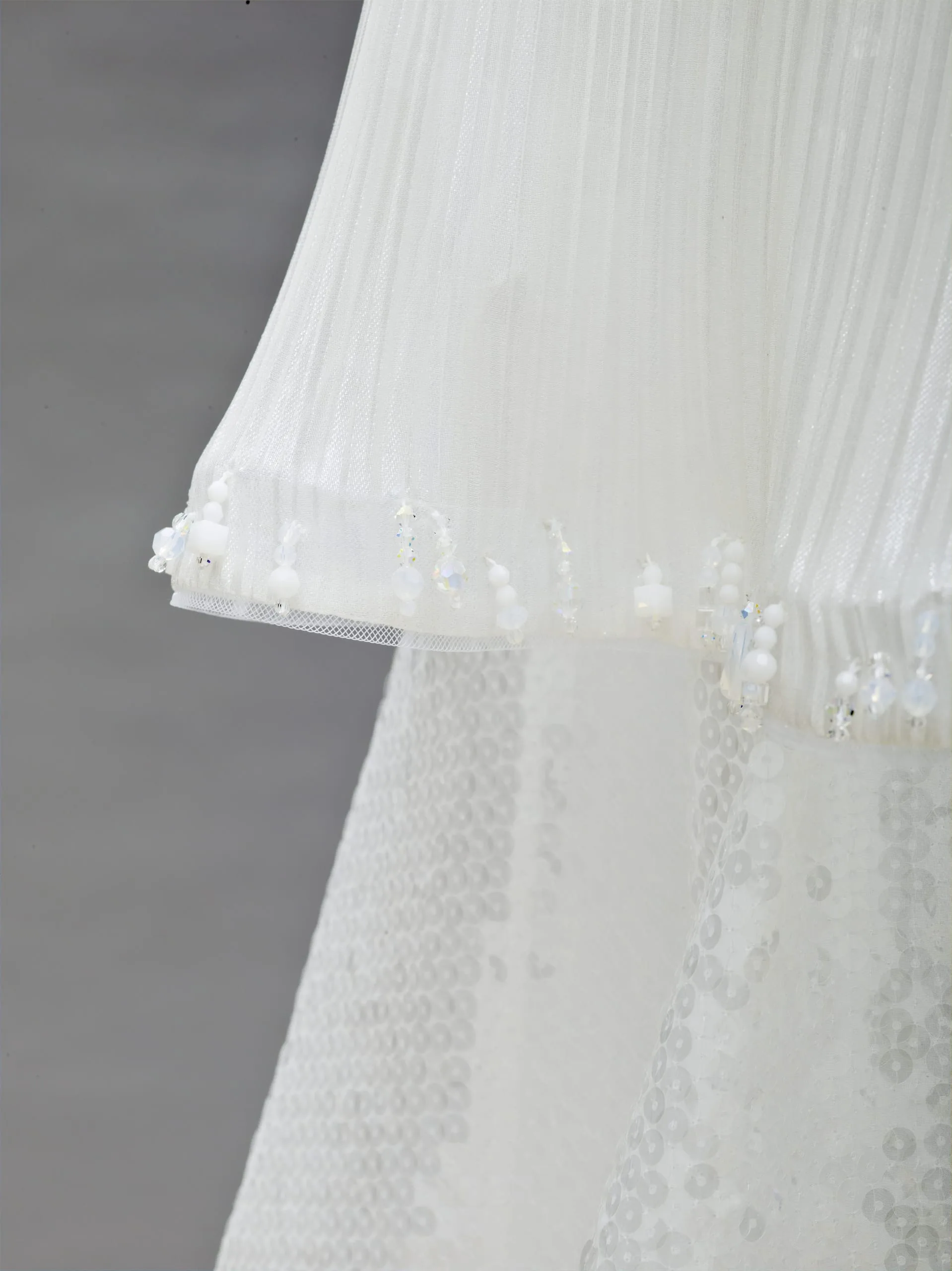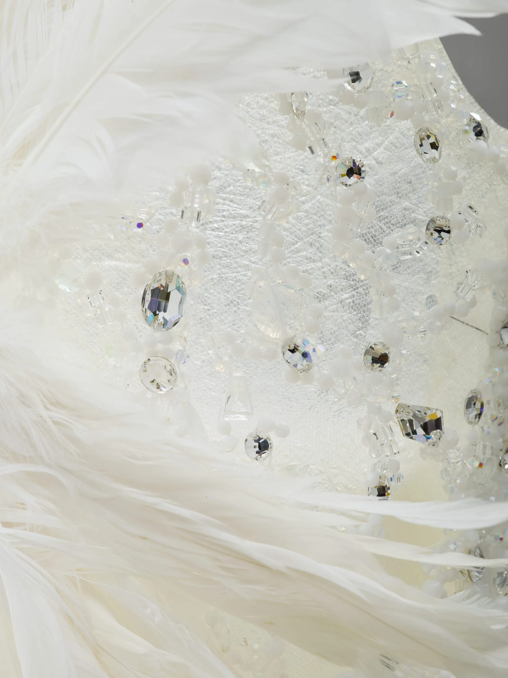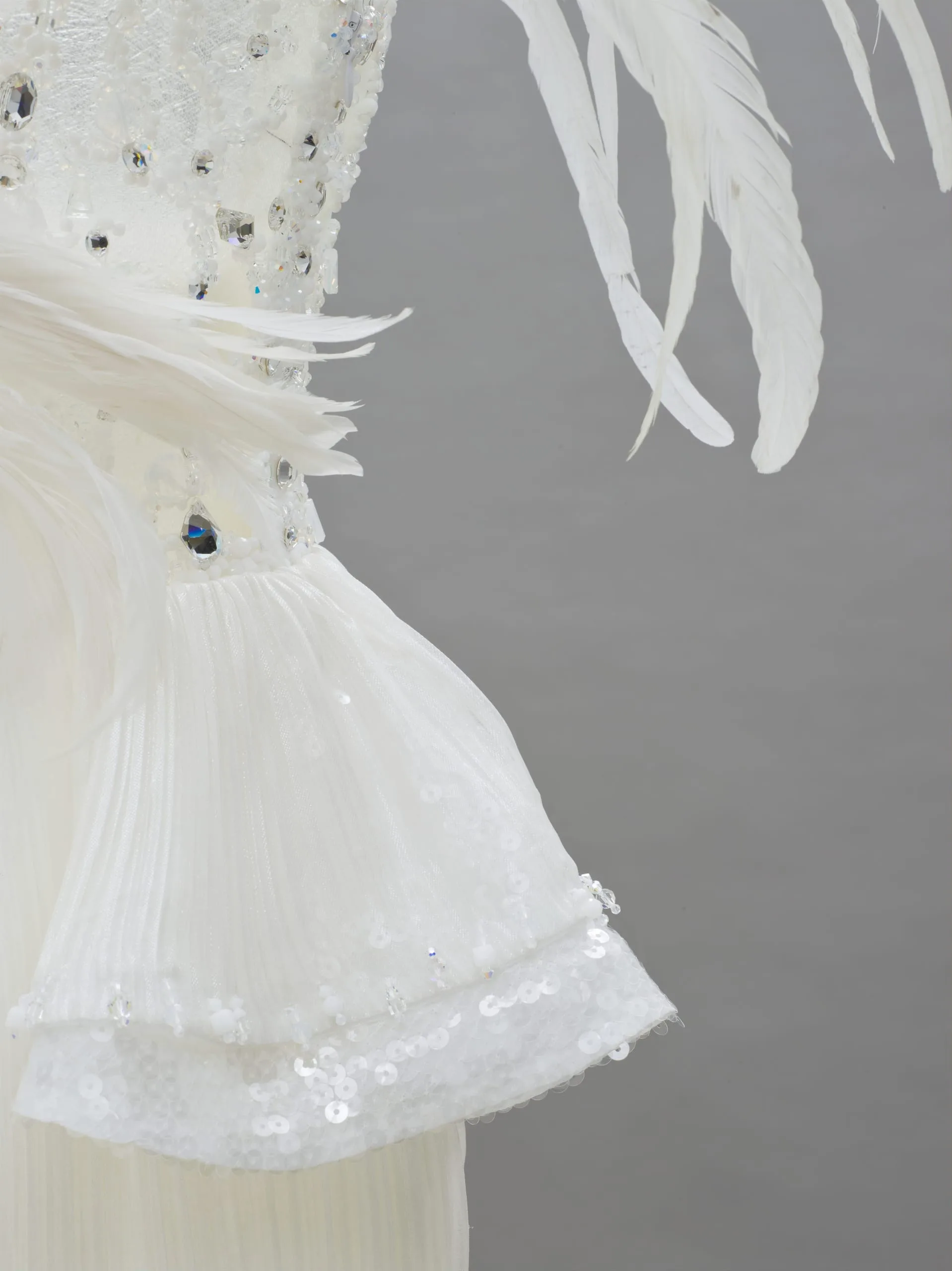 - Silk and polyester plain weave and cloth of sequins with net, crysrals, and feathers
