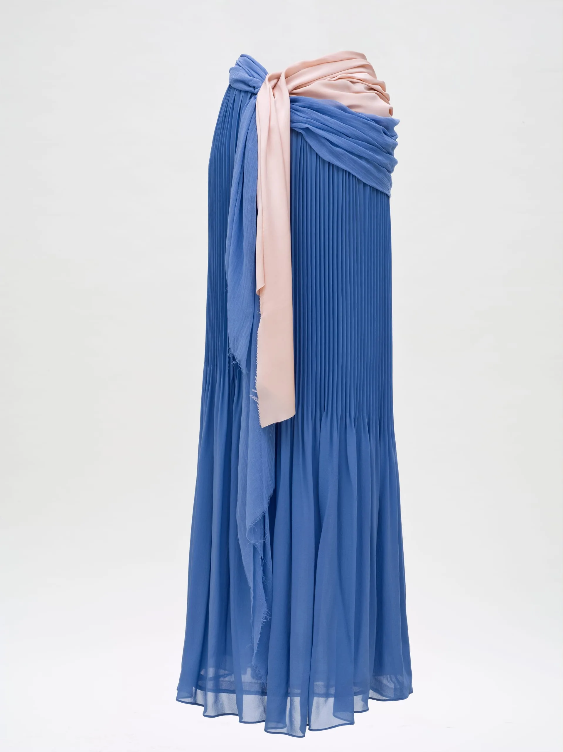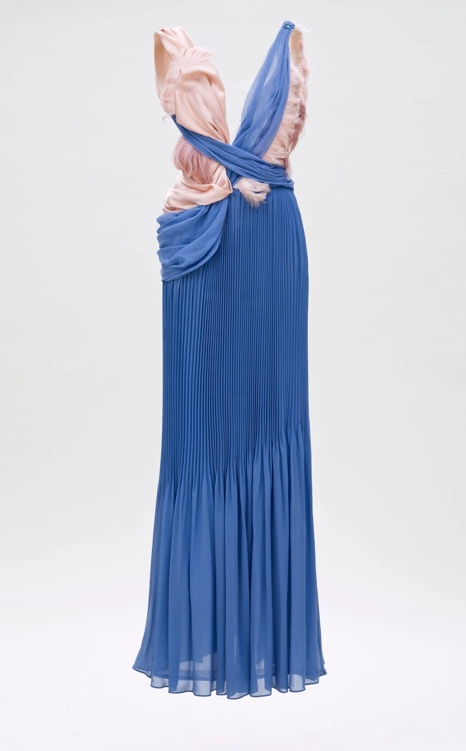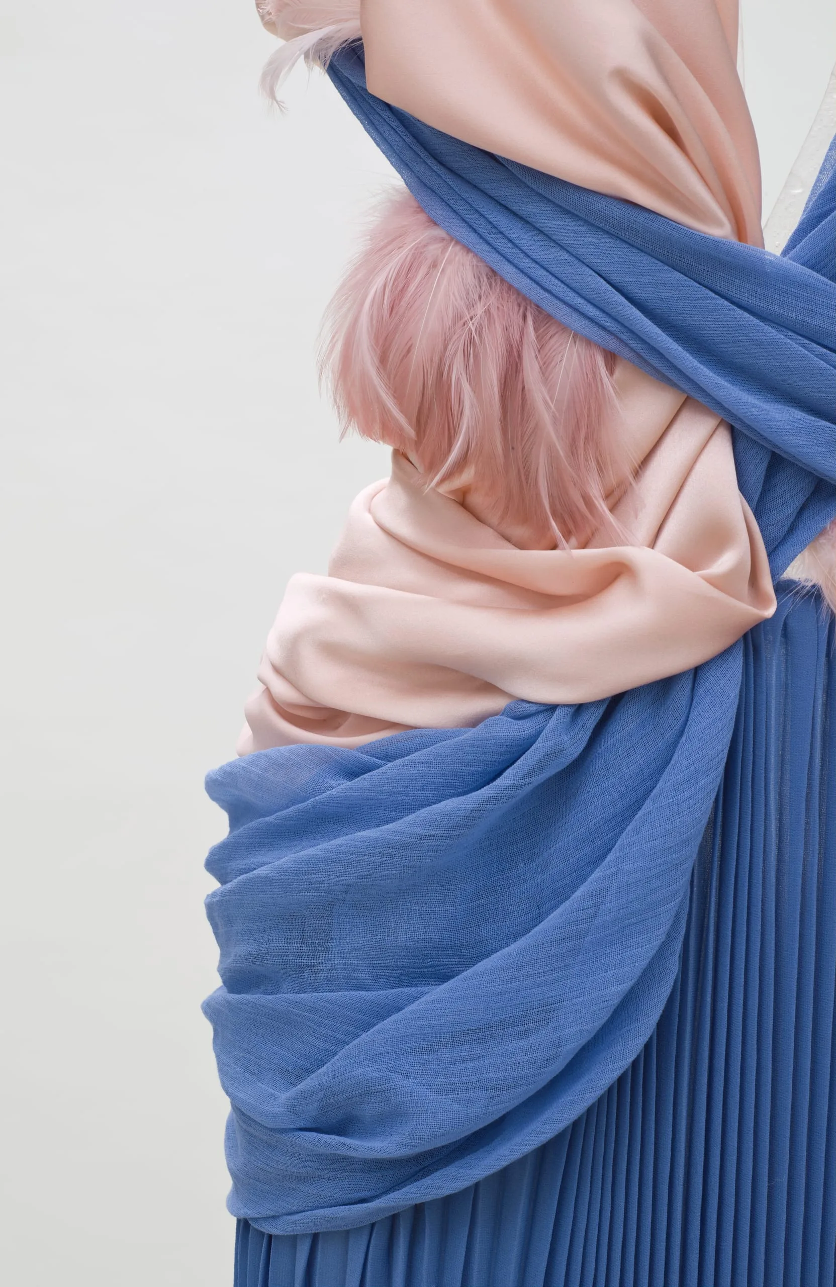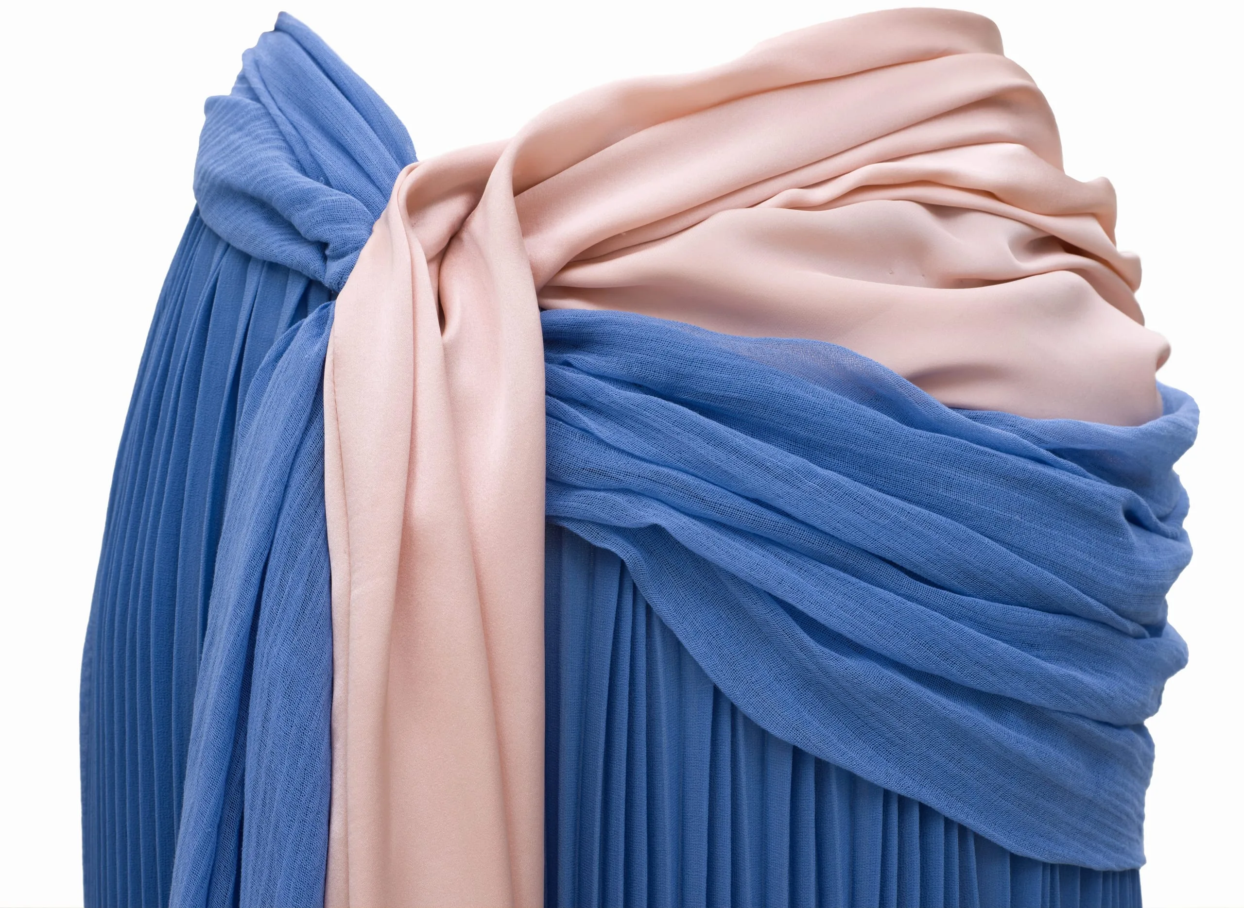 - Silk plain weave (crepe) with silk satin, cotton open plain weave, crystals and feathers