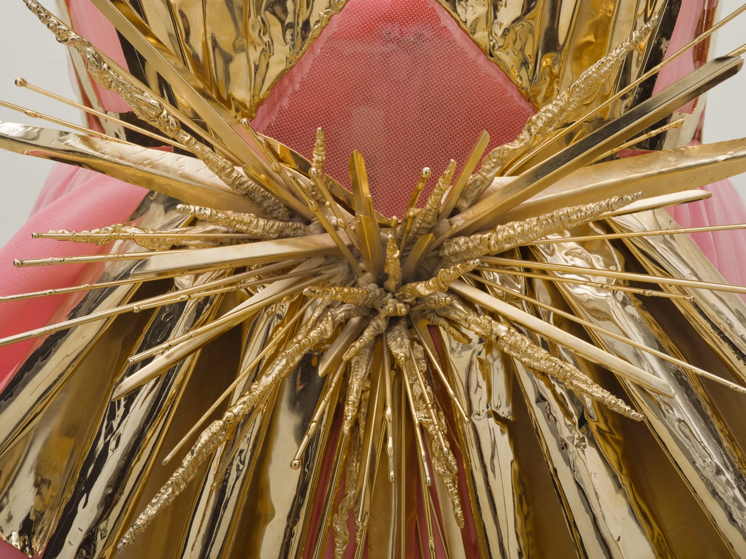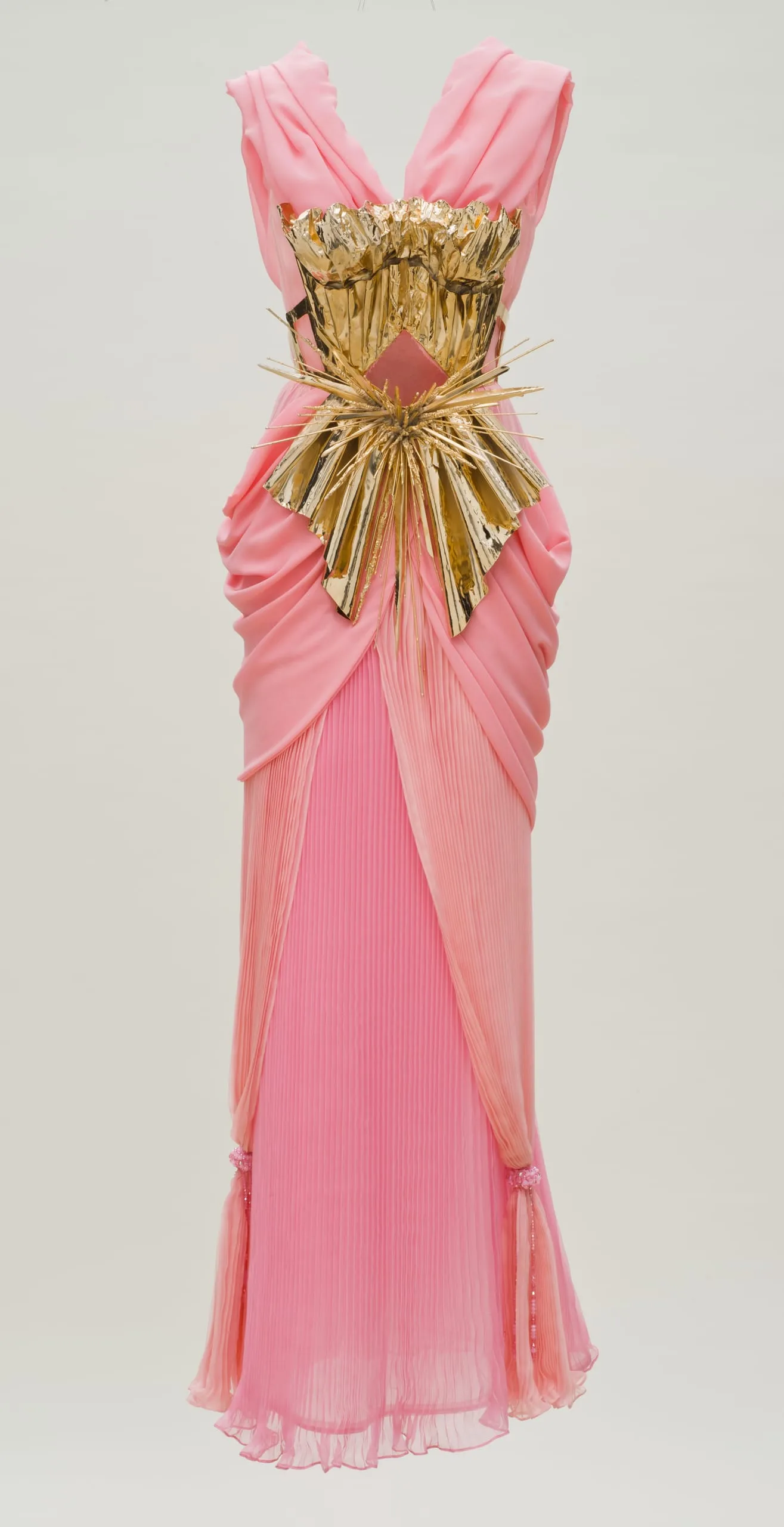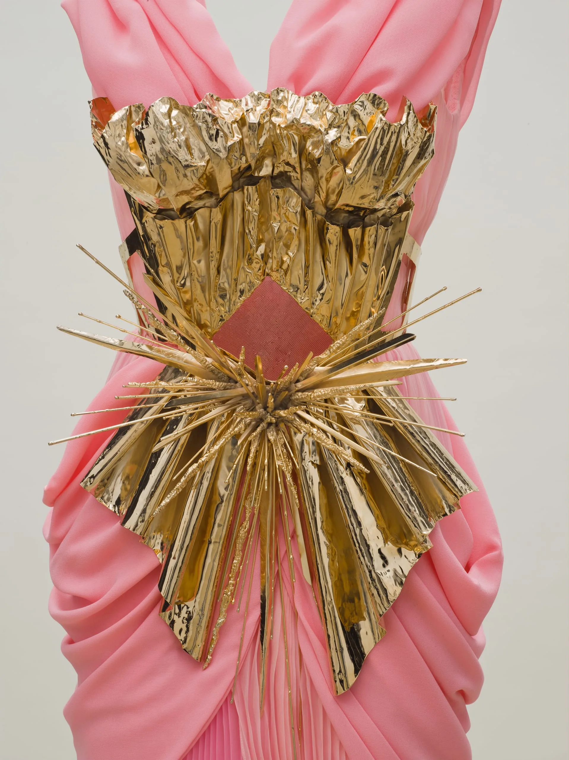 - a) Gown: 64 1/2 in. (163.83 cm) shoulder to hem; b) Breastplate: 19 1/2 x 13 x 6 3/8 in. (49.53 x 33.02 x 16.19 cm); c) Starburst: 9 1/2 x 13 1/4 x 3 1/4 in. (24.13 x 33.66 x 8.26 cm); d) Starburst: 13 5/8 x 5 x 1 1/2 in. (34.61 x 12.7 x 3.81 cm)