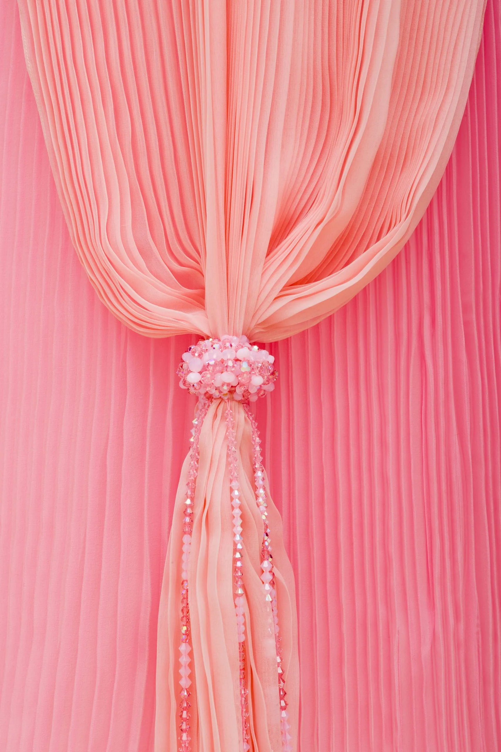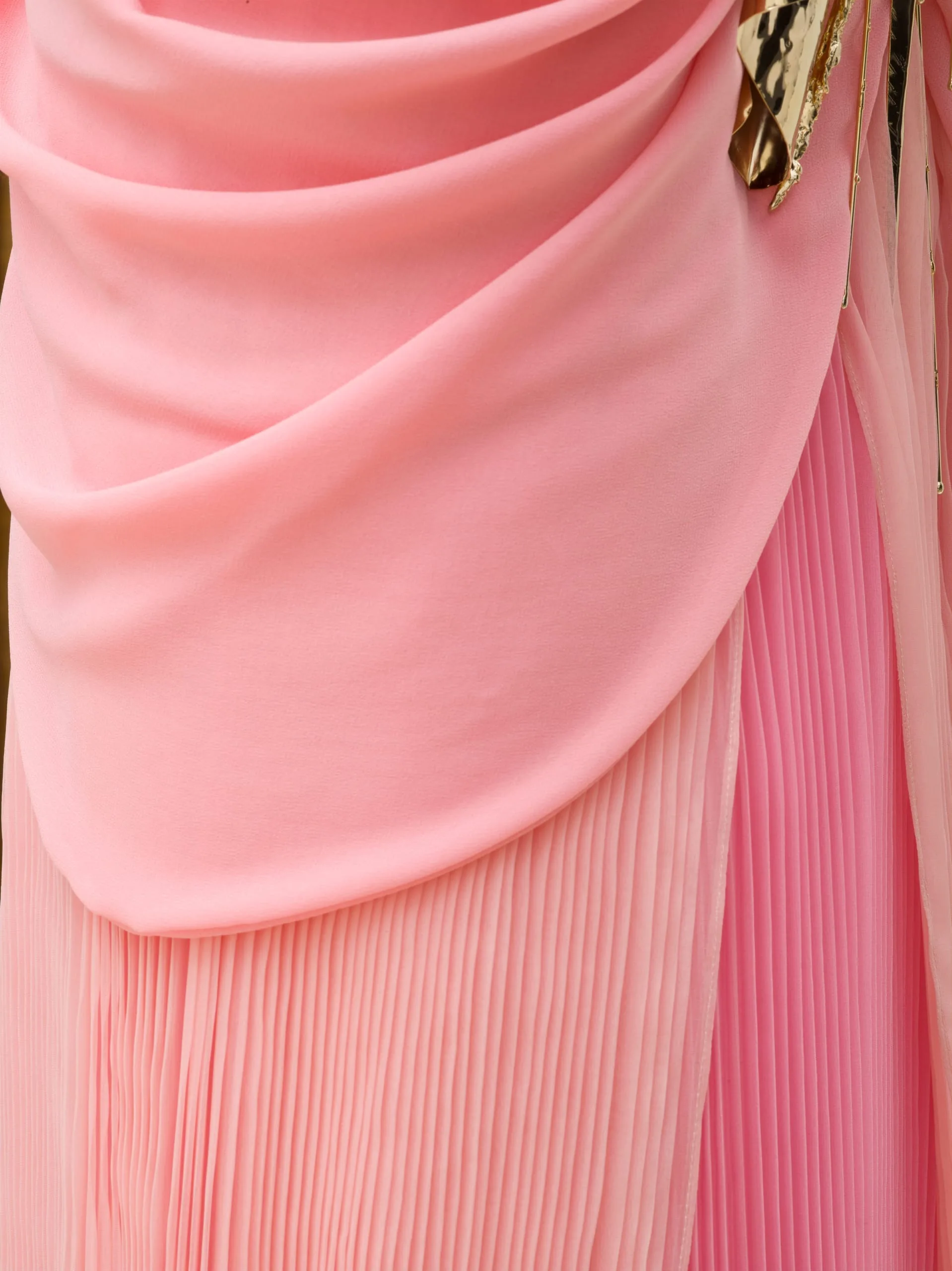 - Silk plain weave (crepe) and silk plain weave (chiffon) with crystals and net, metal with metallic plating