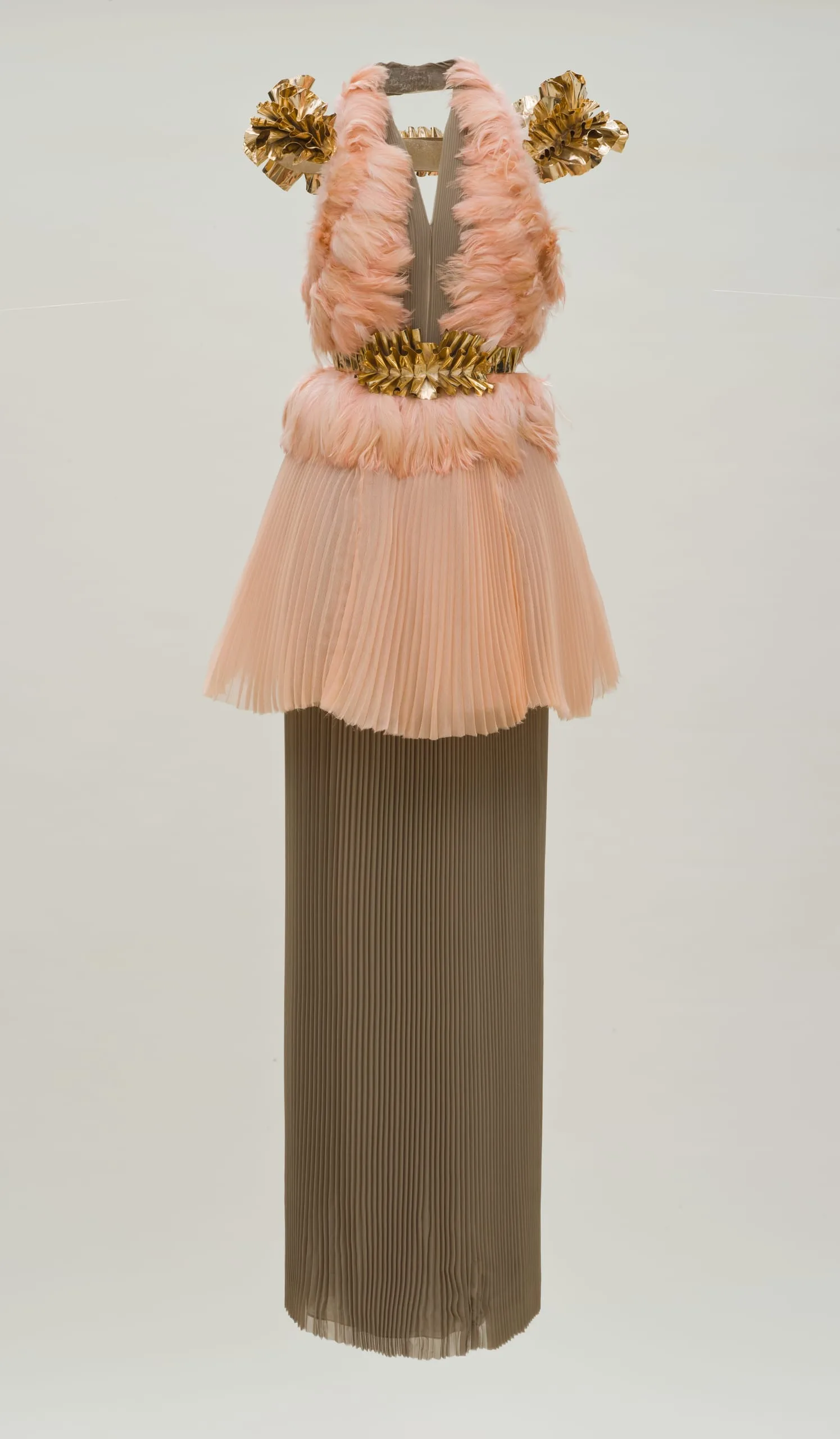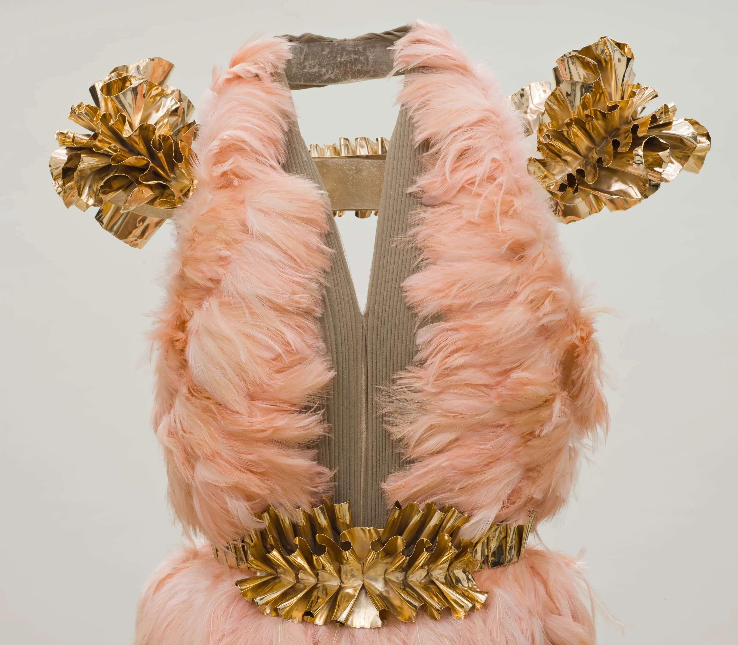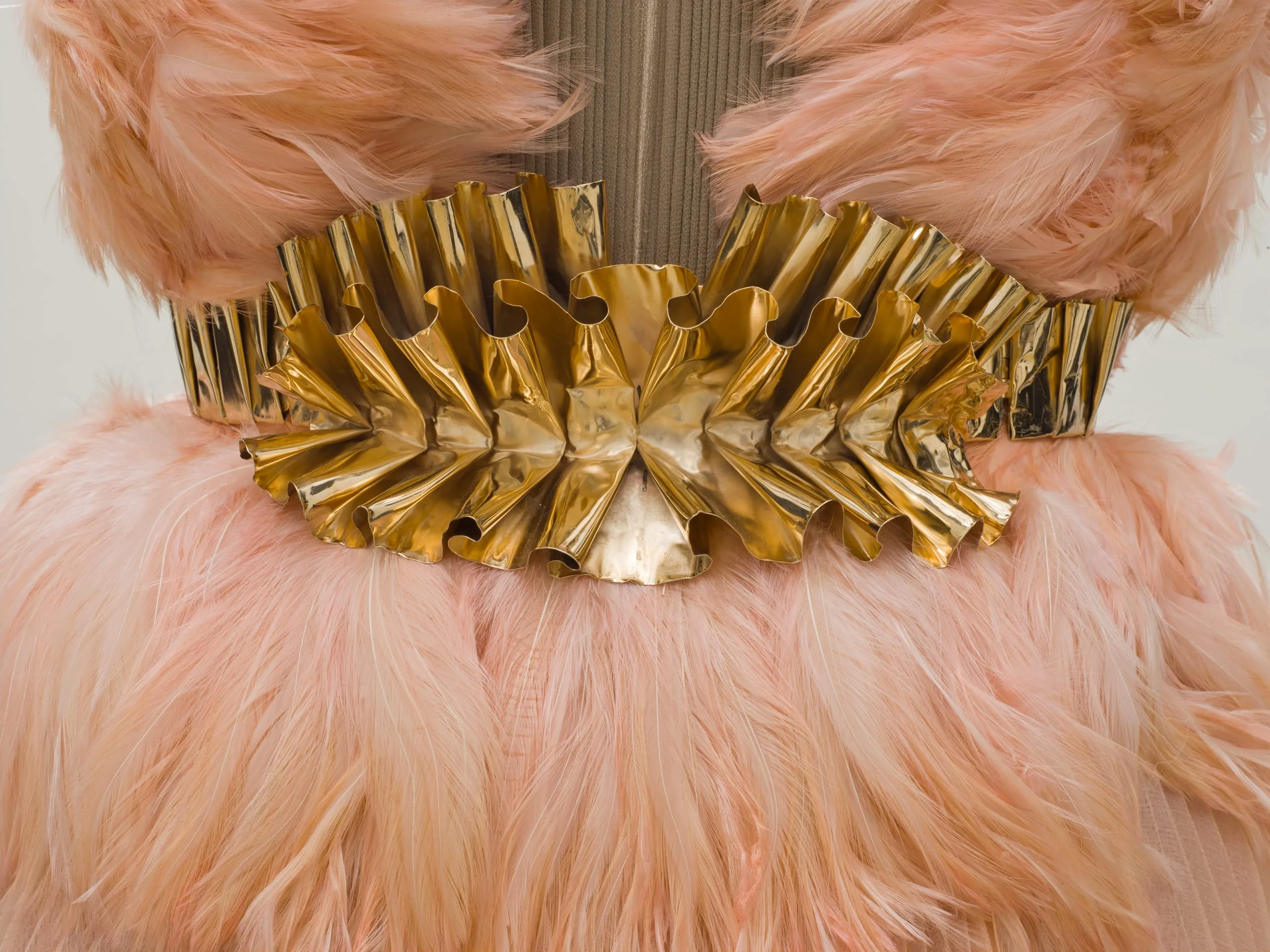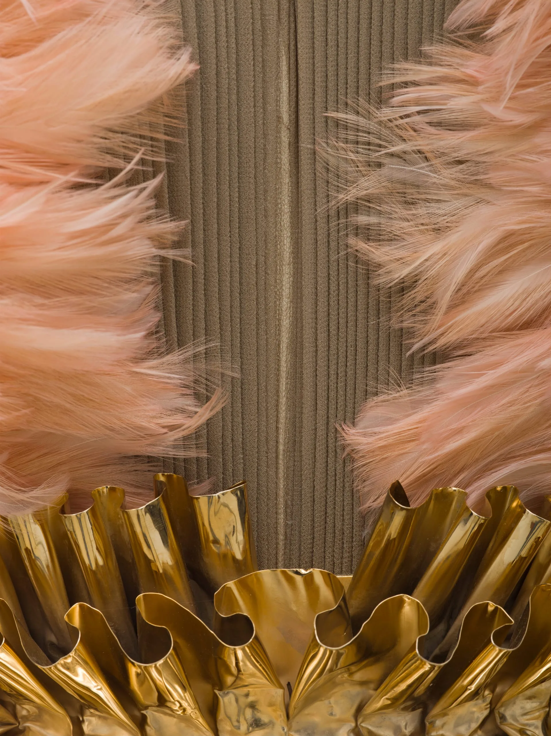 - Silk plain weave (crepe) and silk plain weave (chiffon) with feathers, metal with gold-metallic plating