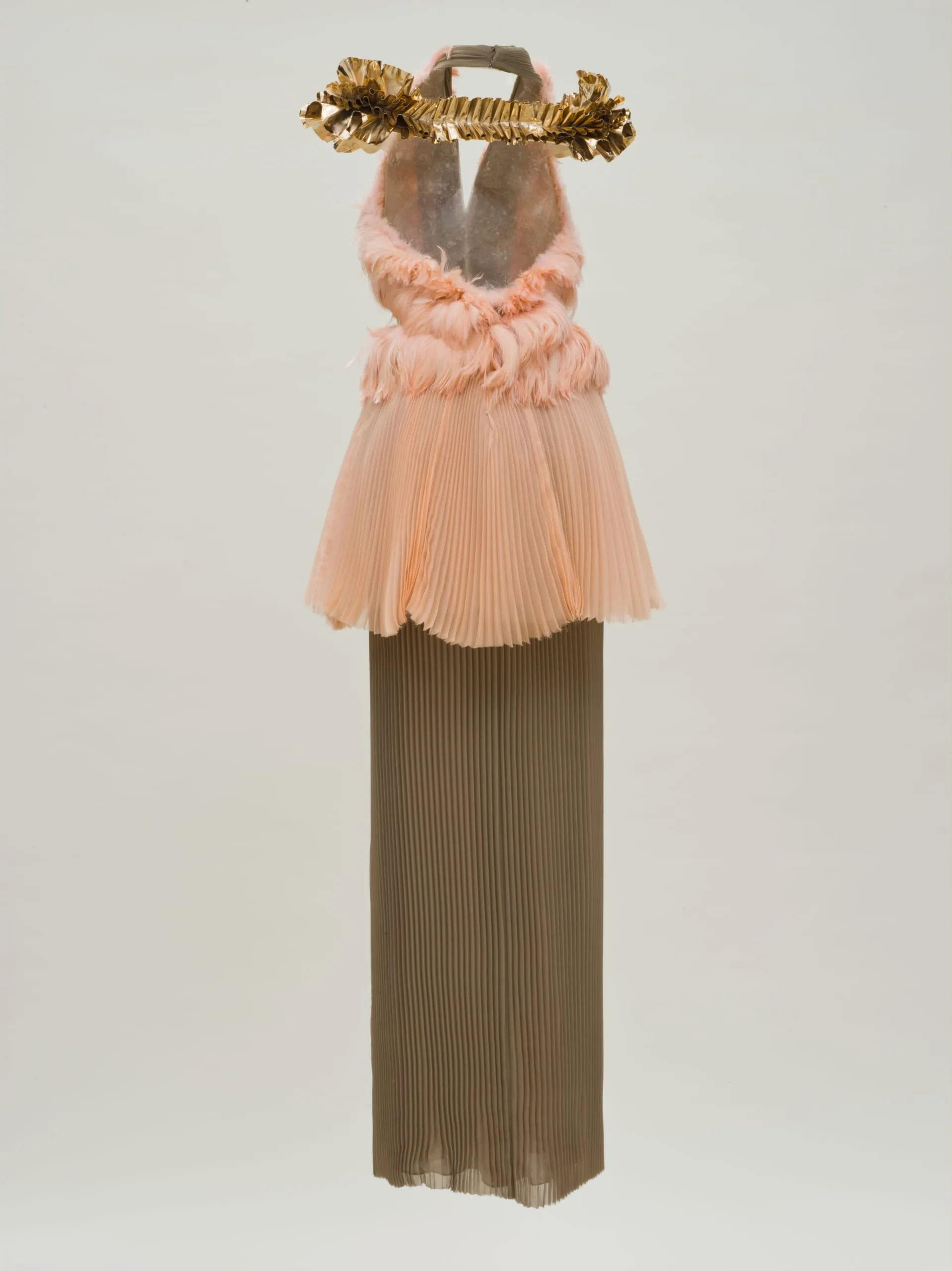 - a) Gown: 71 in. (180.34 cm) nape to hem; b) Shoulder piece: 3 1/2 x 8 x 7 1/2 in. (8.89 x 20.32 x 19.05 cm); c) Belt: 5 x 19 x 8 1/2 in. (12.7 x 48.26 x 21.59 cm)