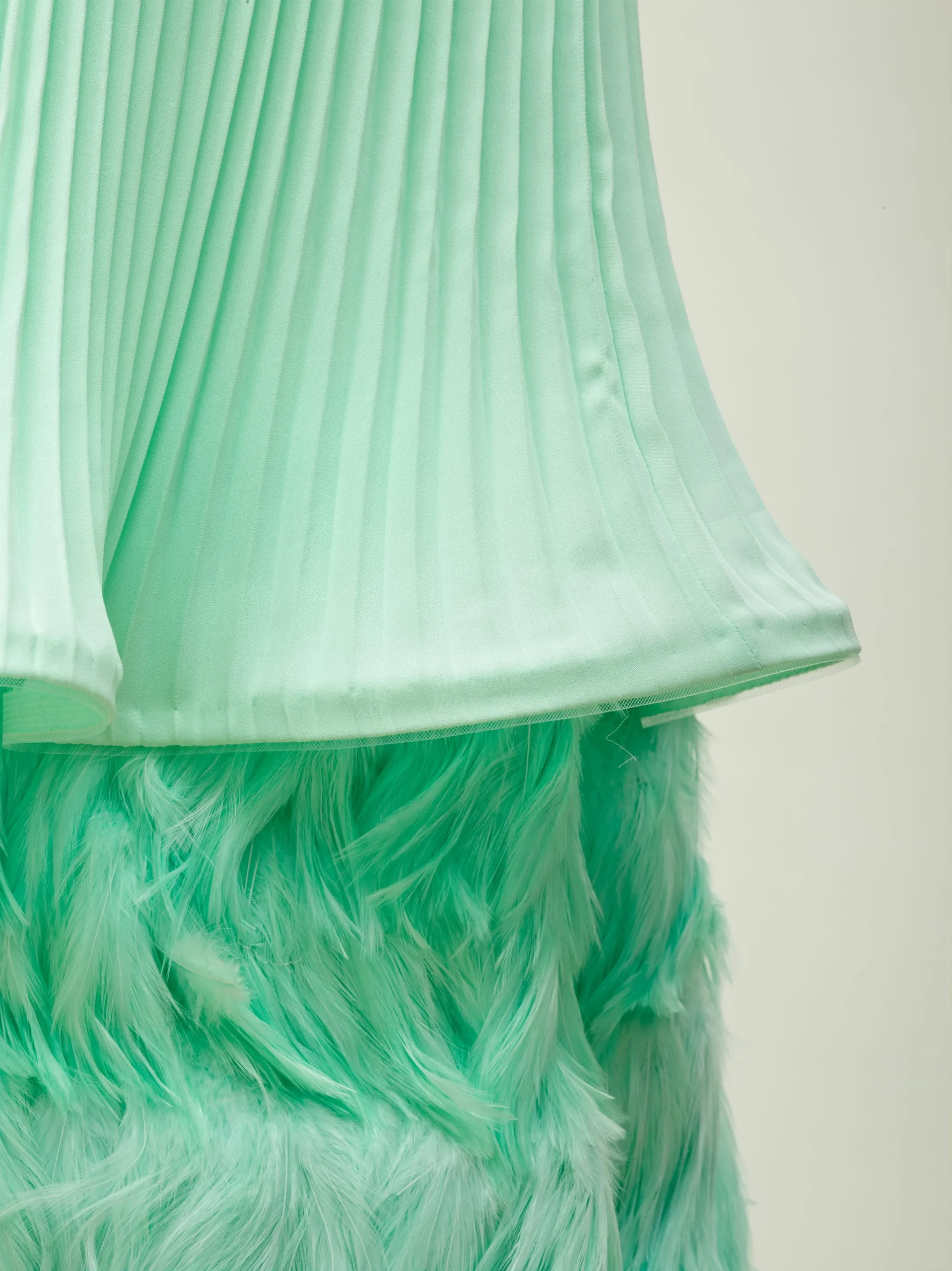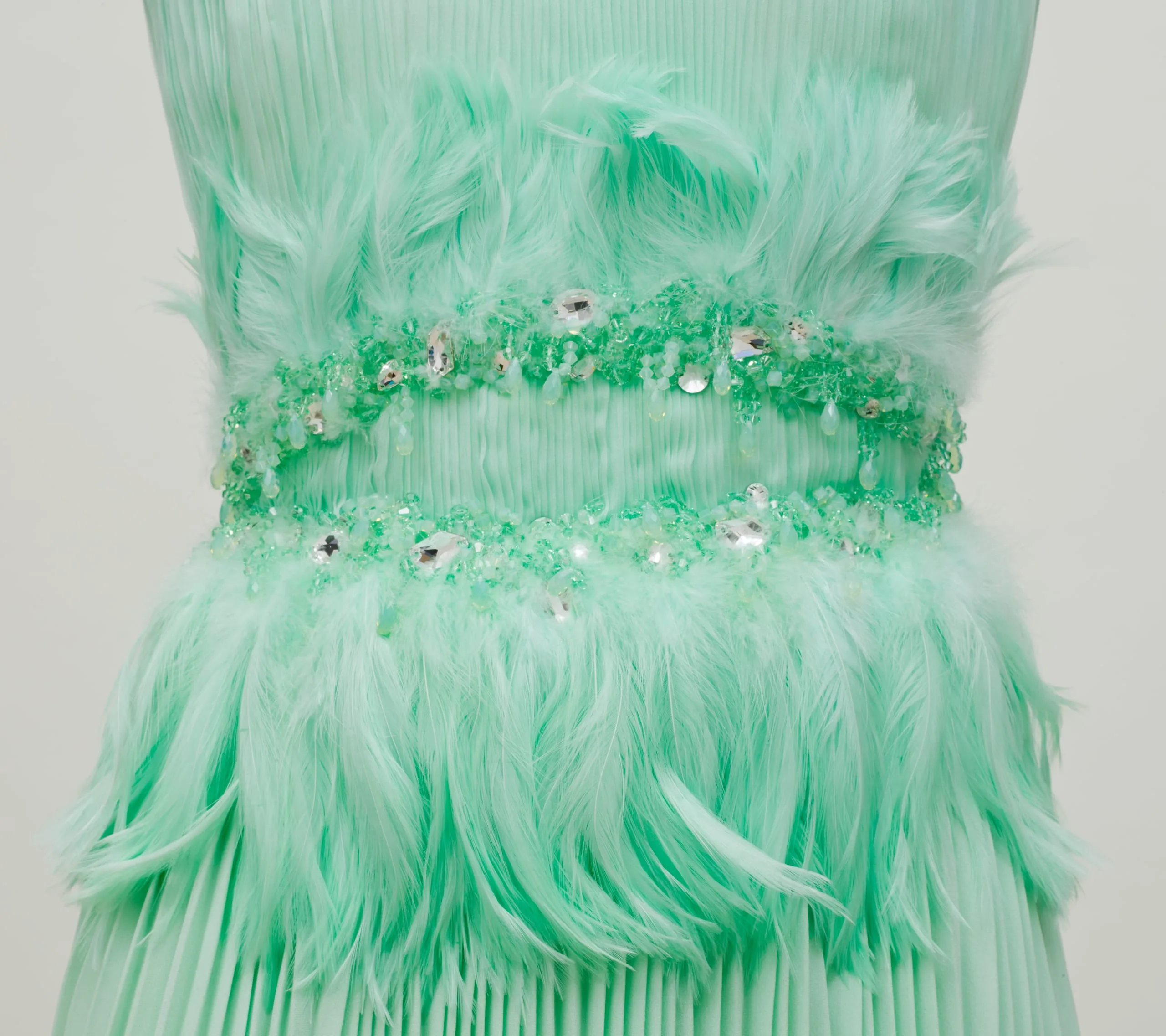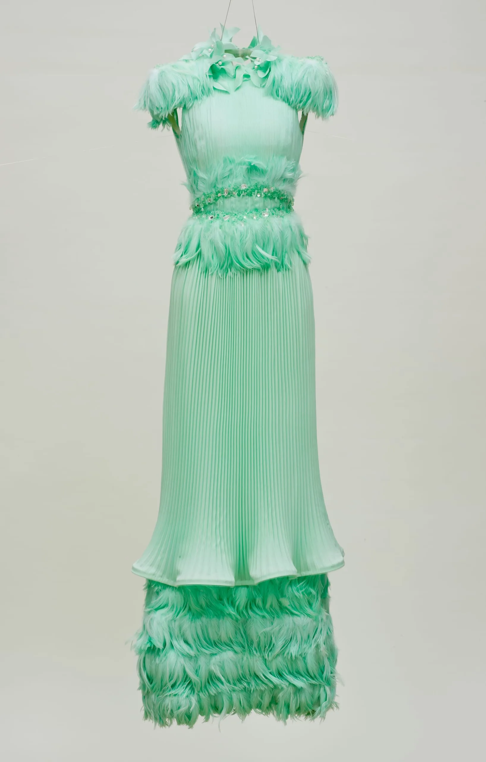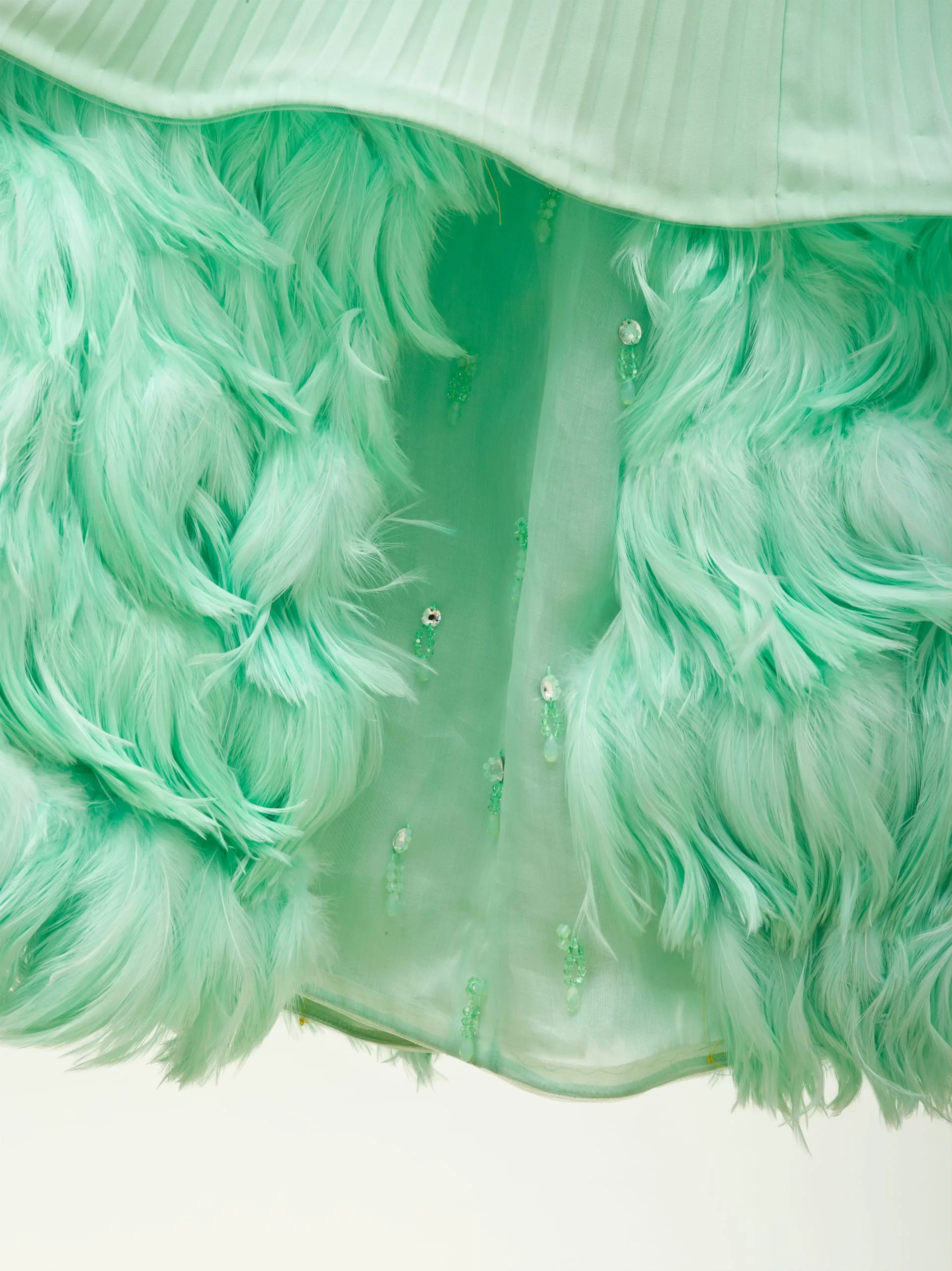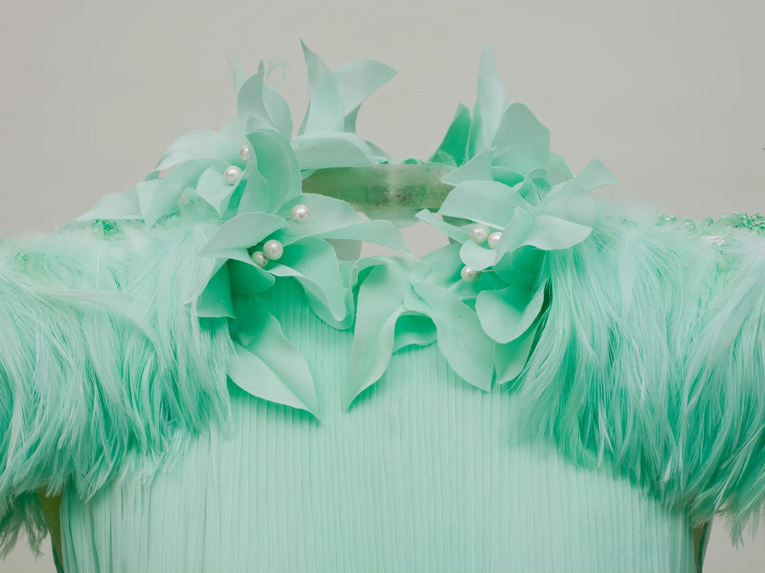- Silk chiffon with feathers, crystals, and silk flowers with pearl beads