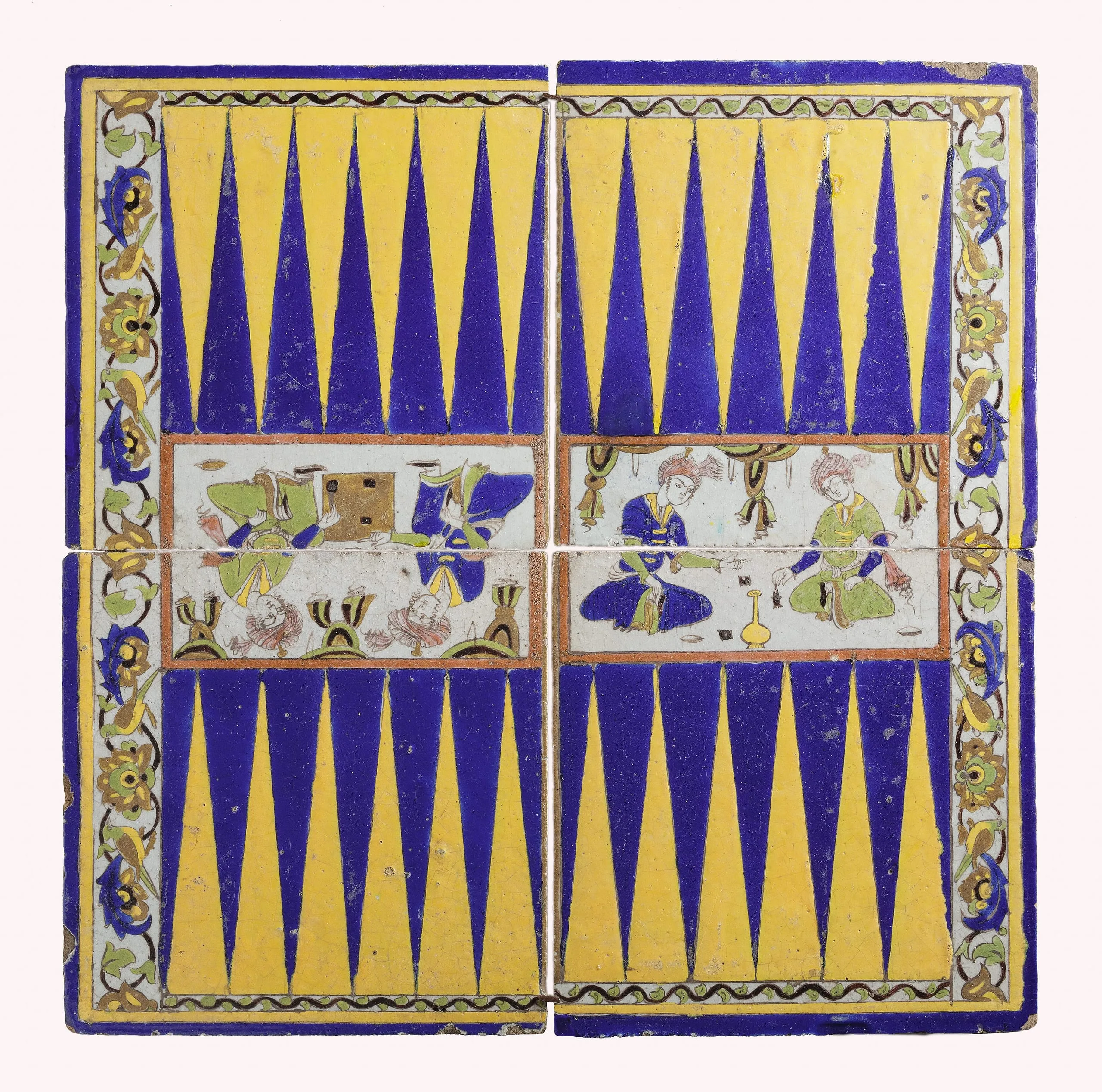 According to the Persian poet Firdawsi in his epic poem the Shahnama, chess was introduced to Iran from India in the sixth century by an envoy of the rajah, who threatened to cease paying tribute unless the Persians could solve the riddle of the chessboard and its pieces. Buzurgmihr, the shah’s vizier, or minister, recognized that chess was a game of war fought by symbolic armies; he invented the game of backgammon, or nard, as a reciprocal test of skill. In this charming and unusual backgammon board, which once may have served as floor tiles, tiny figures are shown seated on the ground, two of them playing a board game.