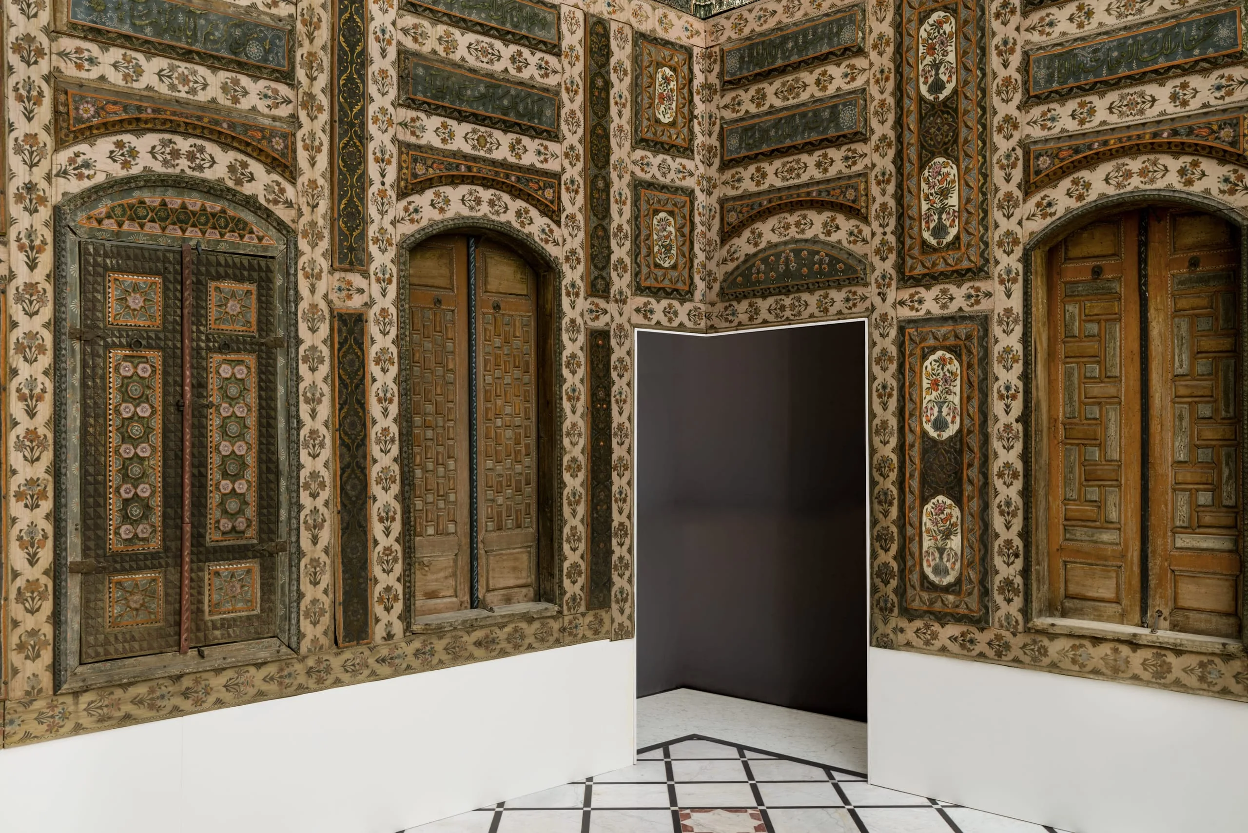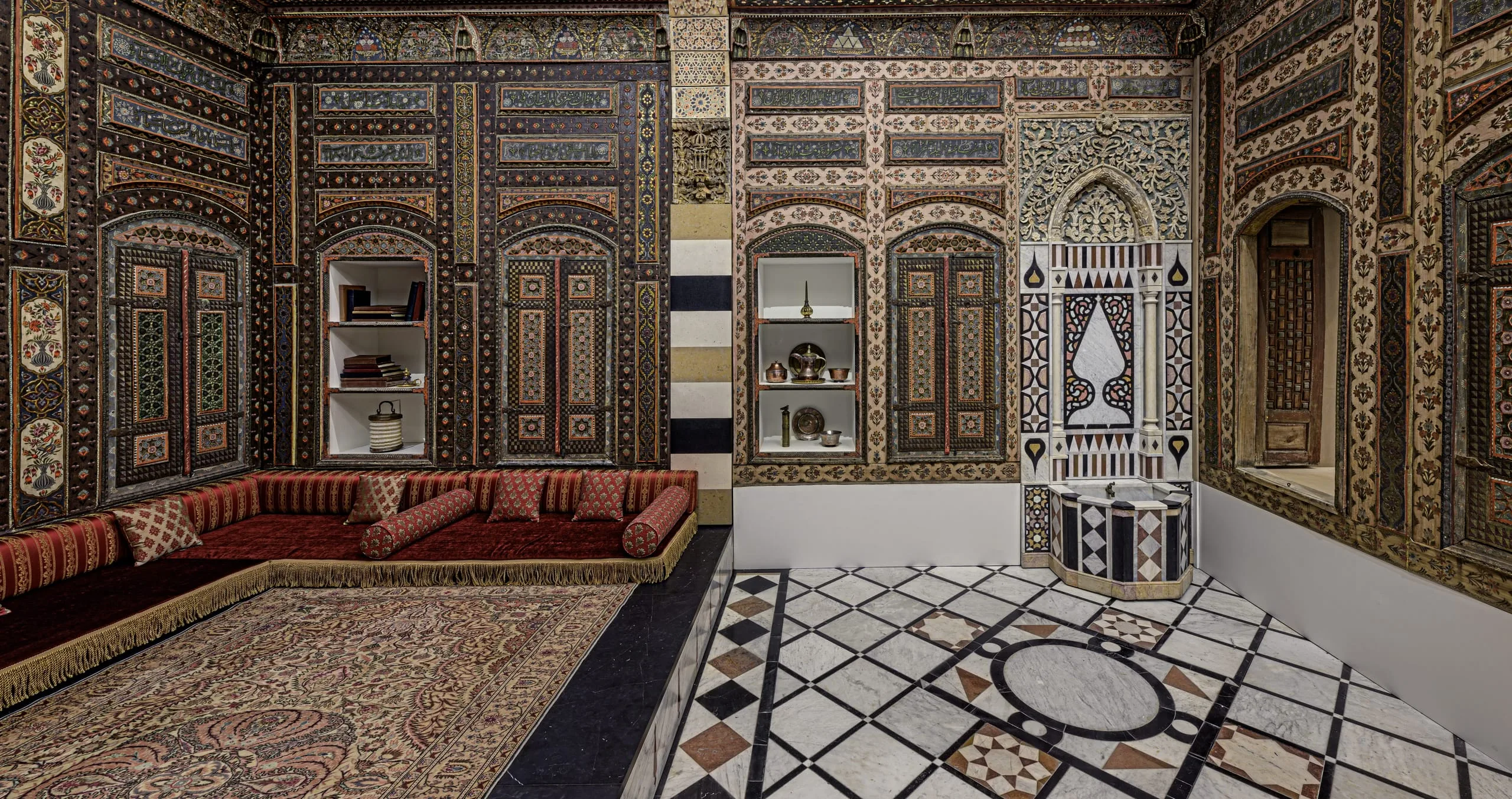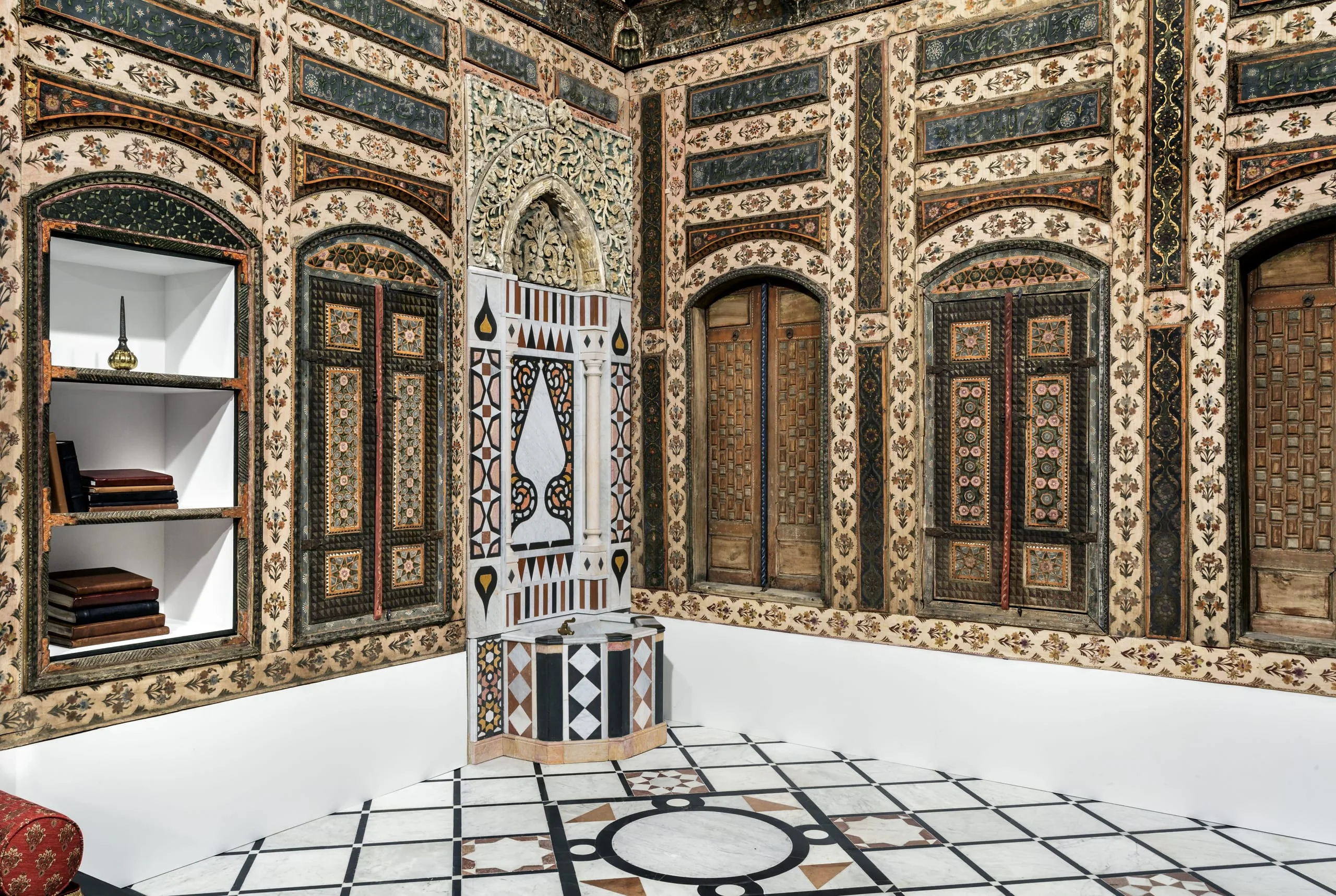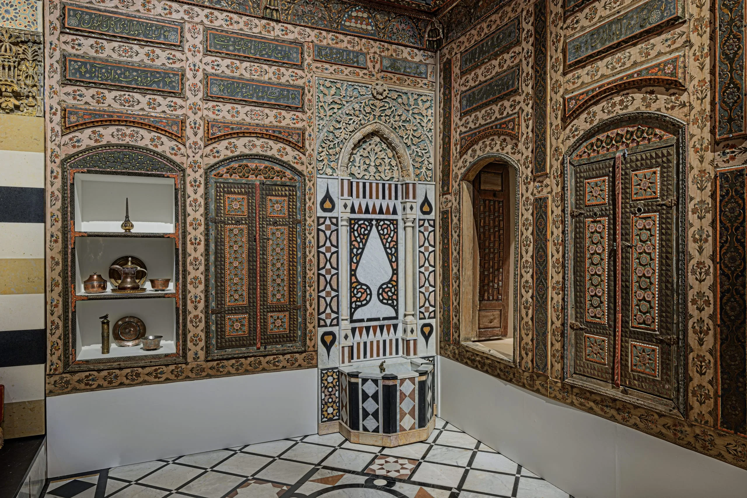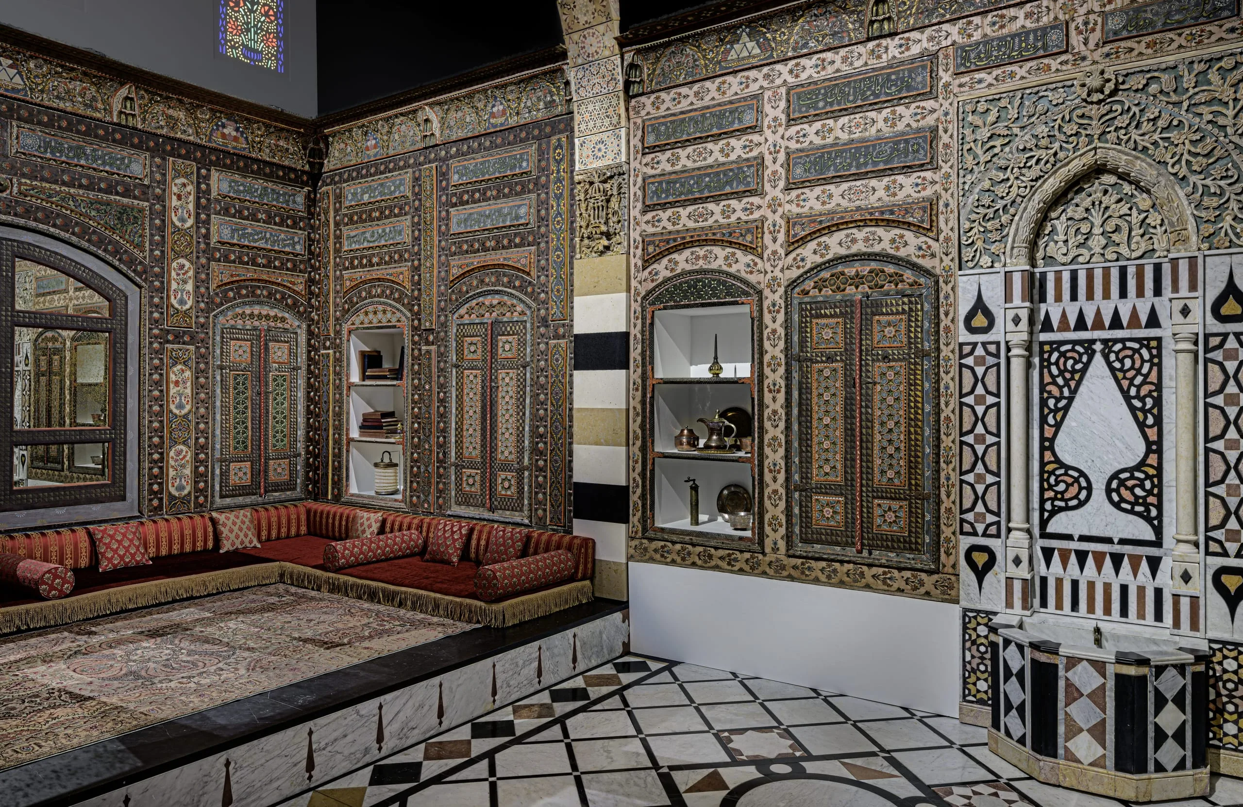 In 2014 the Los Angeles County Museum of Art acquired this Damascus room dated AD 1766–67 / AH 1180, which had been dismantled intact from a courtyard home in the al-Bahsa quarter that was torn down in 1978 to make way for a road. The room has colorful stone floors, painted and carved wood walls, elaborate cupboard doors and storage niches, and an intricately inlaid stone wall fountain with a carved and glazed ceramic hood. The room was largely in its original state, with one of the best-preserved painted surfaces of any similar room of the period but covered with layers of dirt and grime. Brilliant pinks, oranges, blues, and greens have now been revealed in the conserved and reintegrated room.