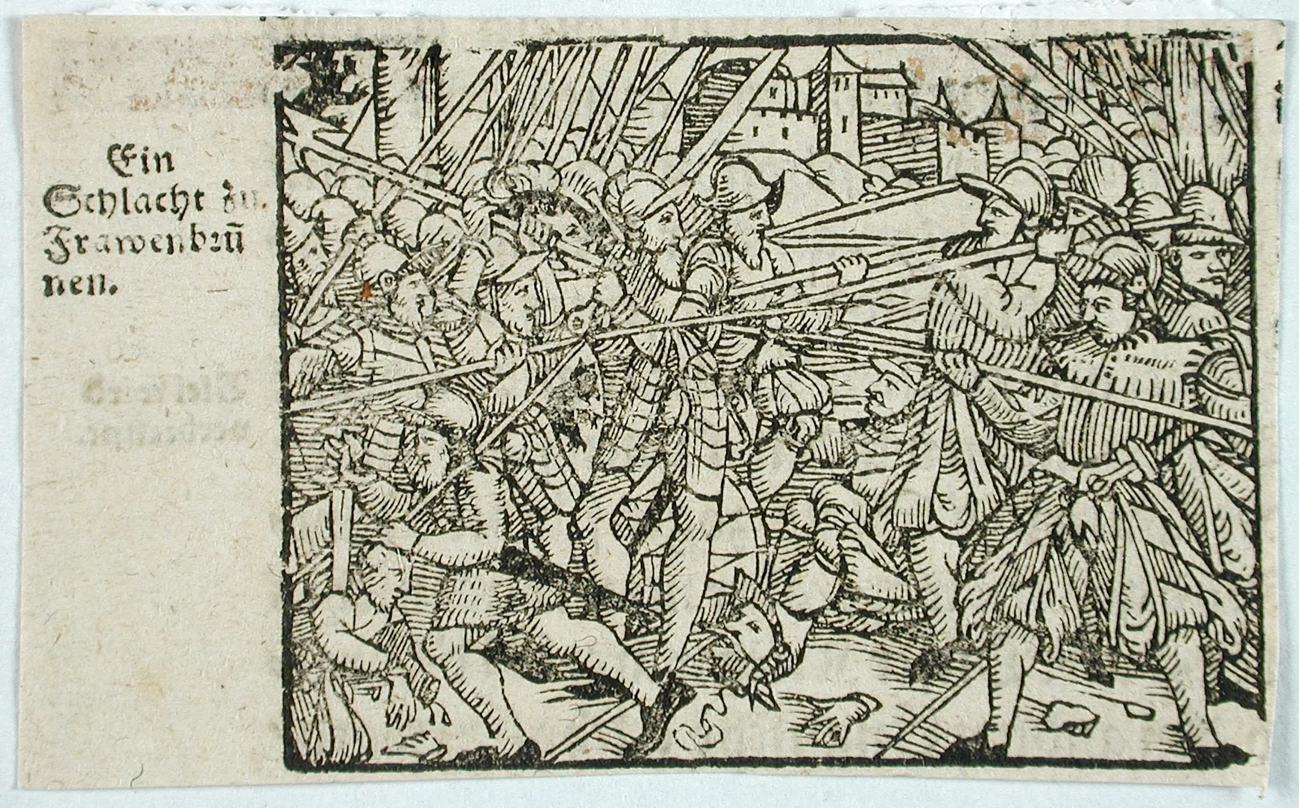 Woodcut print of a dense battle scene with armored soldiers wielding crossed pikes, a fallen figure at lower center, and a fortified tower visible in the distance