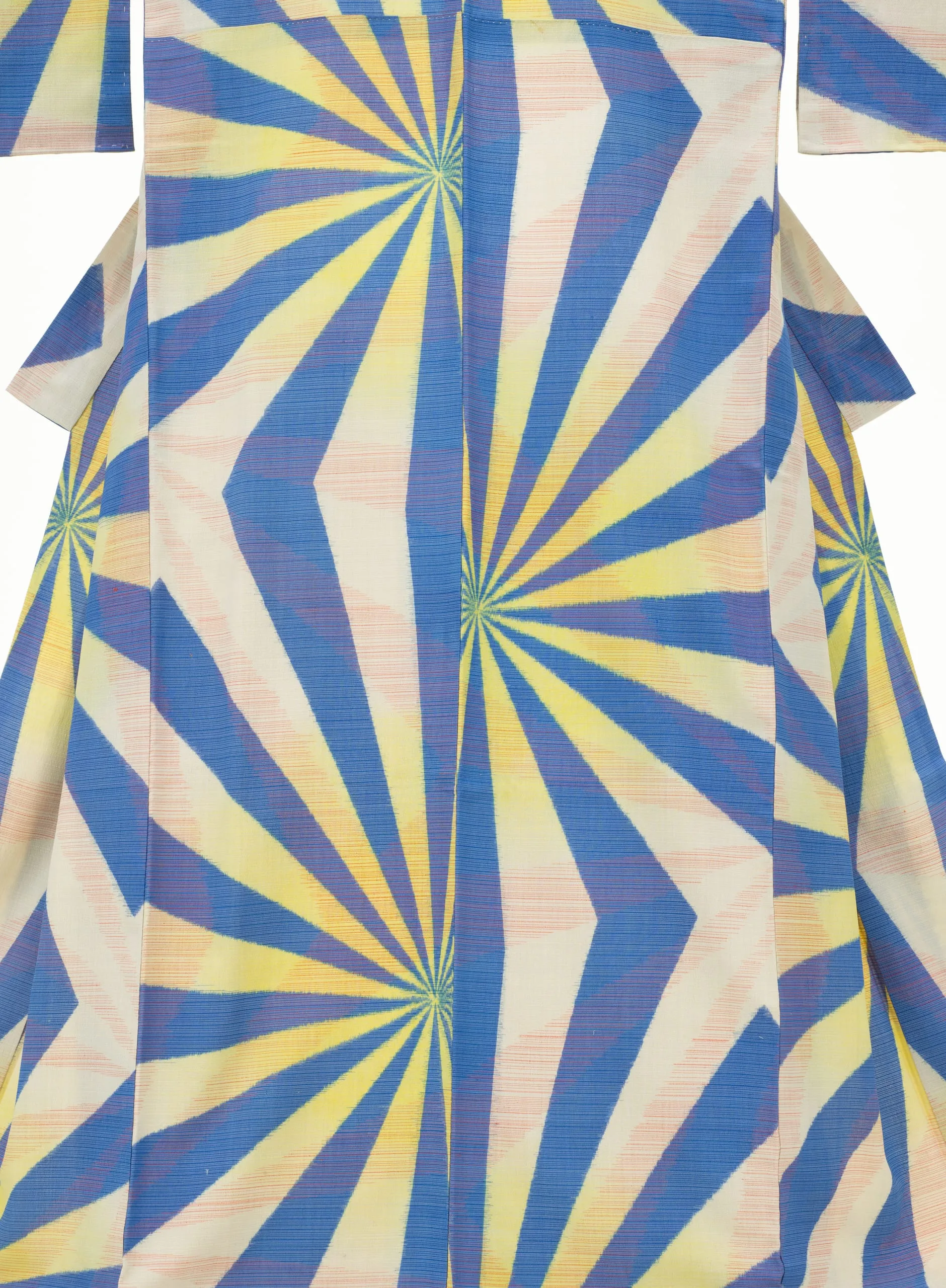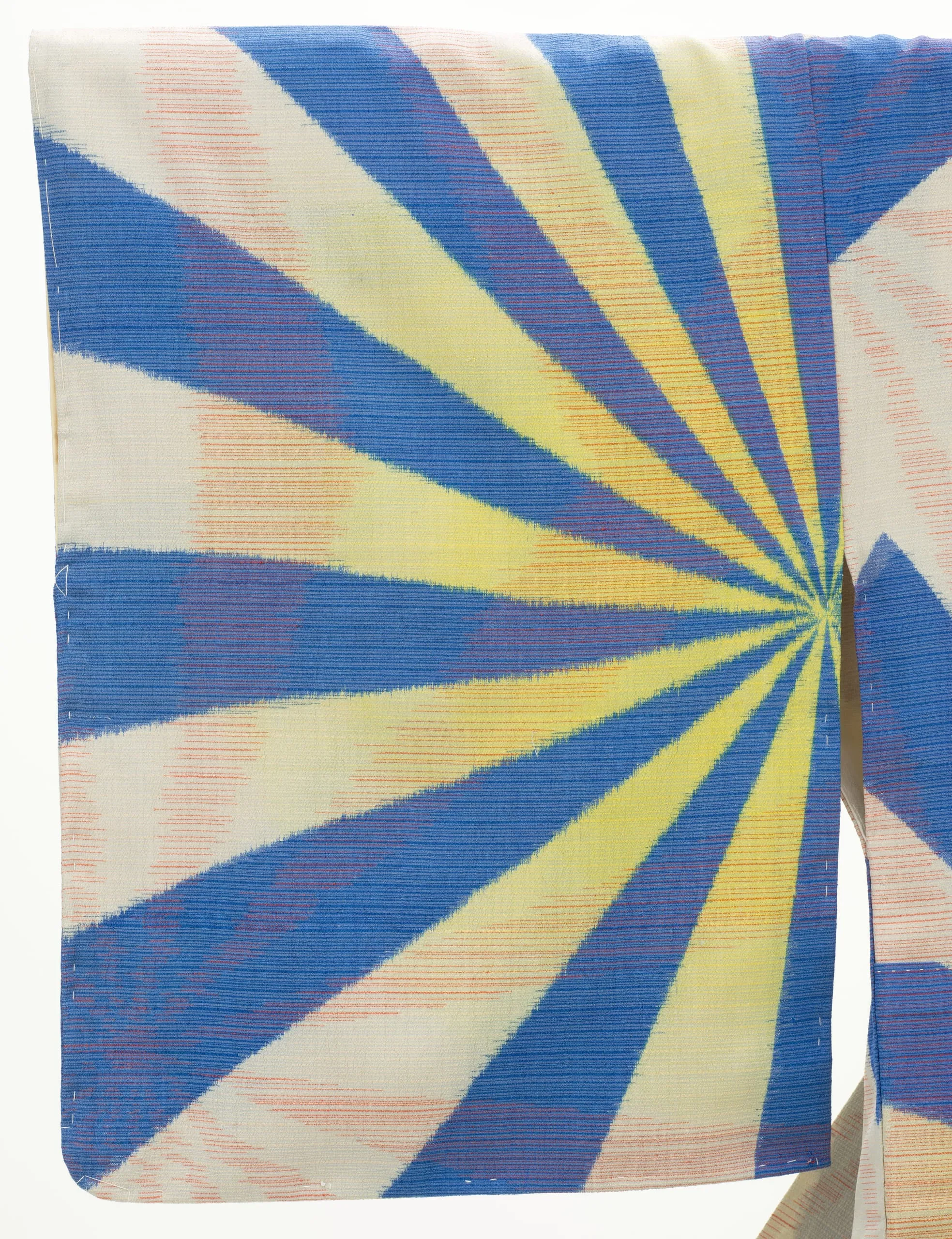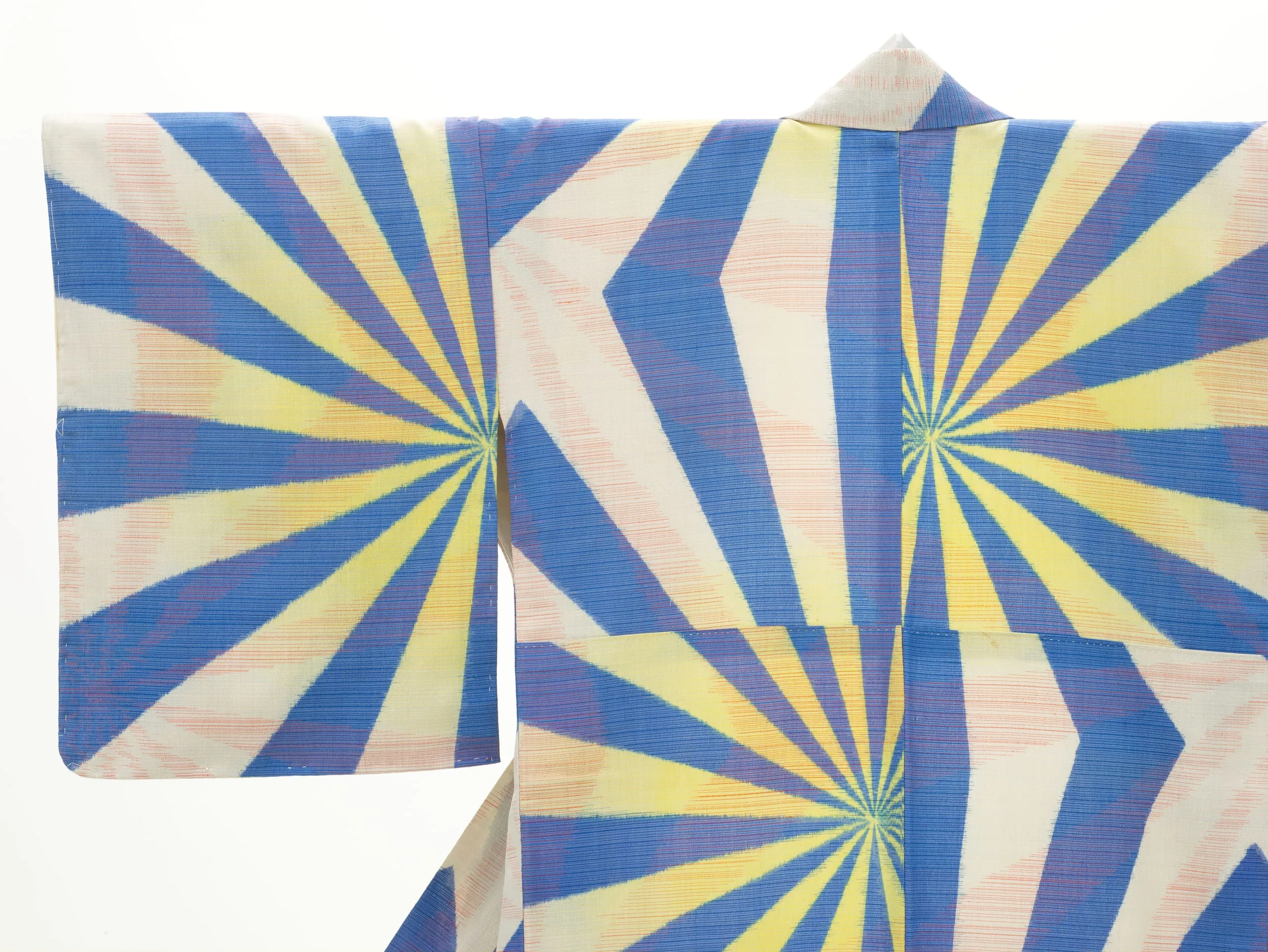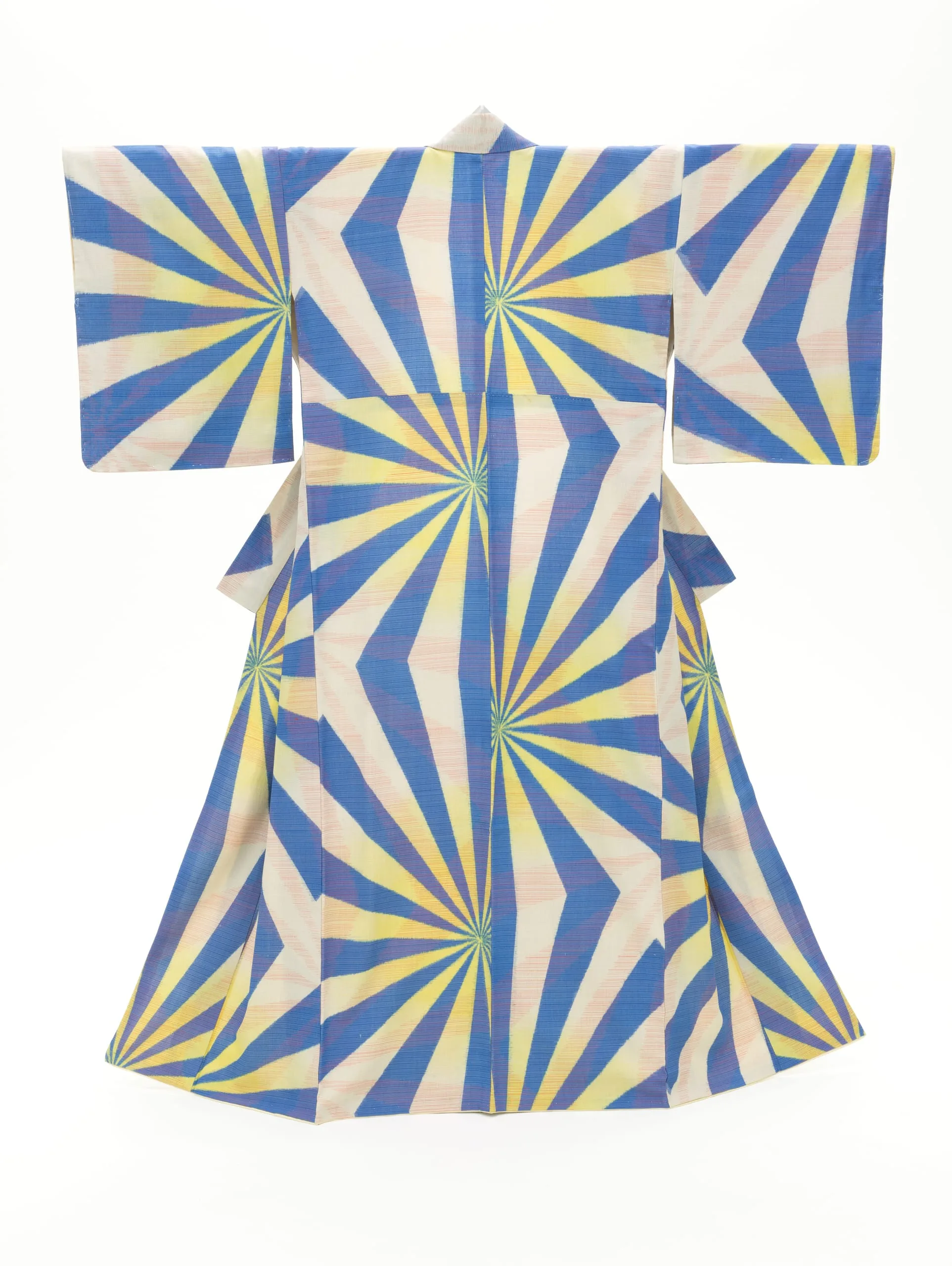- Silk and rayon plain weave (crepe; chirimen omeshi), stencil-printed warp and weft ikat (heiyō kasuri meisen), and tie-resist dyed wefts (yoko-gasuri)