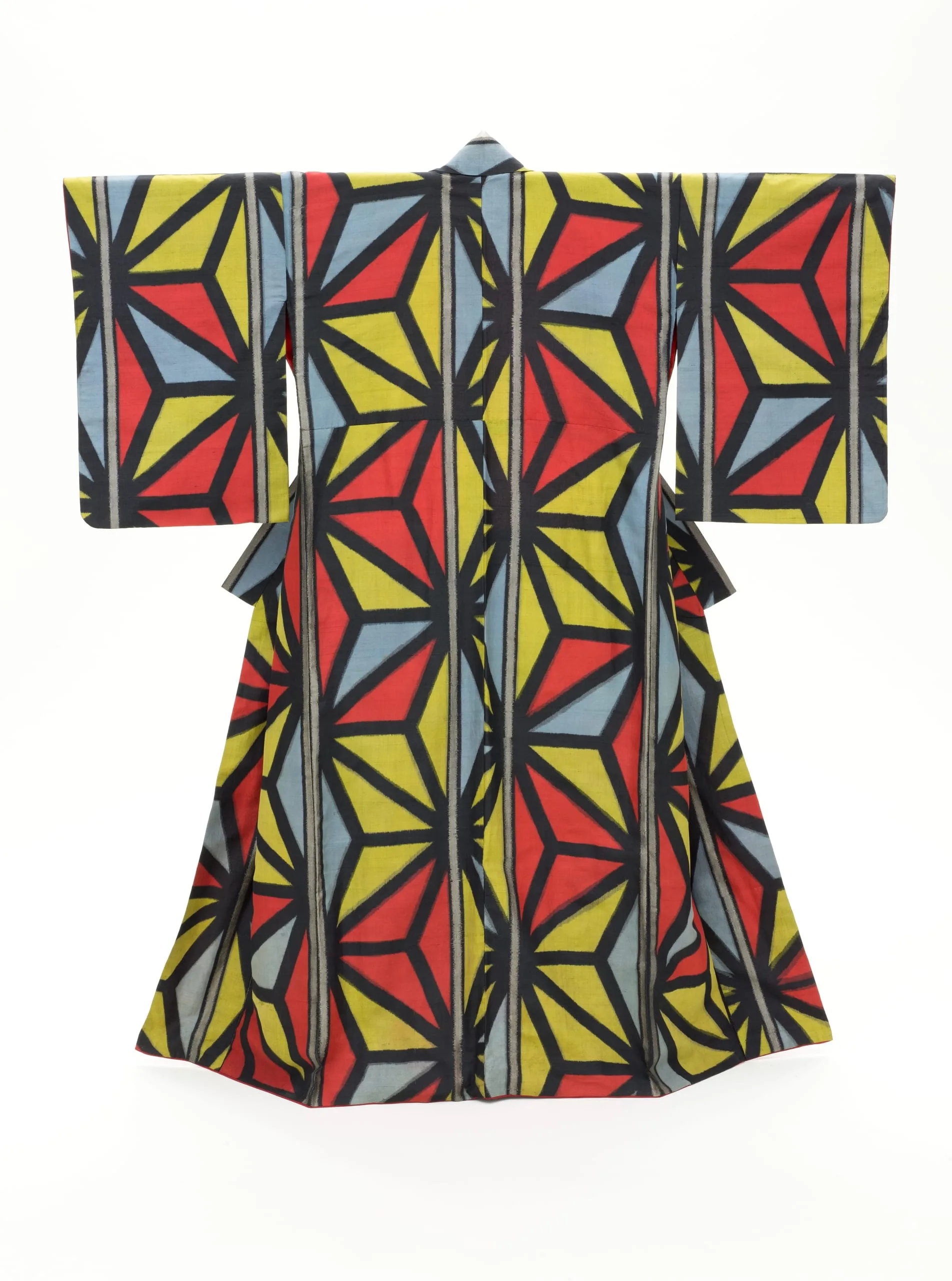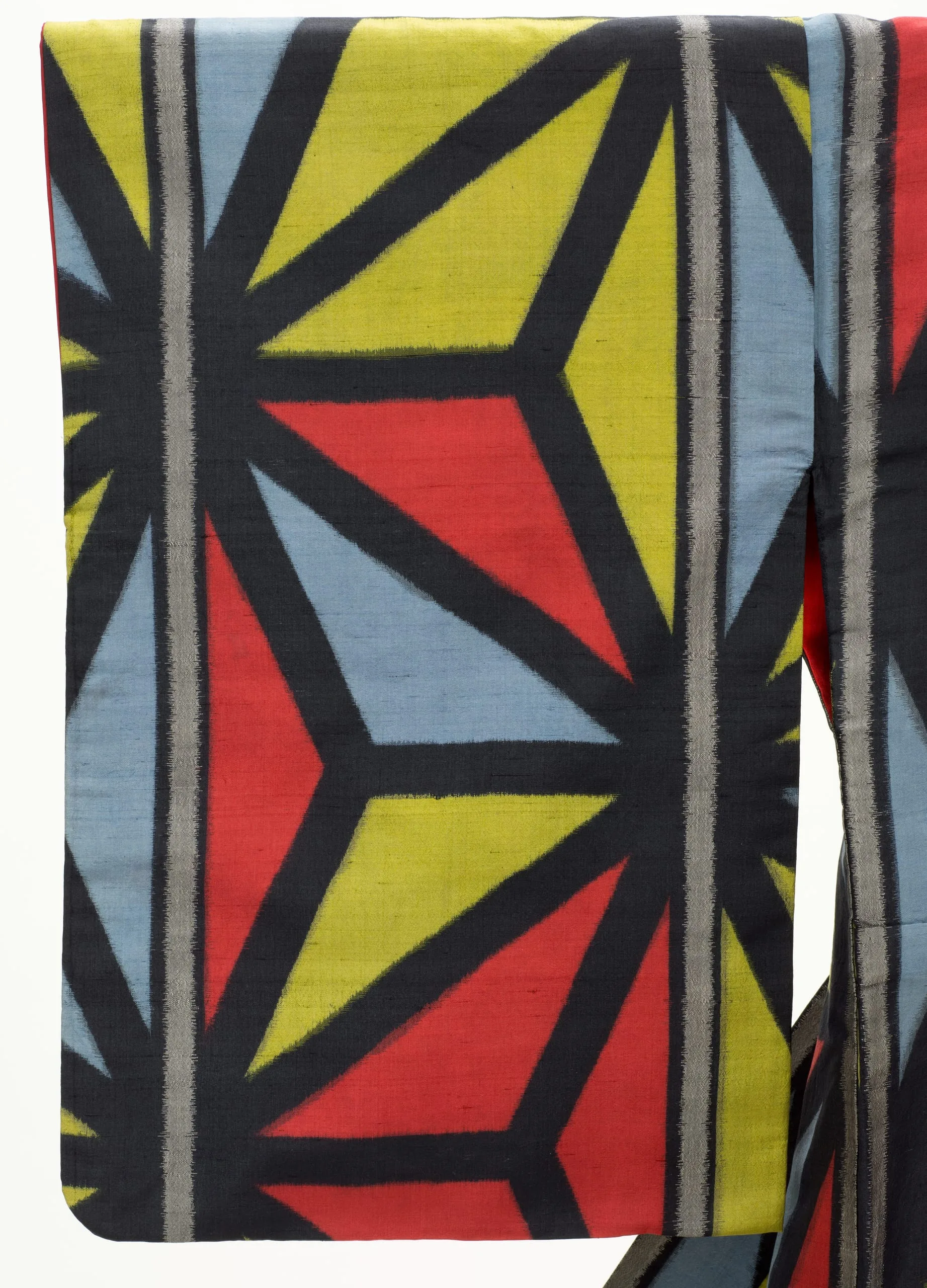 - Silk plain weave, stencil-printed warp and weft ikat (heiyō kasuri meisen)