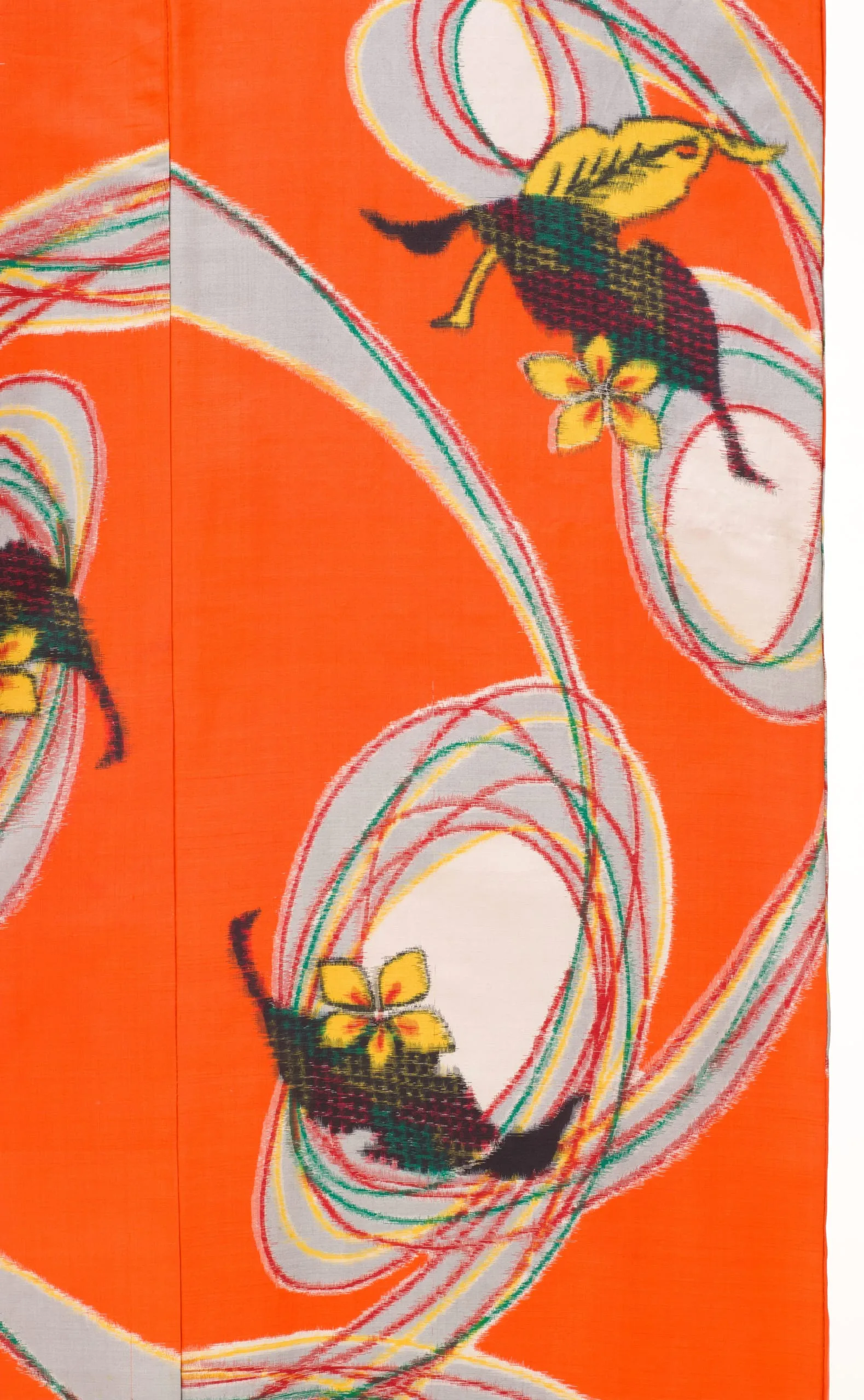 - Silk plain weave, stencil-printed warp and weft (heiyō-gasuri meisen)