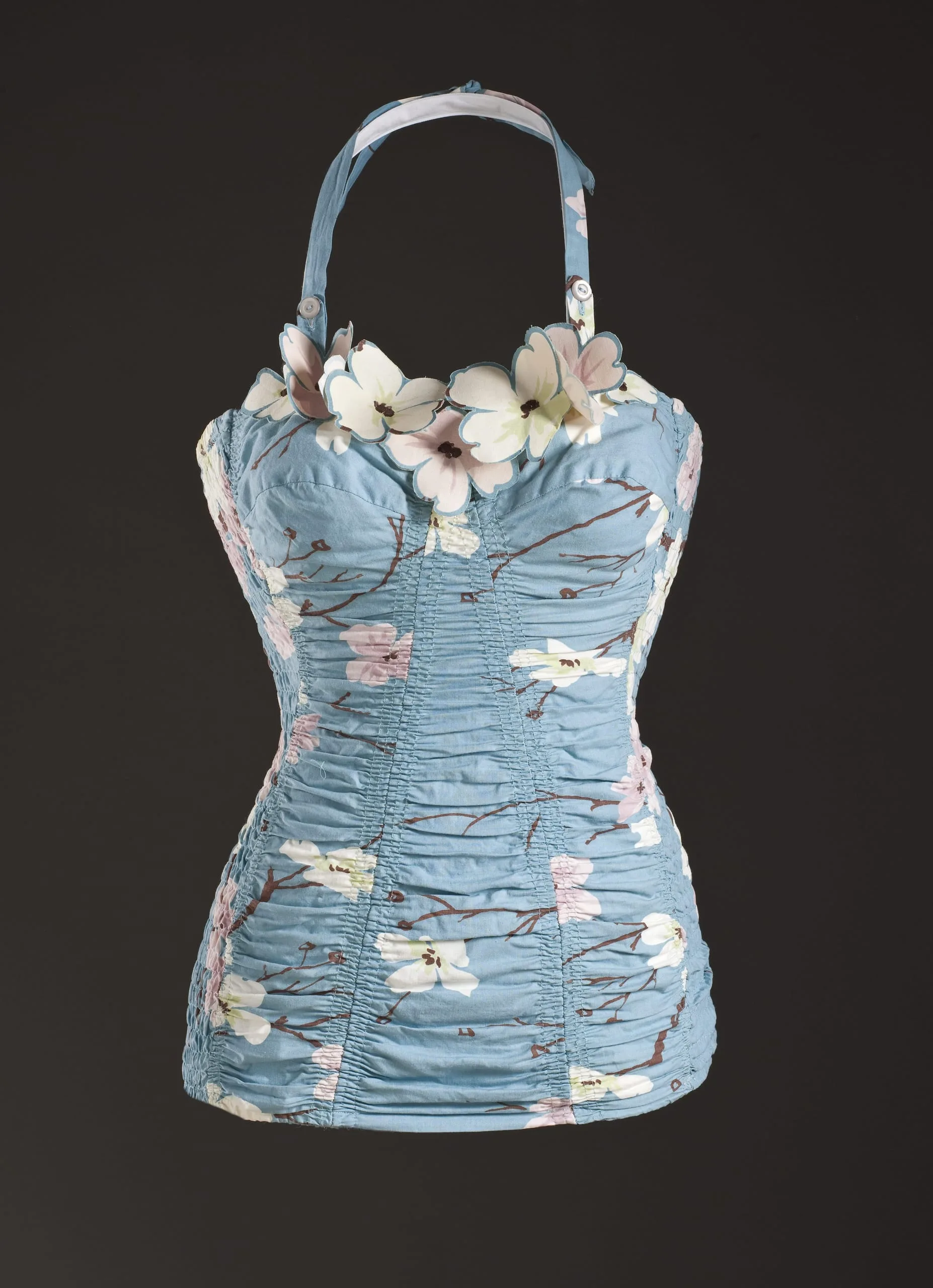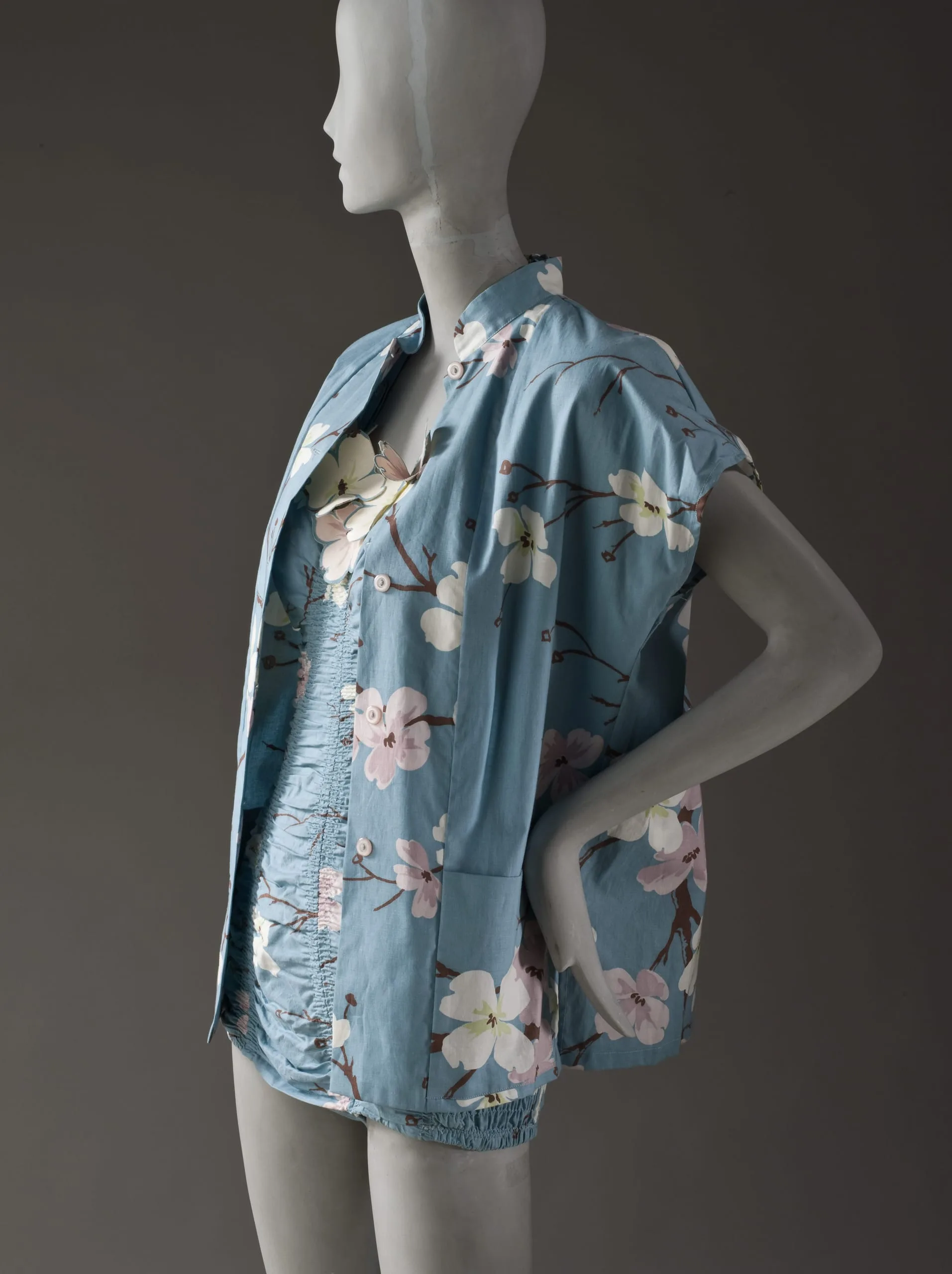 One of California’s most influential contributions to American fashion was the “playclothes” ensemble—consisting of any combination of bathing suit, skirt, shorts, pants, and top of the same fabric to mix and match to fit the occasion. This outfit by Mary Ann DeWeese could be worn as a bathing suit, or, with the addition of the skirt and jacket, for cocktails by the pool, attesting to the flexibility and versatility that was such an important aspect of California design at mid-century.