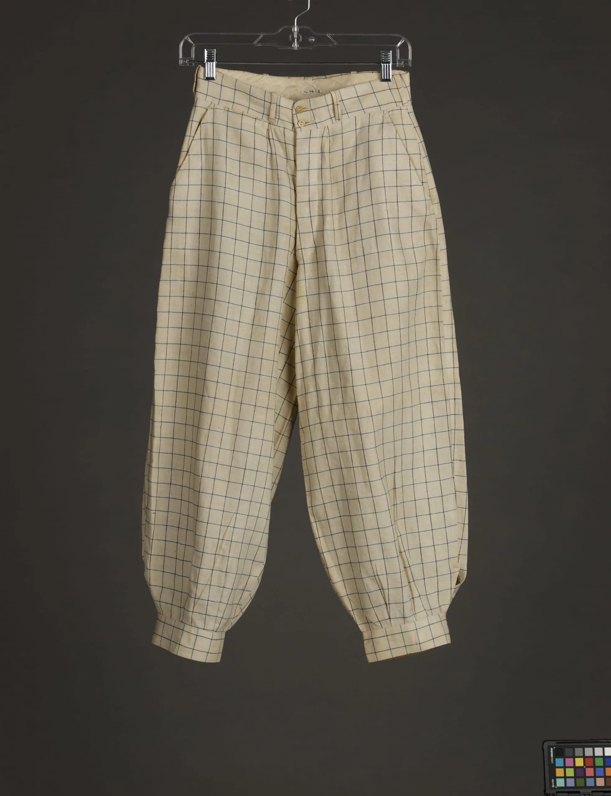 Cream-colored windowpane plaid knickerbockers or plus-fours displayed on a hanger, with a full leg silhouette gathered into fitted cuffs at the knee